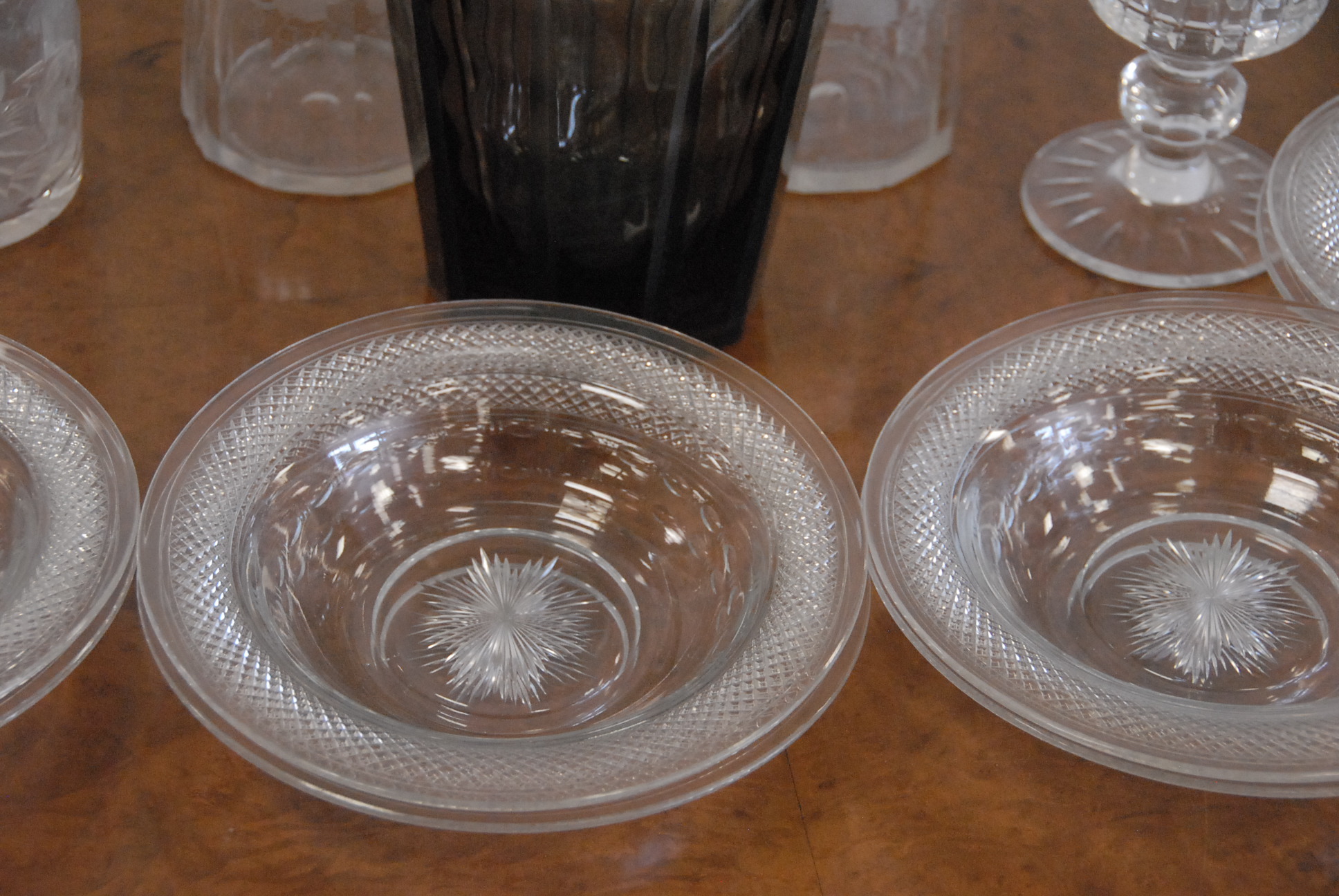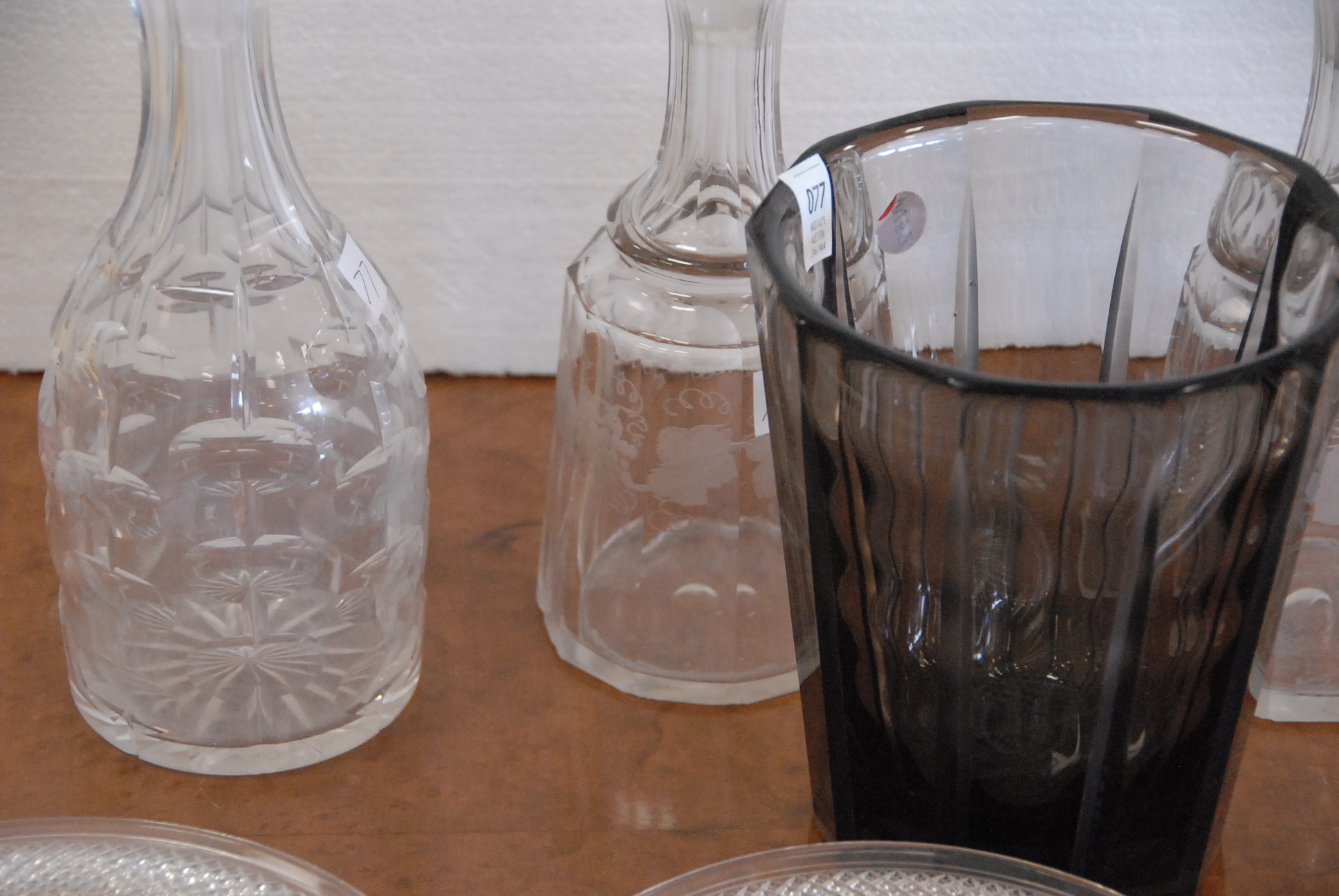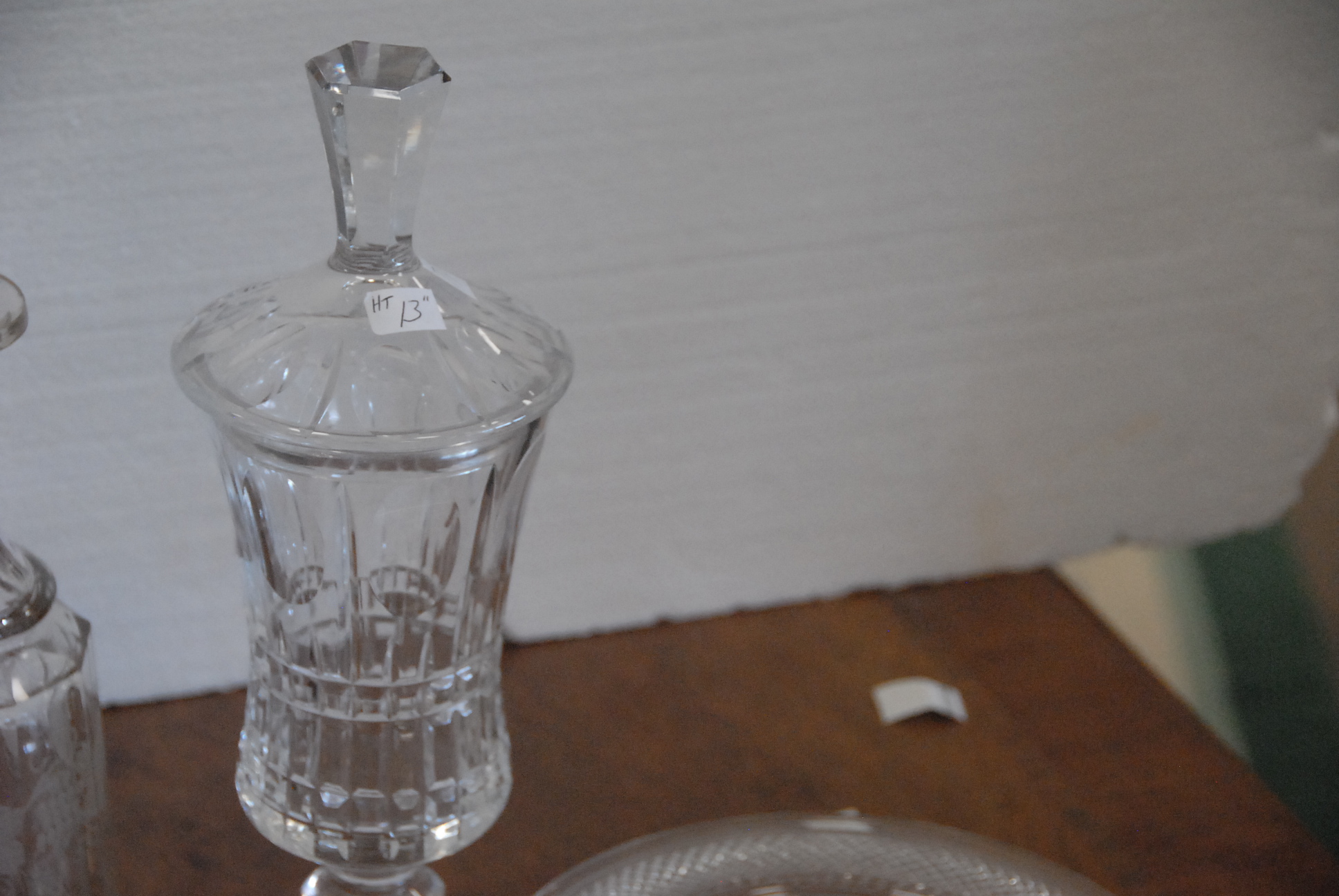 Group lot including three decanters, dark crystal vase, covered dish, cut crystal, and soup bowls.