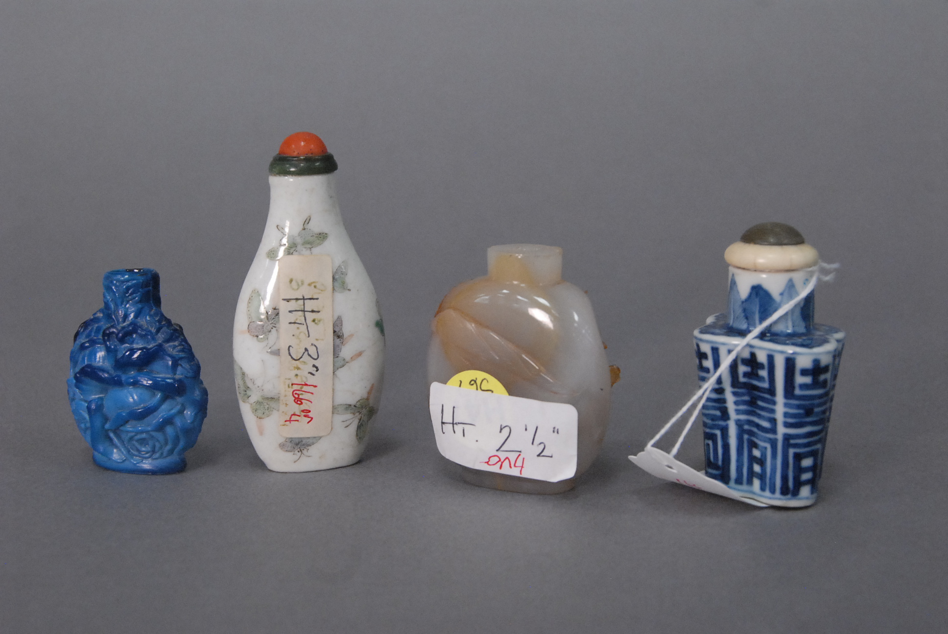Group of four snuff bottles, a carved dragon agate snuff bottle ht. 2, a porcelain butterfly snuff bottle ht. 3, a blue and white snuff bottle ht. 2 1/2, and a small glass snuff bottle ht. 2.