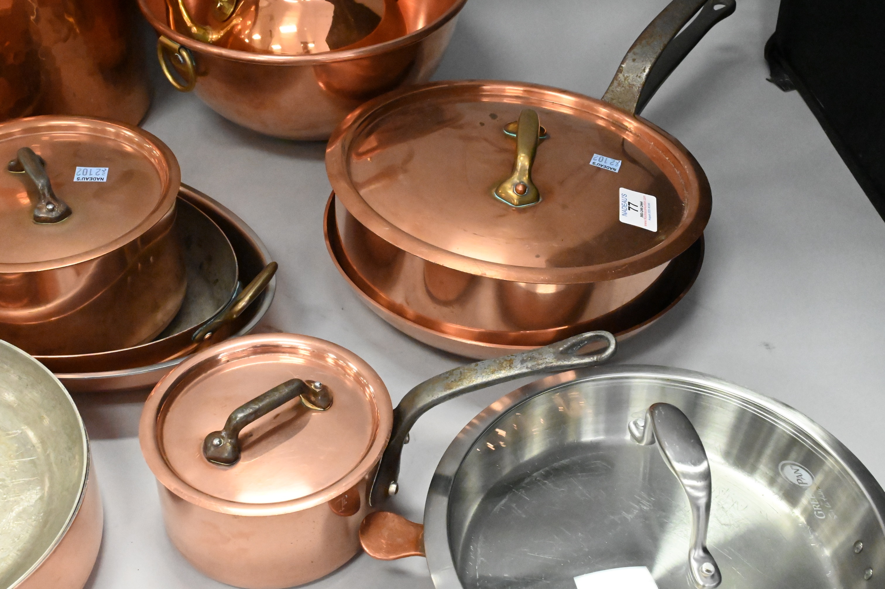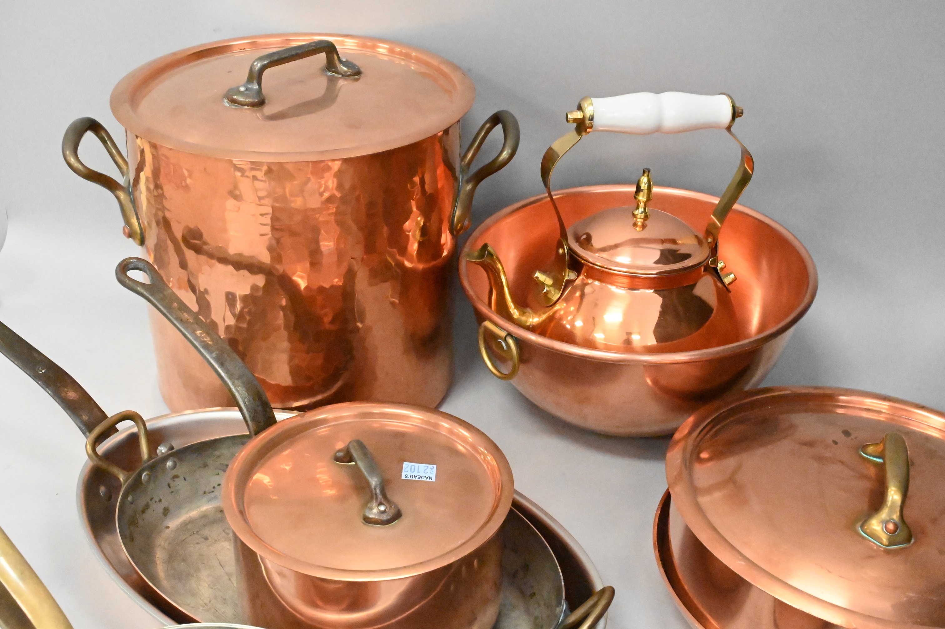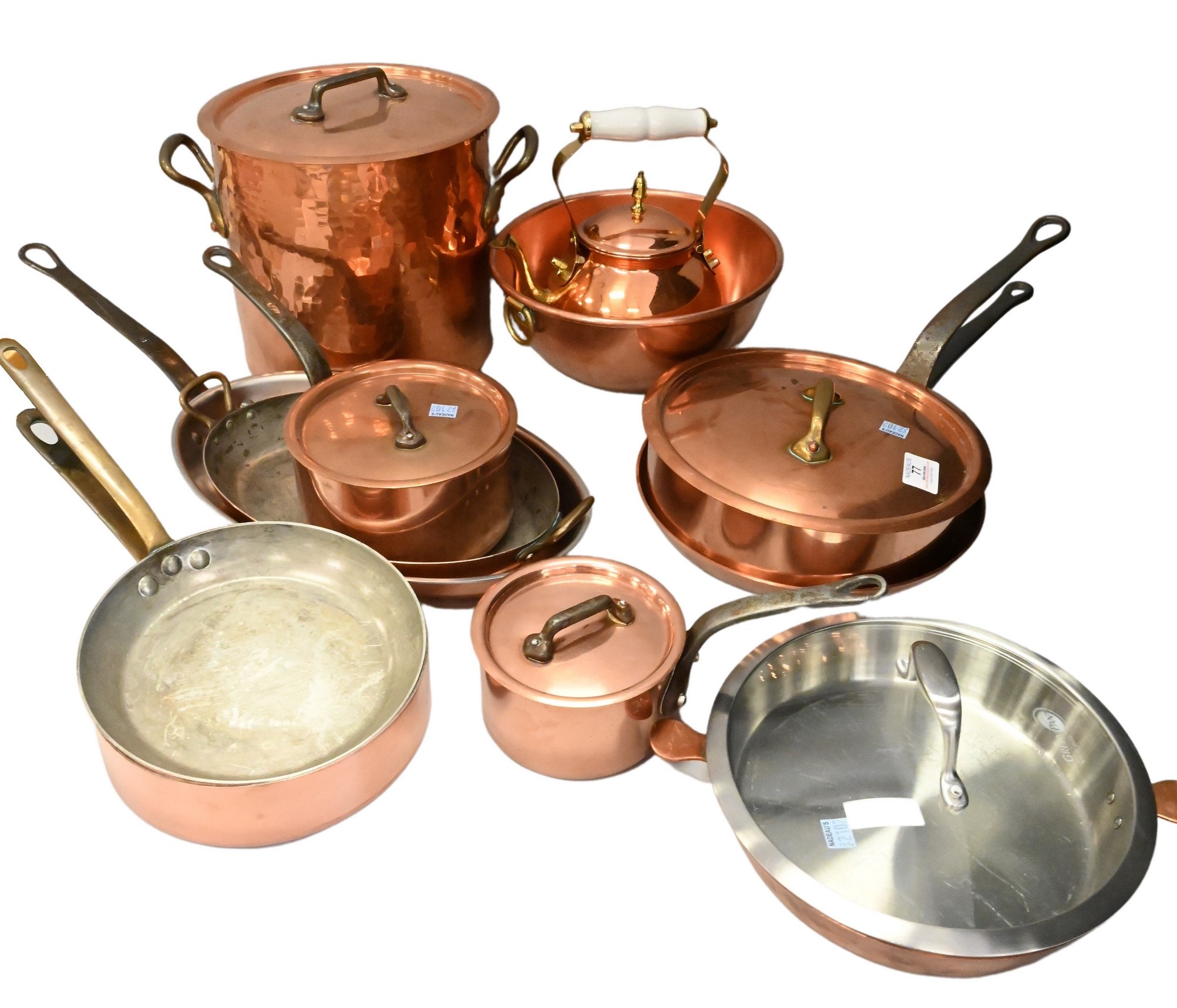 Large Grouping of Copper and Brass Pots, Pans and Skillets, largest height 9 1/2 inches, diameter 10 inches.