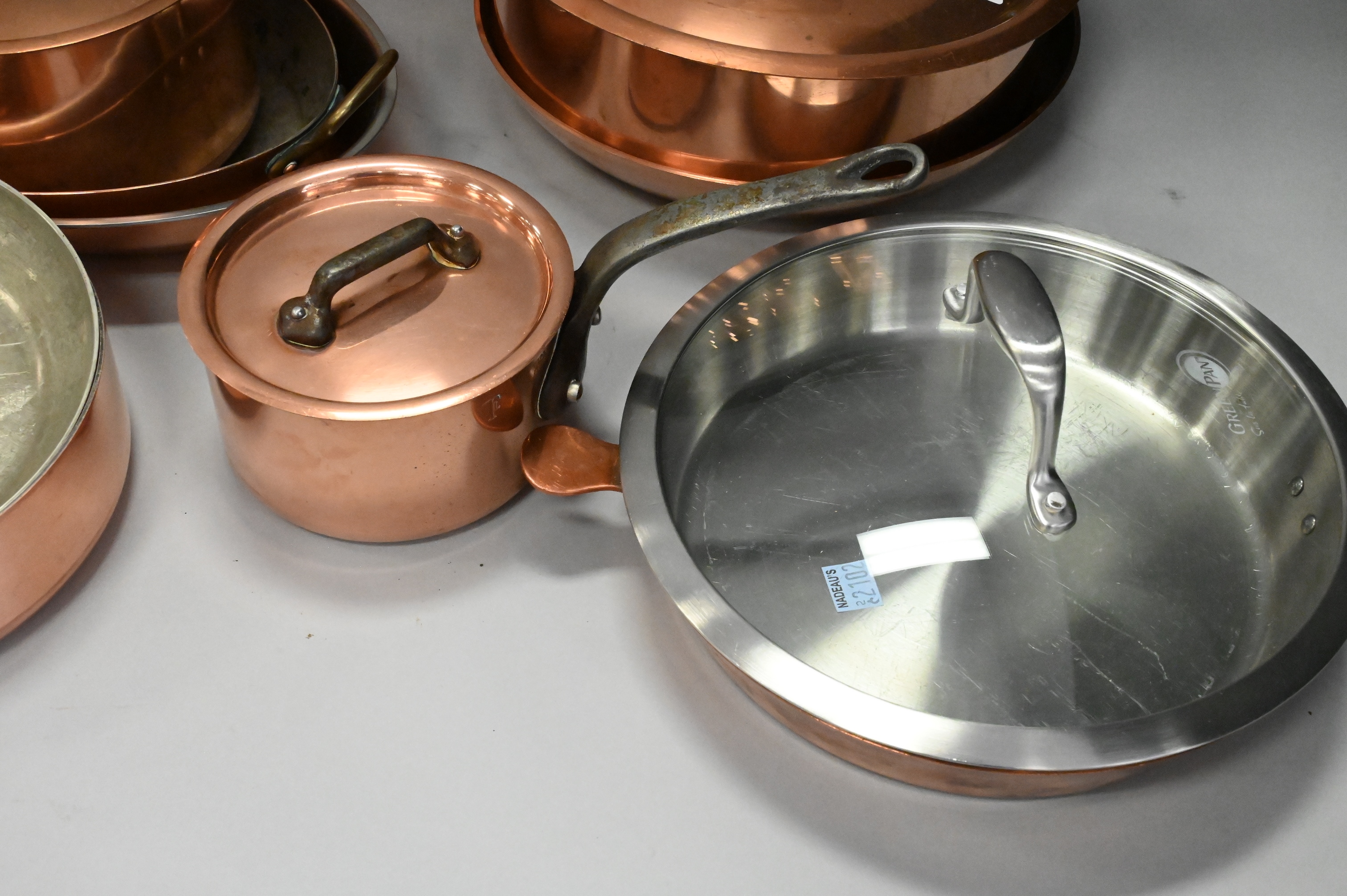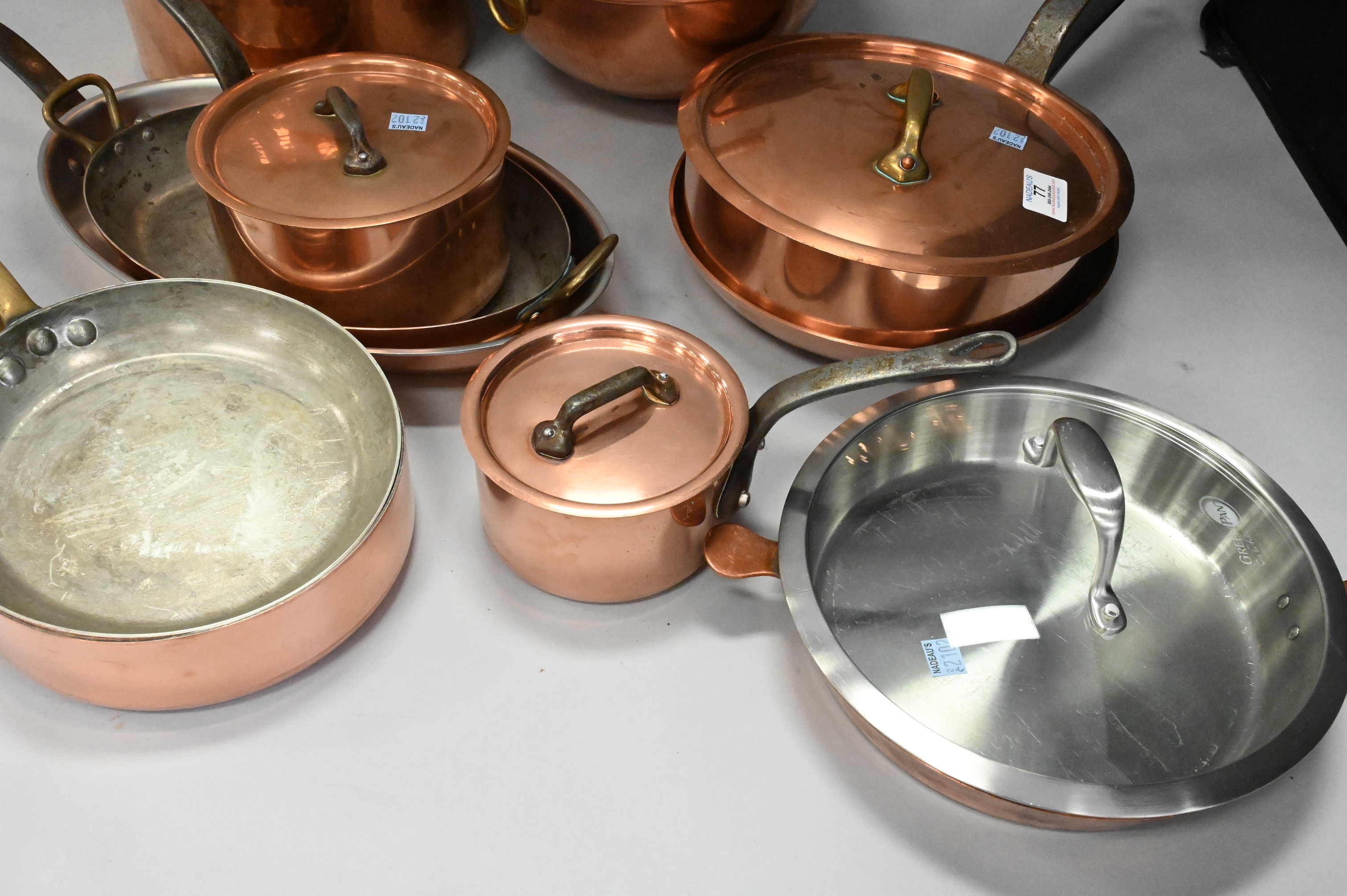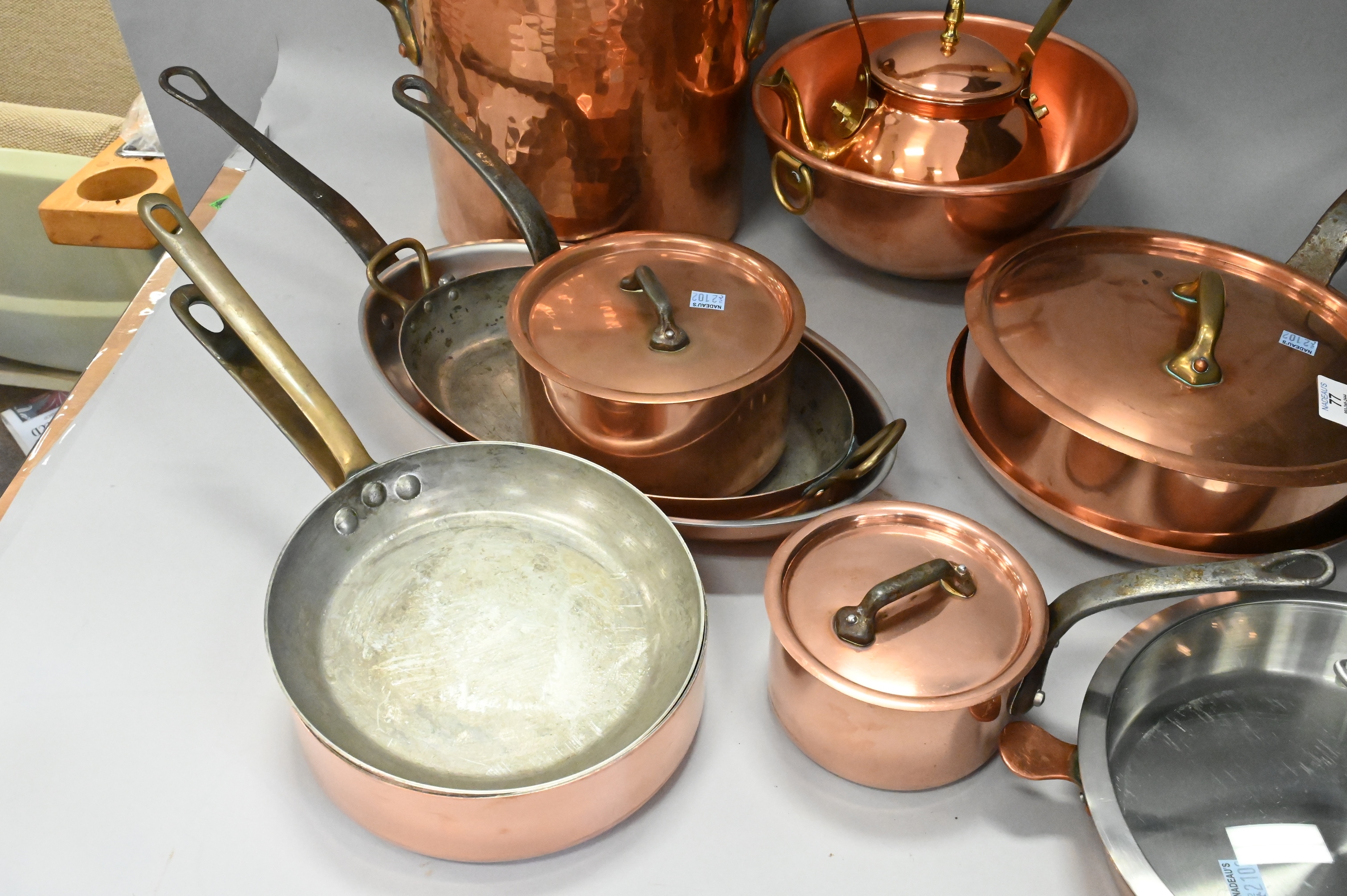Large Grouping of Copper and Brass Pots, Pans and Skillets, largest height 9 1/2 inches, diameter 10 inches.