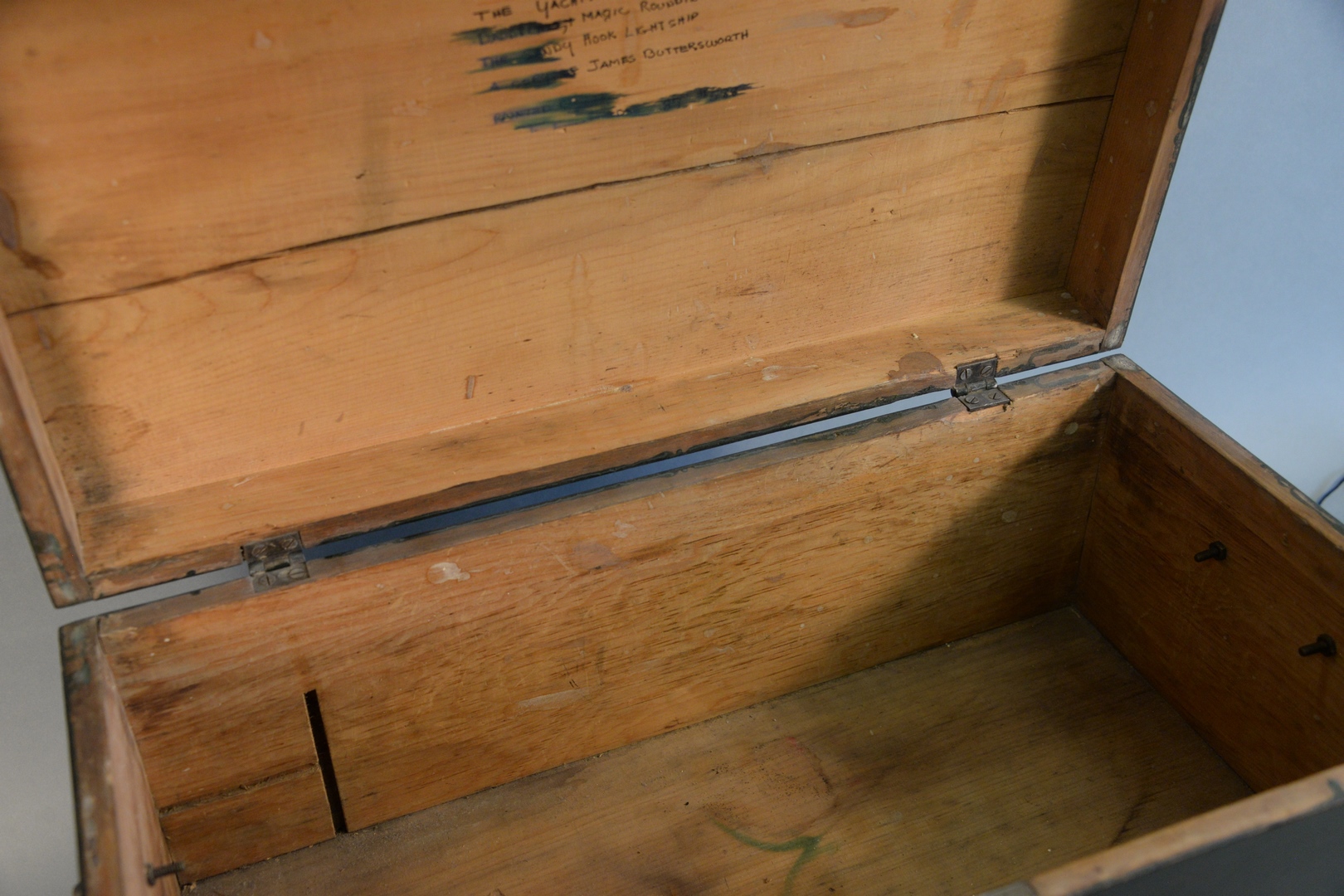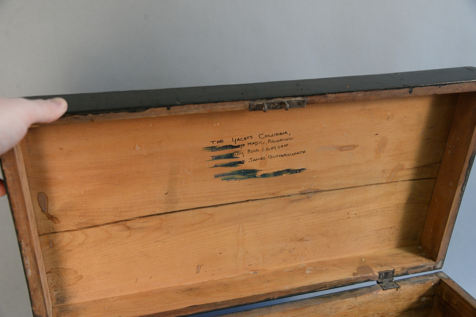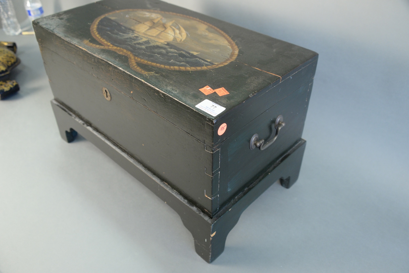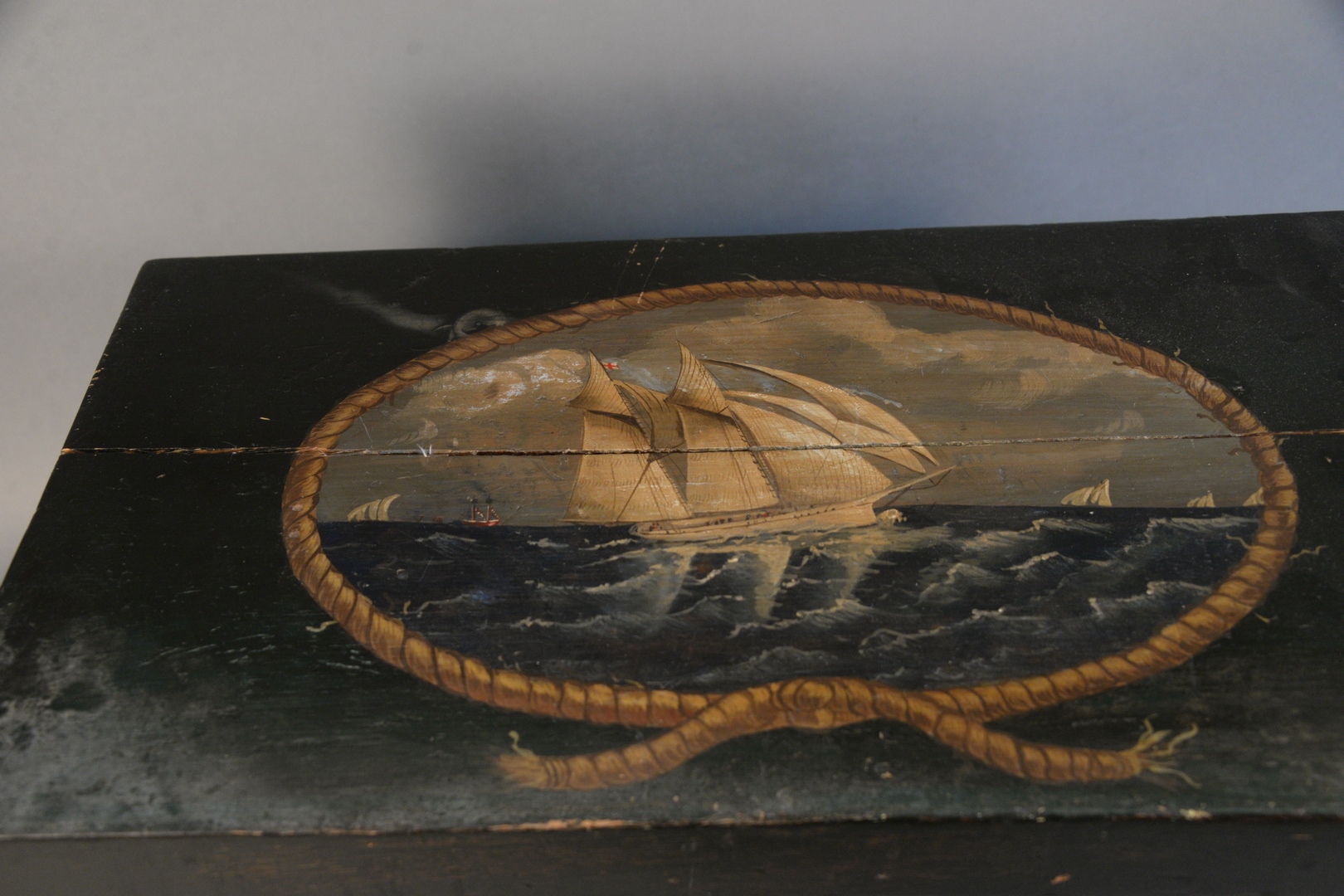 Lot 77: Lift Top Chest with painted ship on bracket base height 13 1/2 inches, top 11 1/2 x 22 Provenance: The Estate of Diana Atwood Johnson