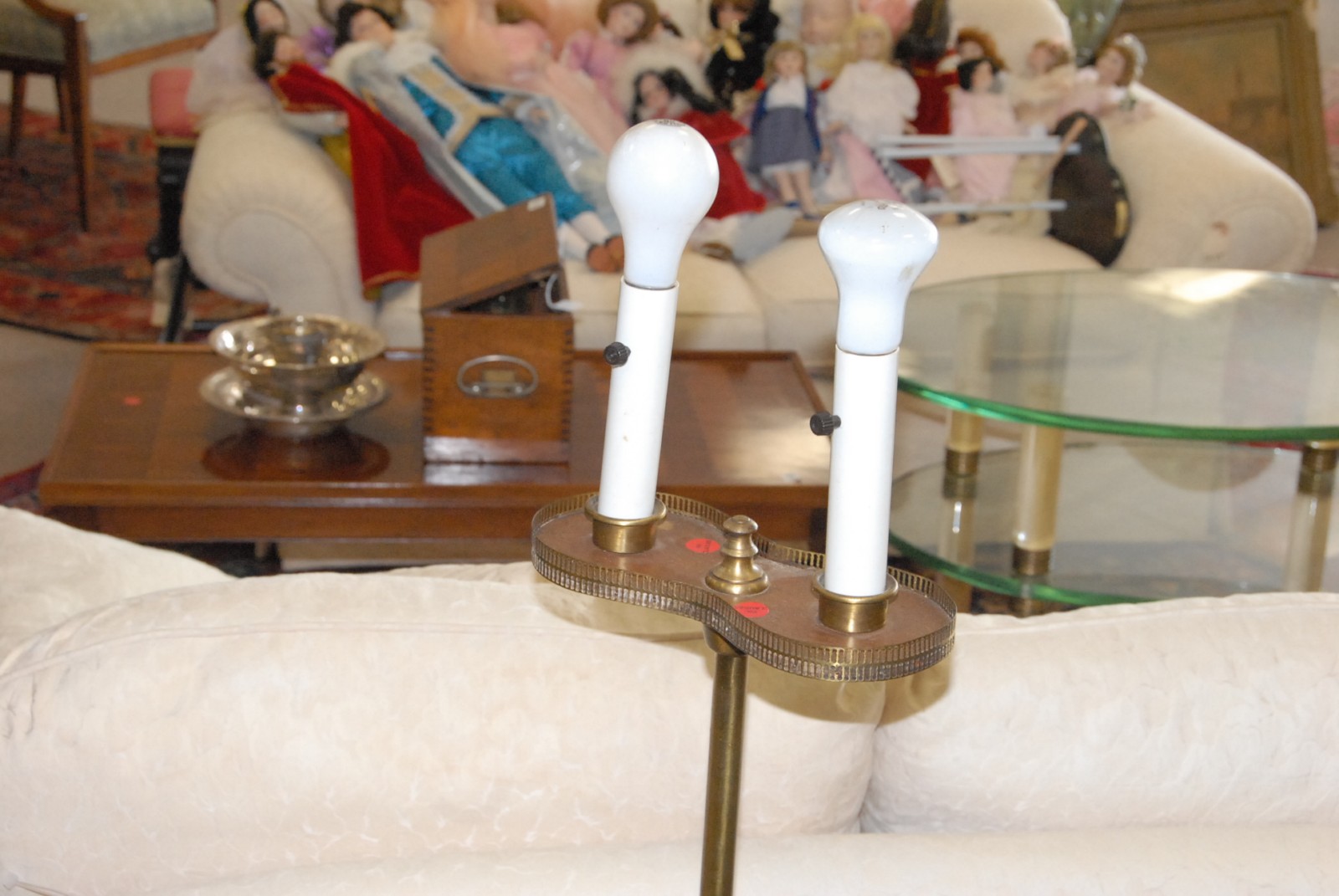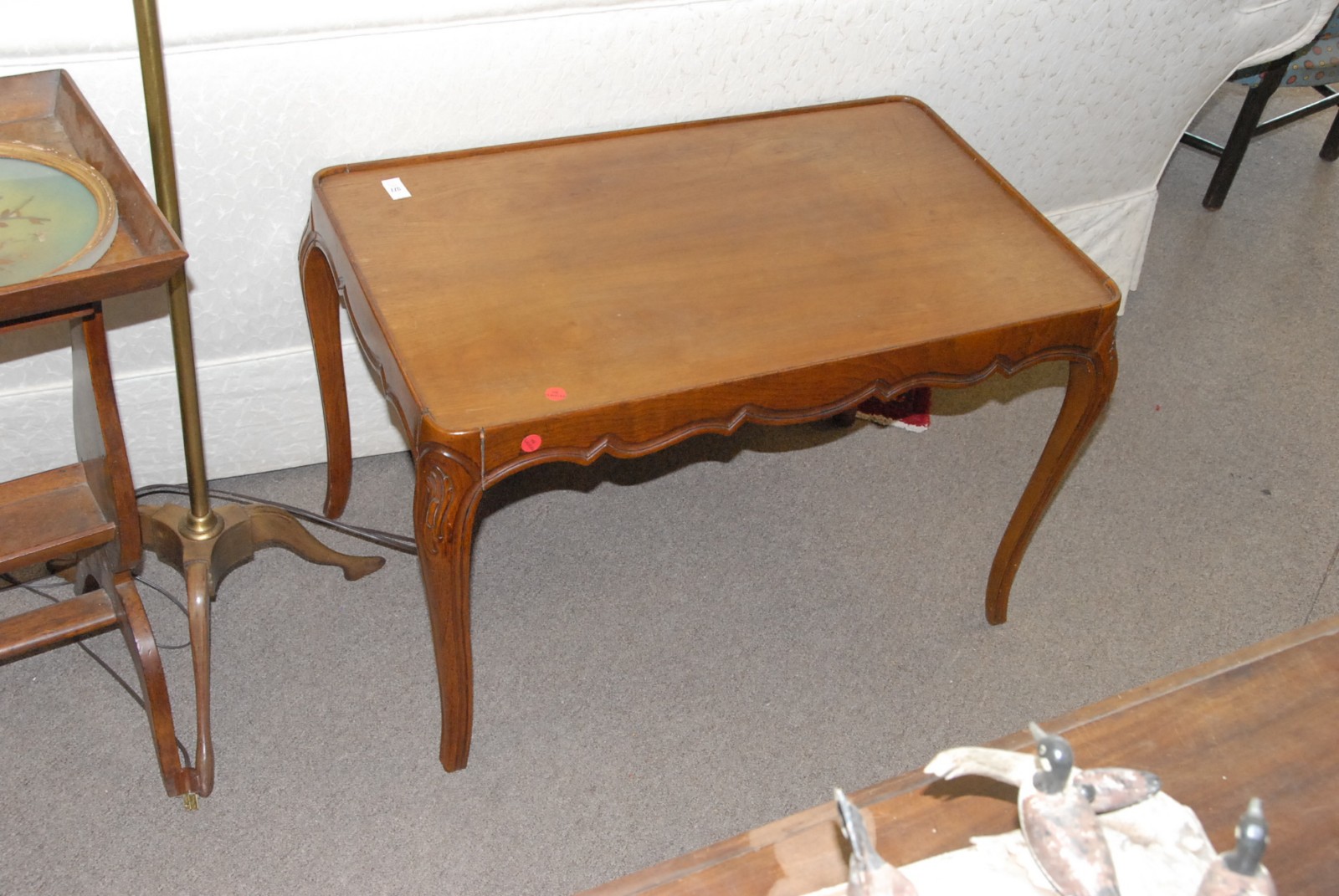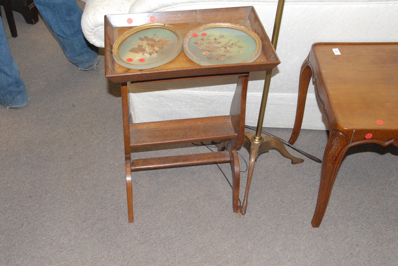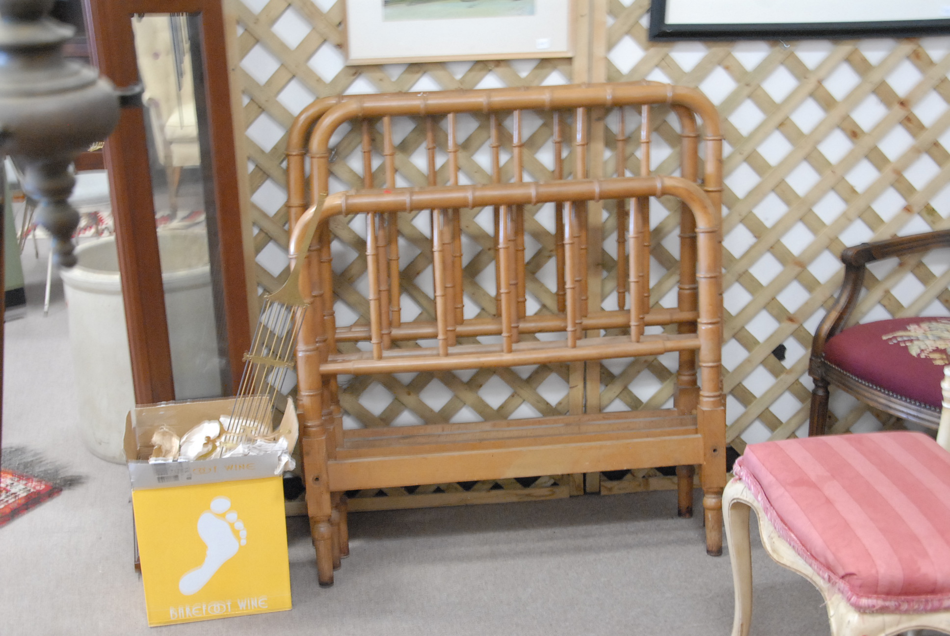 Lot to include French style coffee table, side table, brass and wood floor lamp, pair of prints, and a spool bed