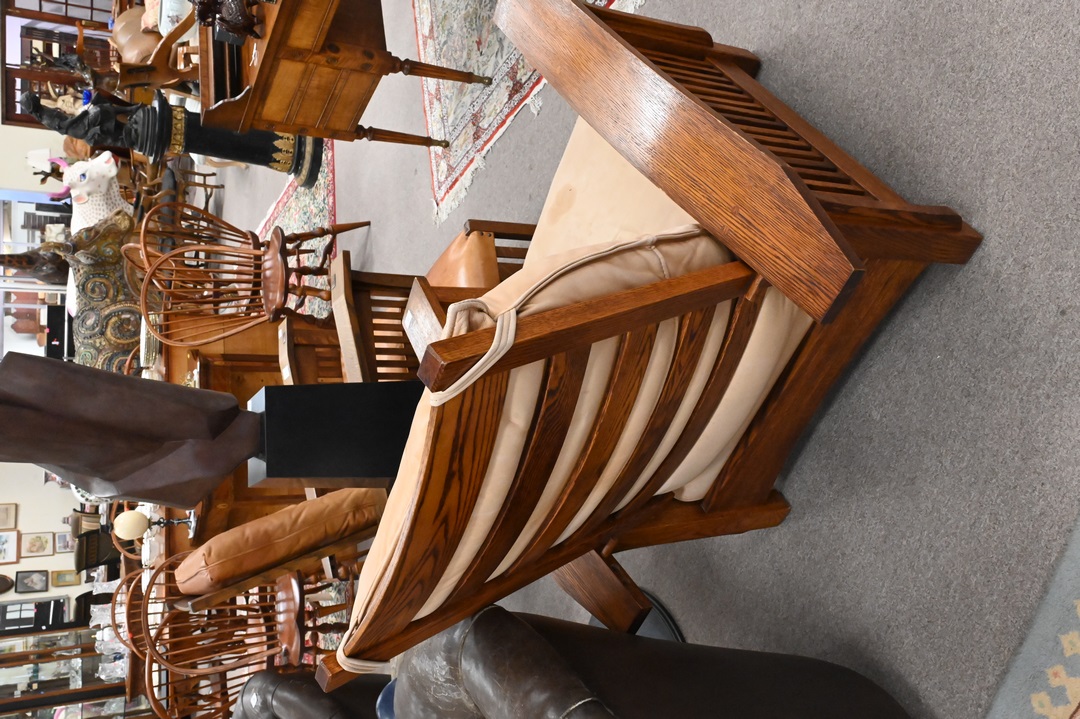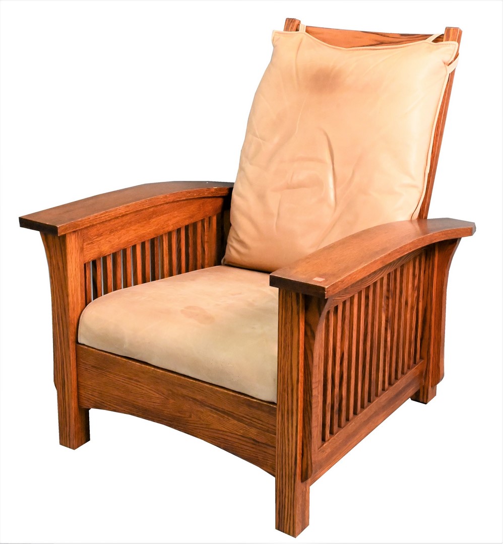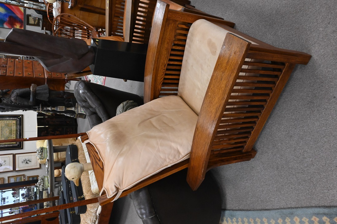 Mission Oak Morris Chair, having leather upholstered cushions, height 40 inches, width 34 1/2 inches.