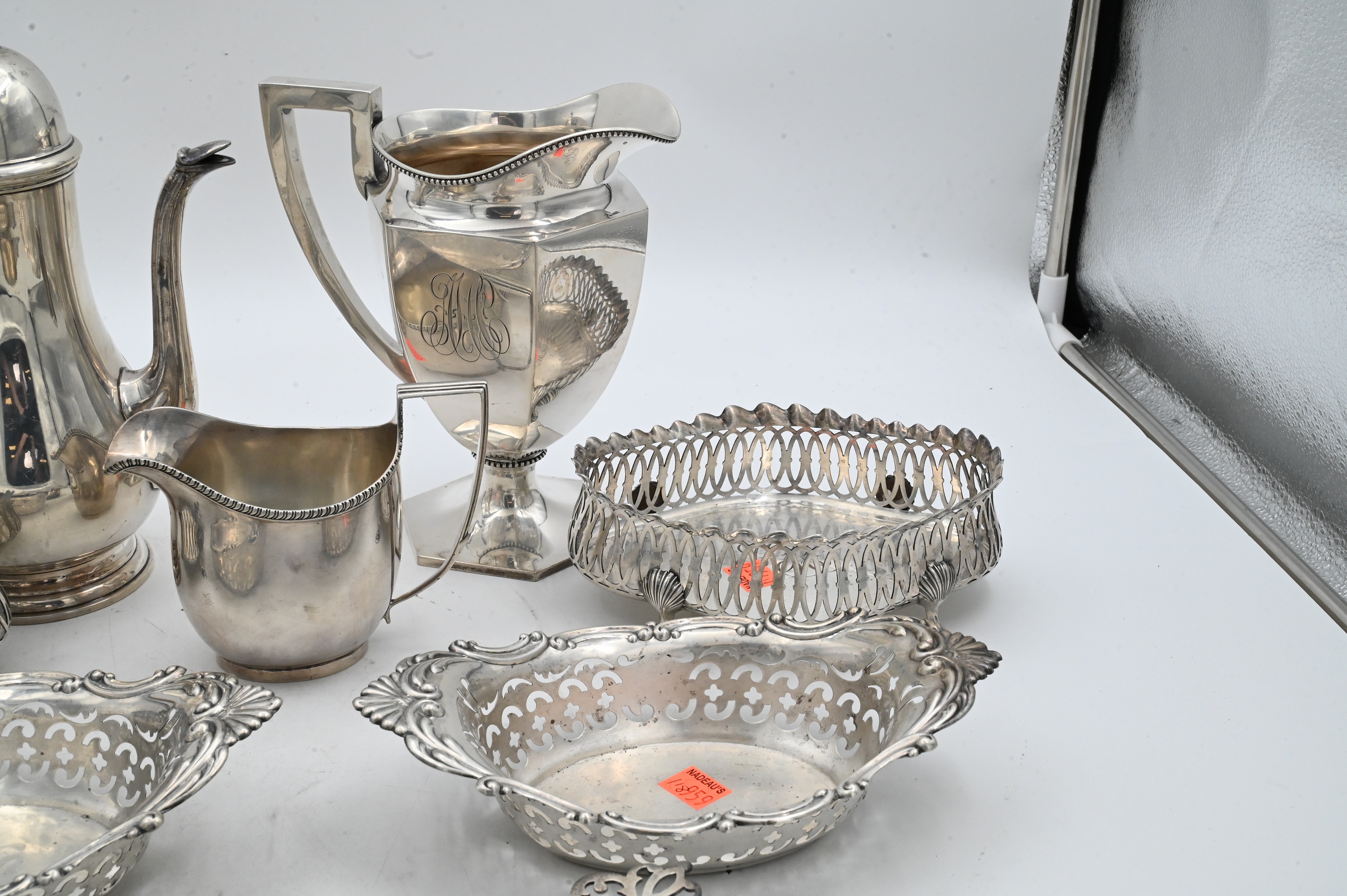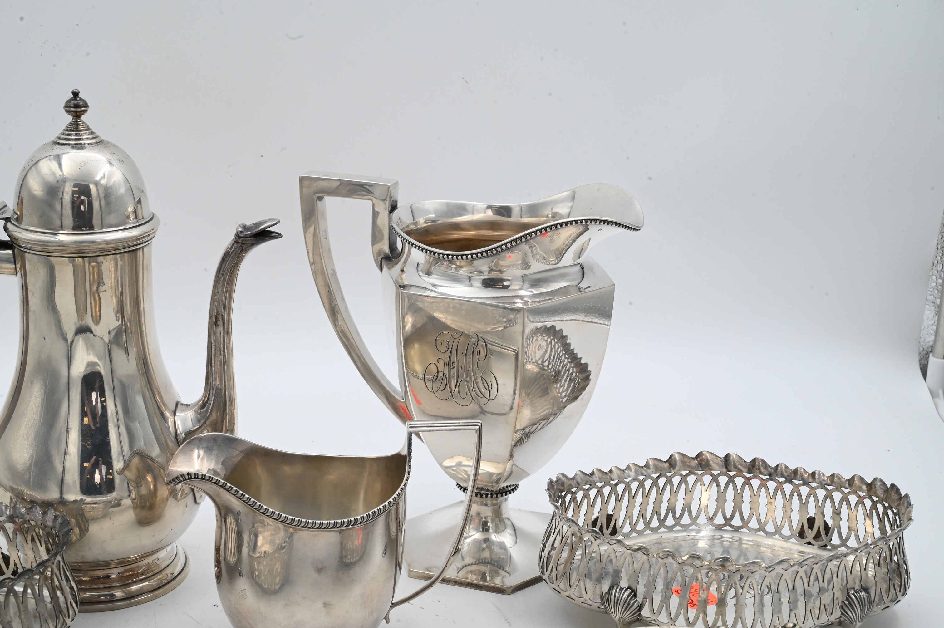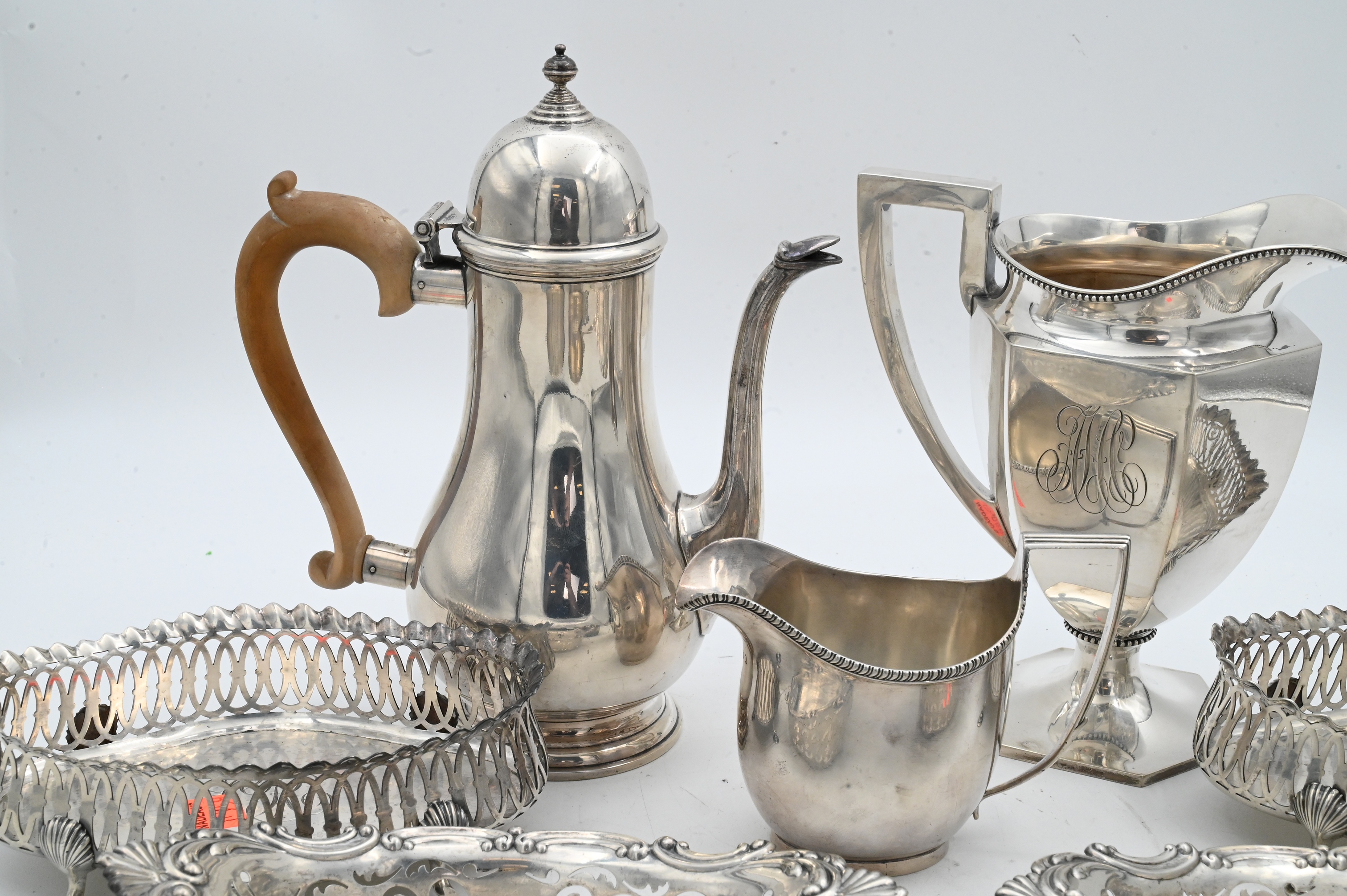 tallest 10 inches, along with four piece Gorham sterling silver group to include pair of Gorham pierced oval baskets of oval form having pierced sides and applied scroll border 1909, the other pair of Gorham baskets of oval form having openwork galleried sides set on four hoof feet with shell-form joints