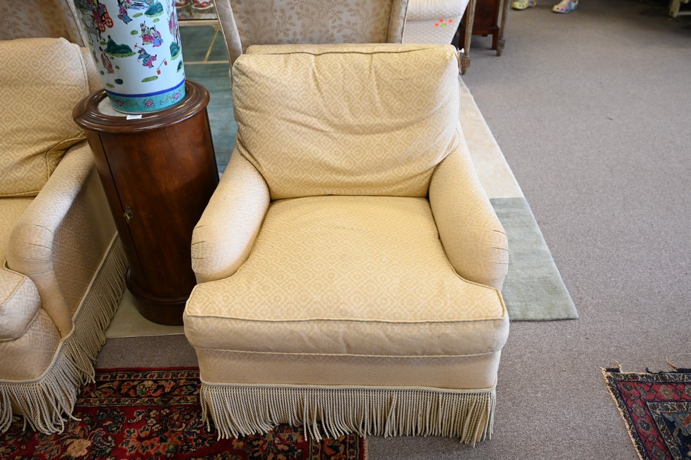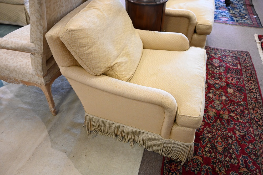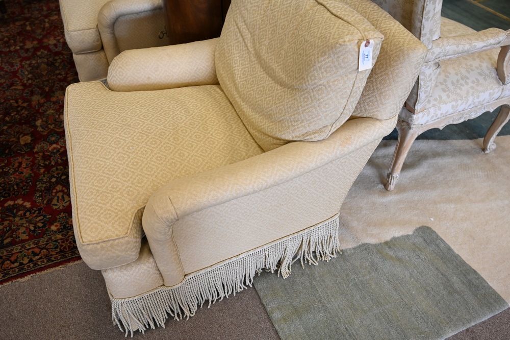 Lot 77: Pair of Baker Upholstered Easy Chairs, height 34 inches, width 32 inches.