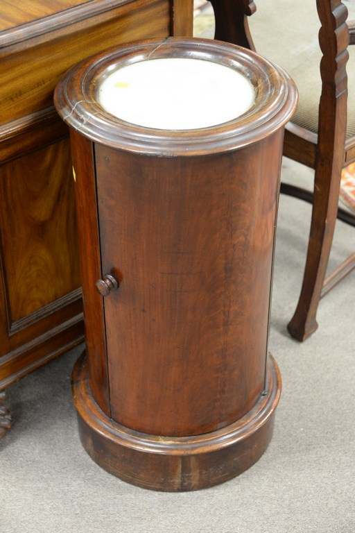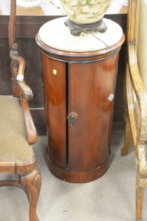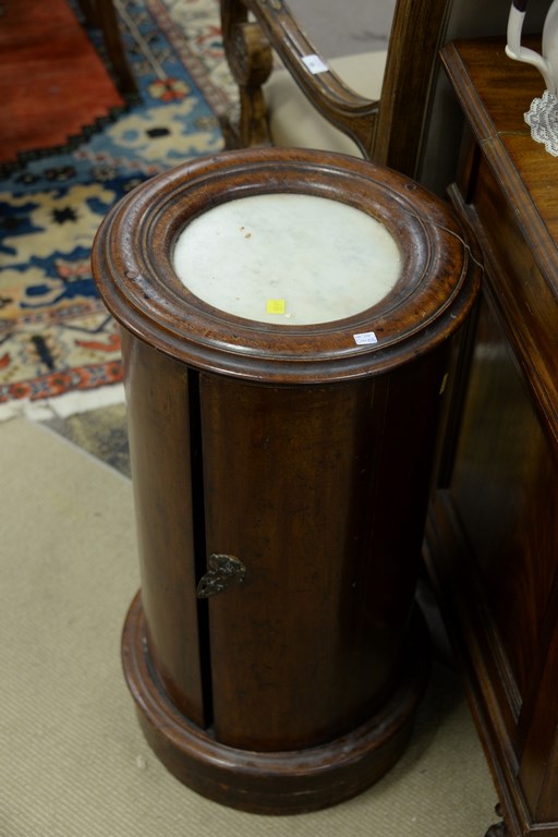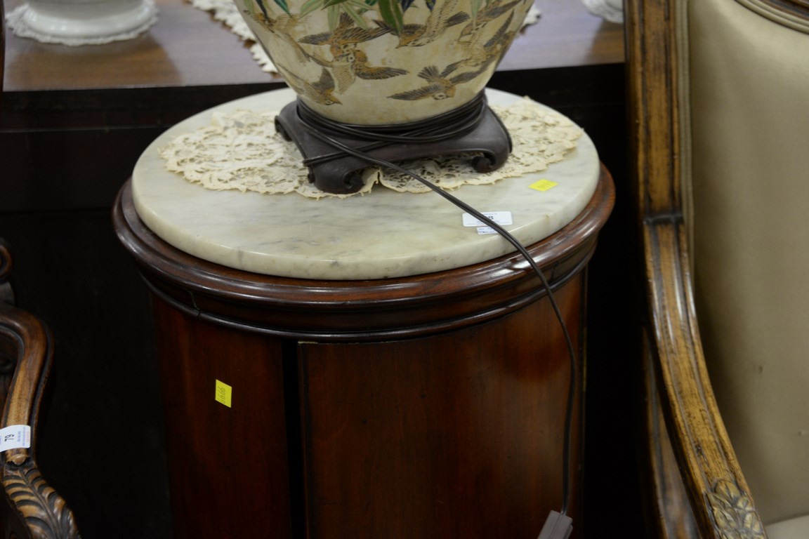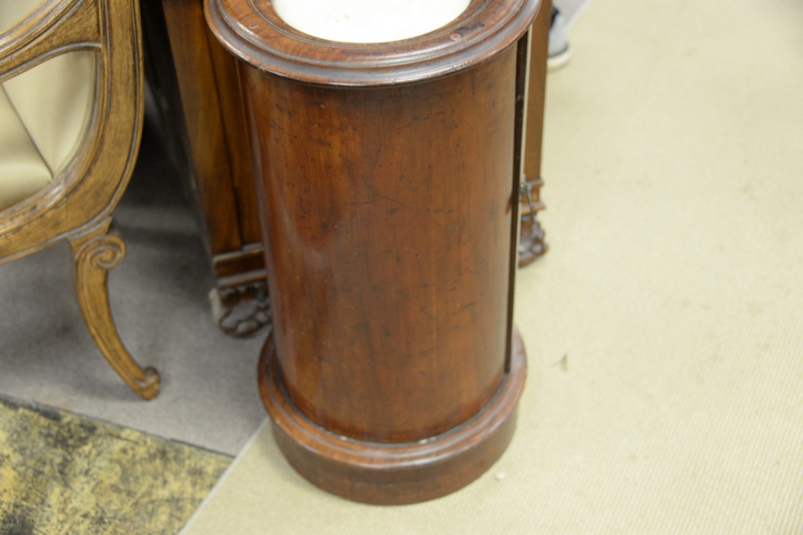 Lot 77: Pair of Georgian mahogany marble top commode stands, cylindrical forms with inset marble tops. ht. 29 in. dia. 15 1/2 in.