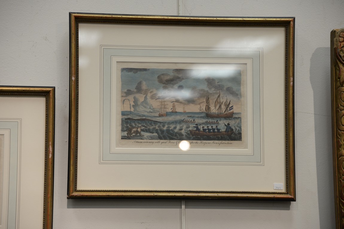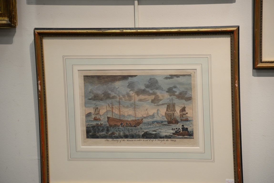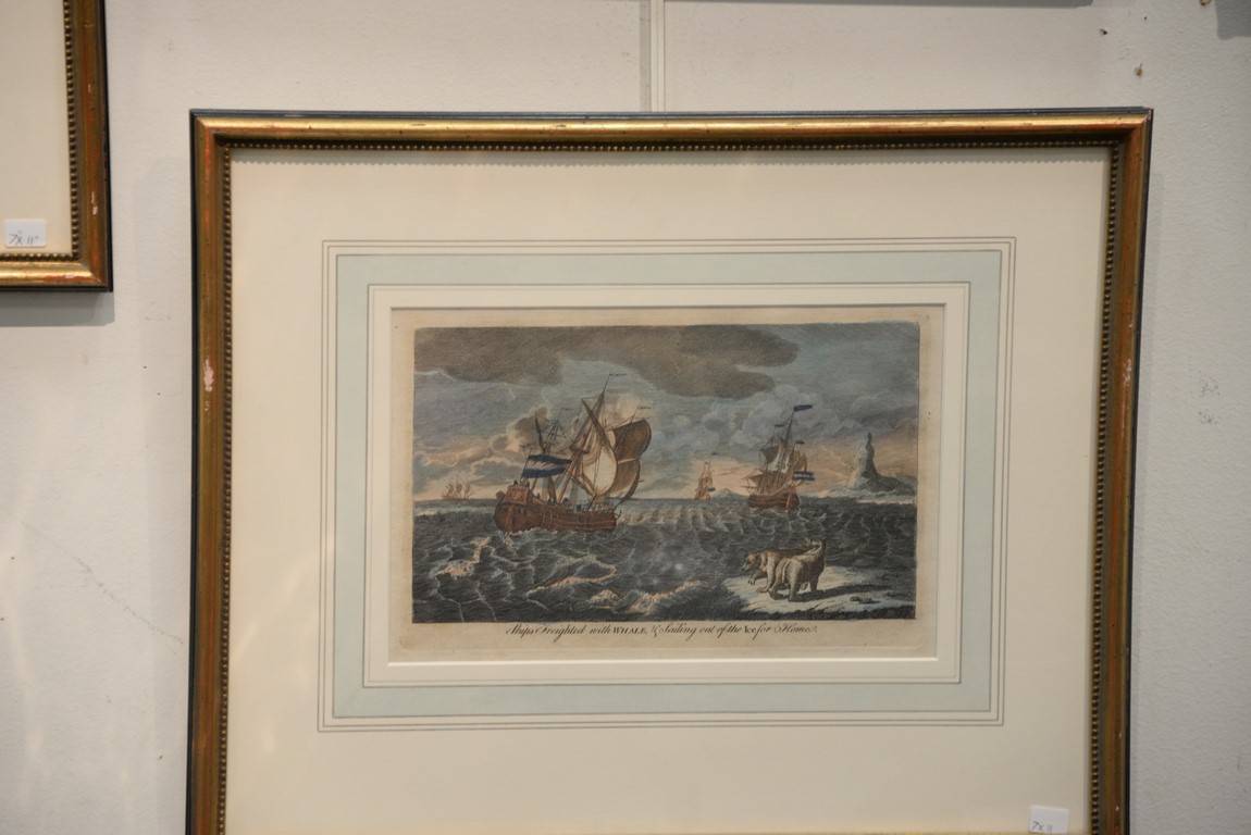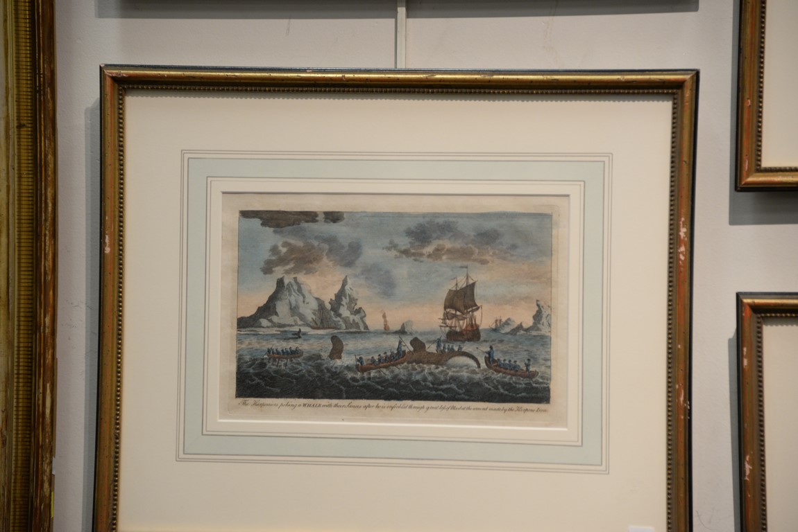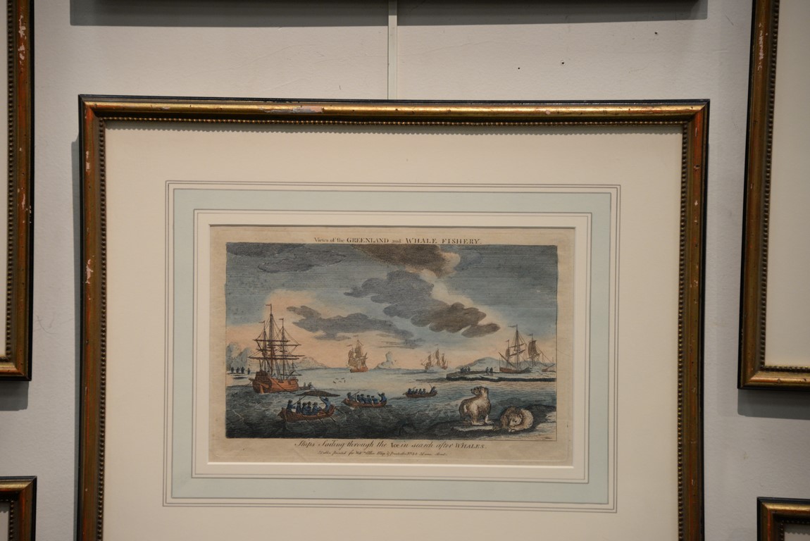 Lot 77: Set of eight framed colored engravings including Views of the Greenland and Whale Fishery printed for Will Allen Map and Print Seller No. 32 Dame Street, Ships Sailing Through the Ice in Search of Whales, The Longboats Making Towards a Whale and