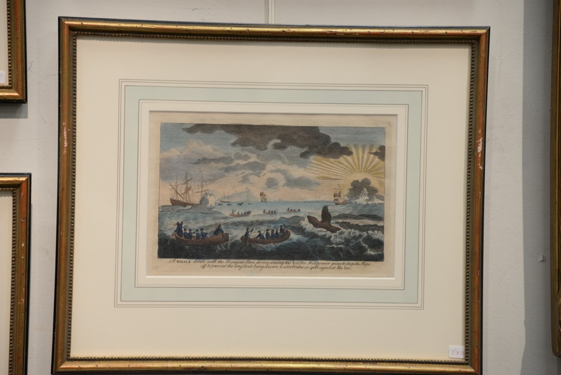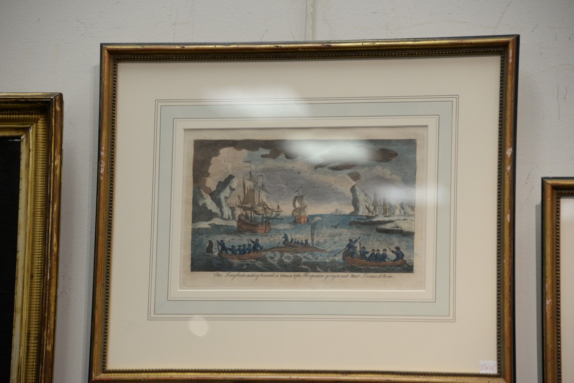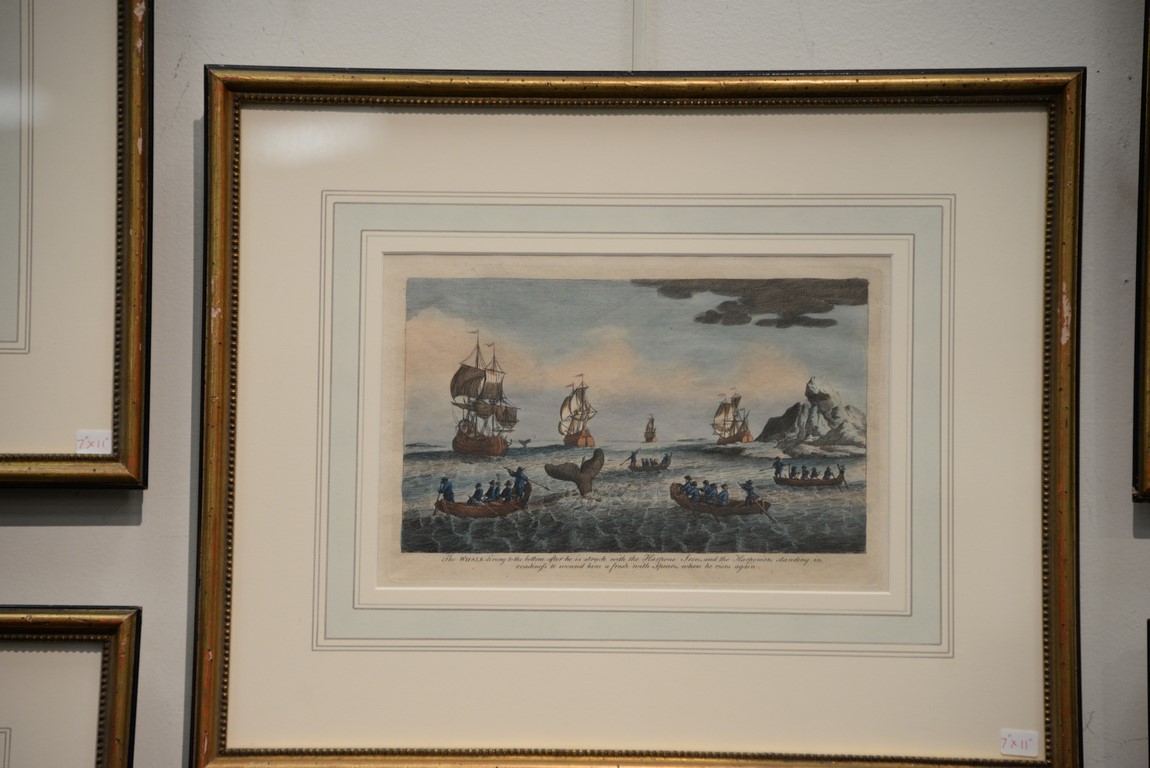 Set of eight framed colored engravings including Views of the Greenland and Whale Fishery printed for Will Allen Map and Print Seller No. 32 Dame Street, Ships Sailing Through the Ice in Search of Whales, The Longboats Making Towards a Whale and the Harpooners Going to Cast Their Lances at Him, and A Whale Struck with the Harpoon Iron Diving Among the Ice, the Harpooner Going to the Rope Off to Prevent the Long Boat Being Drawn Under Water or Split Against the Ice, etc., with Vixseboxse Art Galleries label on back of each. 7 x 11