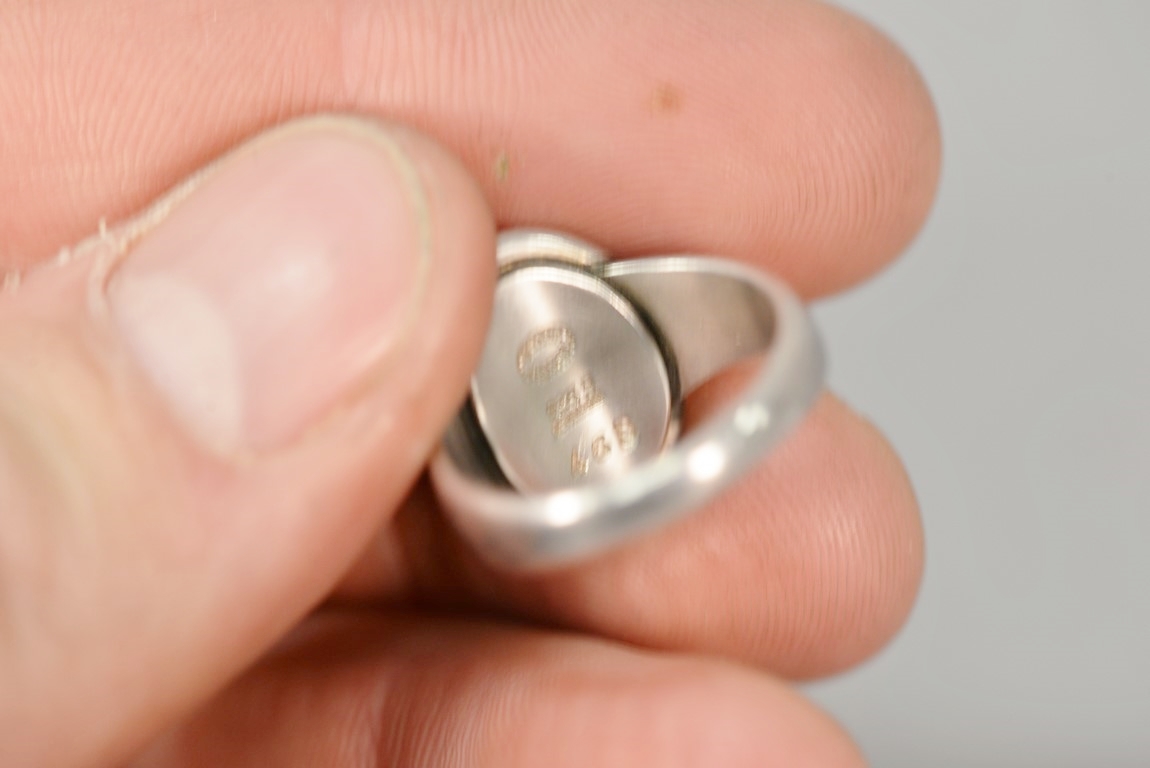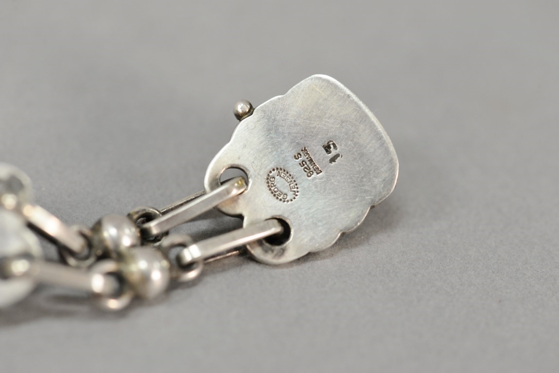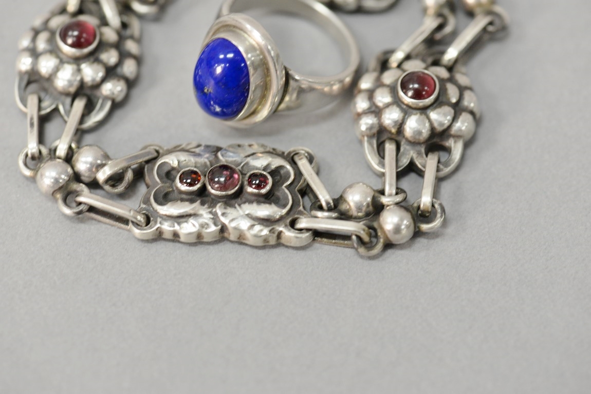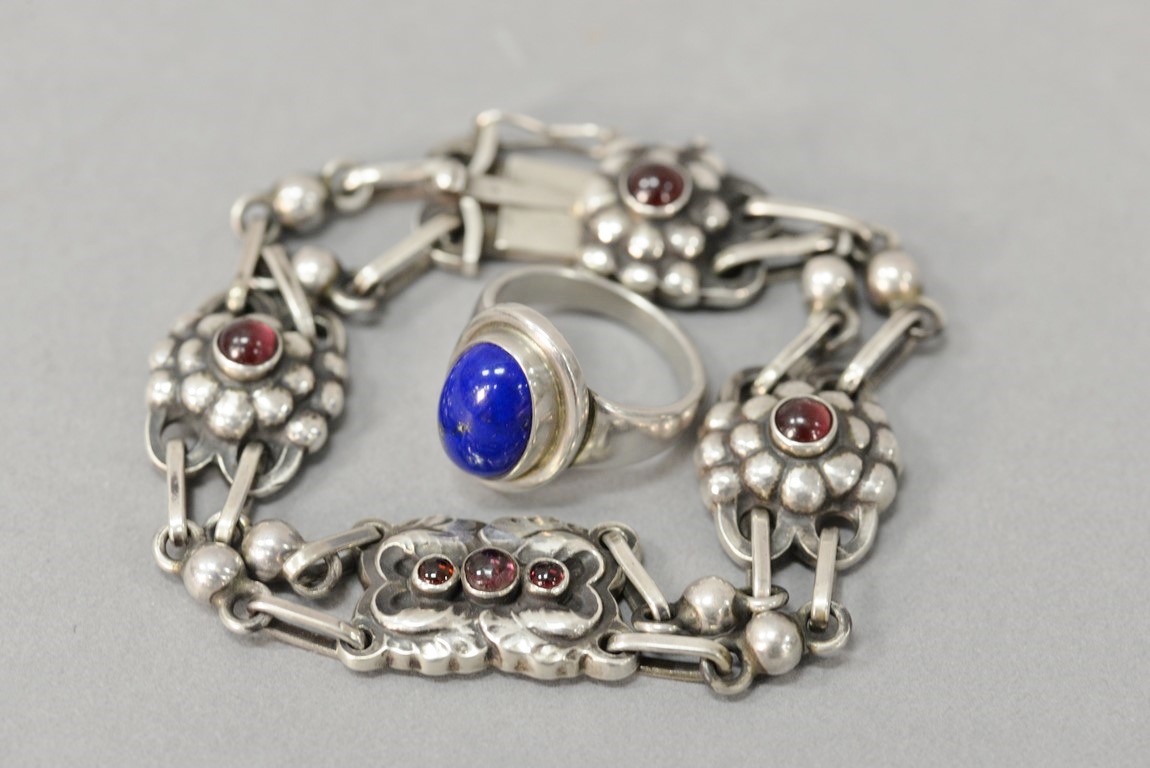 Lot 77: Two Georg Jenson pieces including a bracelet with purple garnets and a ring with blue stone, marked Georg Jensen Denmark Sterling.