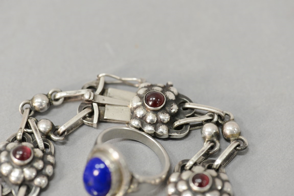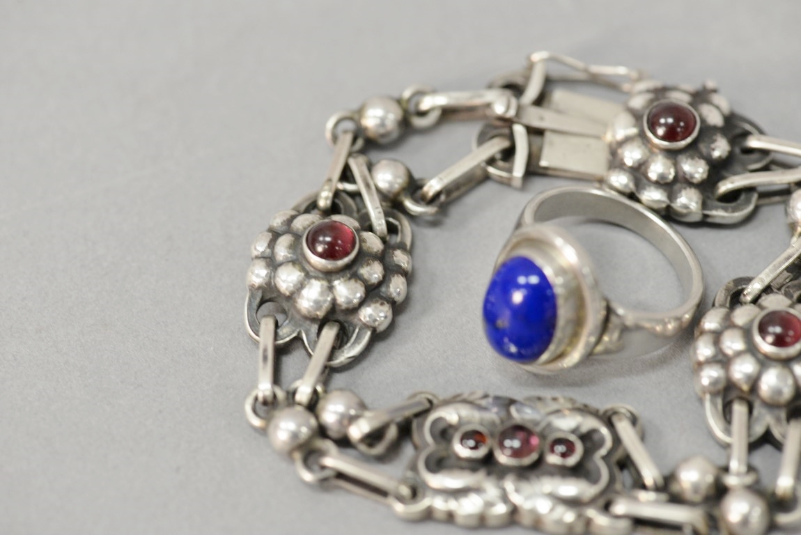 Two Georg Jenson pieces including a bracelet with purple garnets and a ring with blue stone, marked Georg Jensen Denmark Sterling.