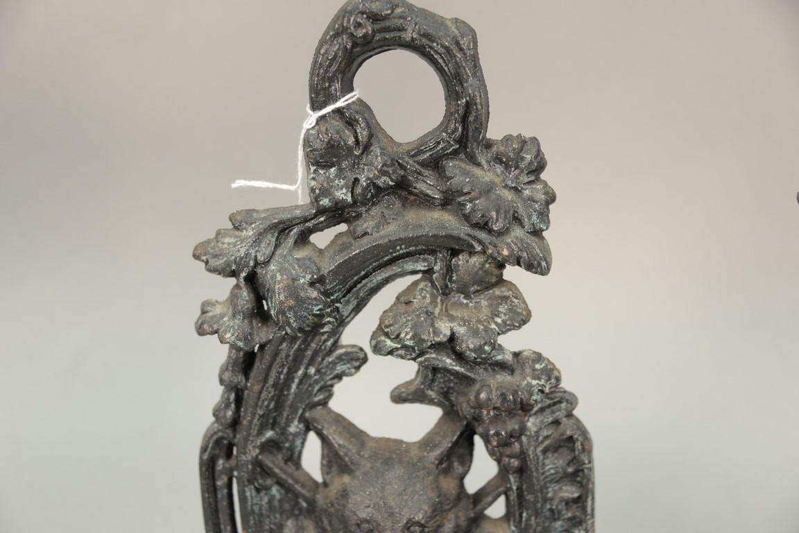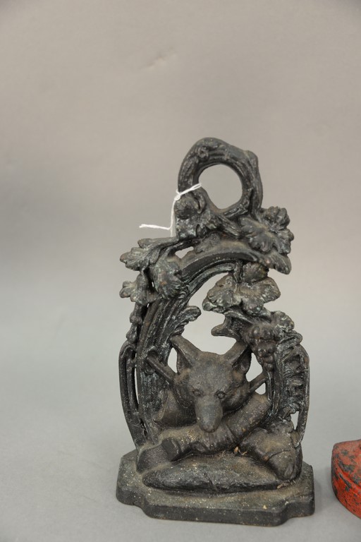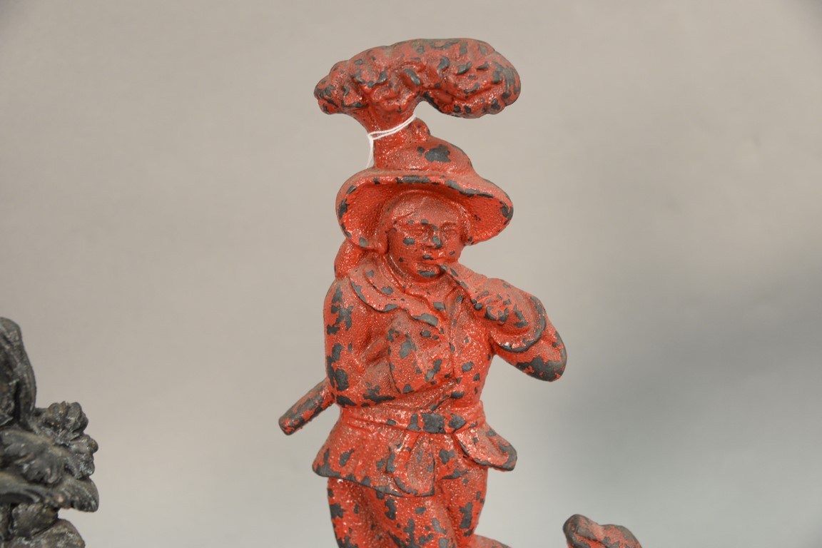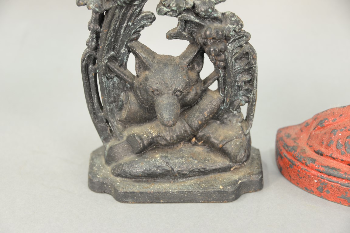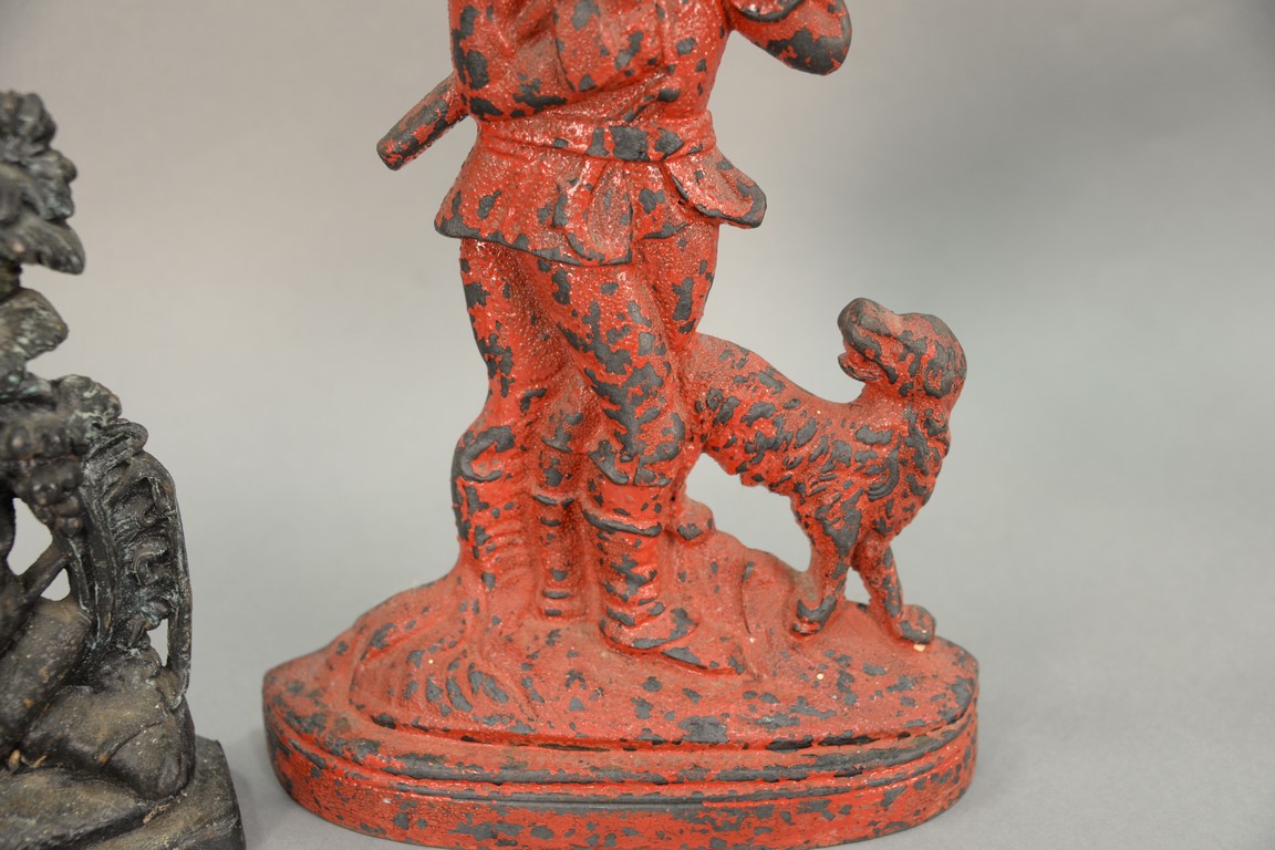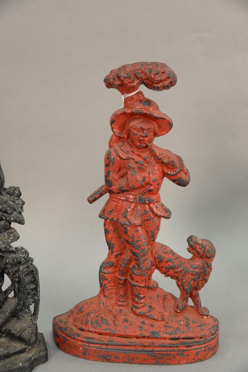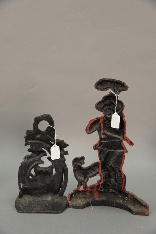Two iron door stops including JZH 1949 fox hunt and a man with a dog. ht. 11in. & 15in.
