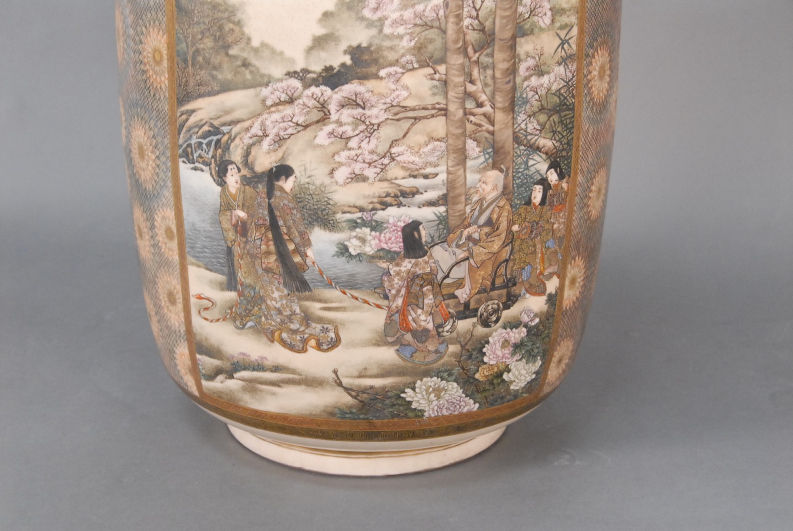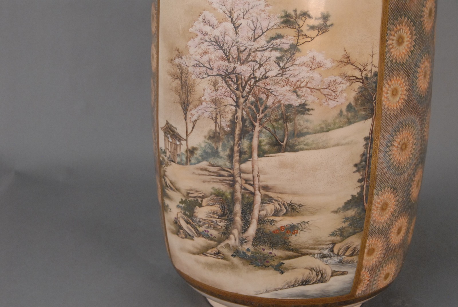 Yasudo Ryozan signed Makuzu Kozan workshop vase: Large and important Japanese barrel-form Satsuma vase with extremely well painted reserves of figures and a Shinto shrine in flowering landscapes surrounded by textile-inspired intricately painted brocade borders, 19th century – 20th century.