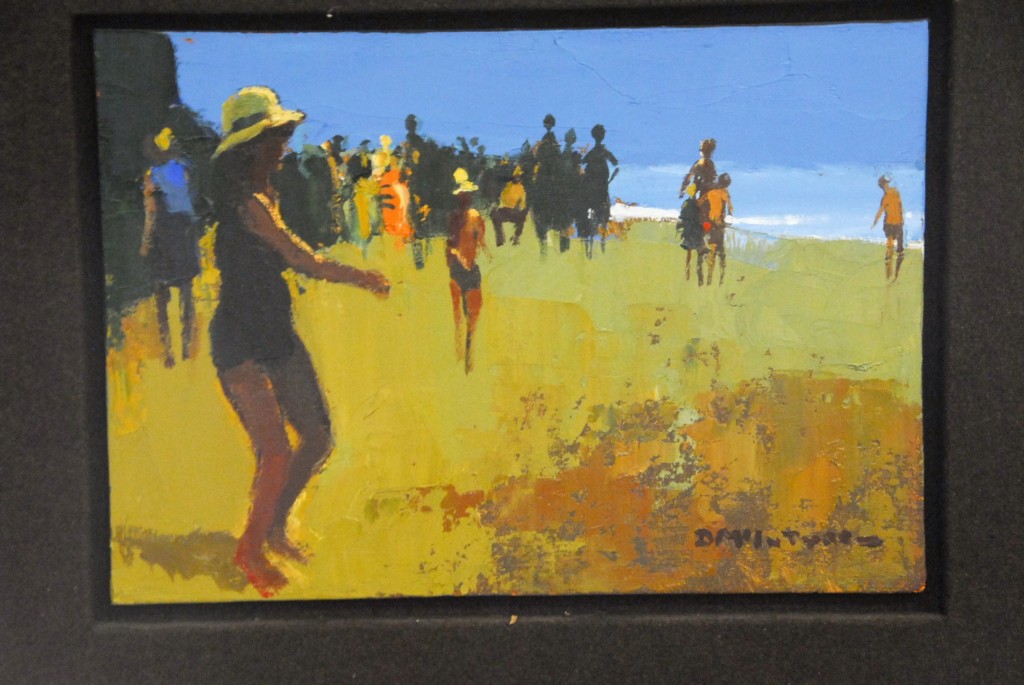 Donald McIntyre 1923-2009 CROWDED BEACH oil on board lower right D. McIntyre – 14 x 20