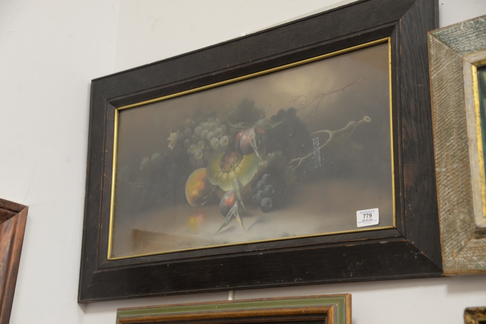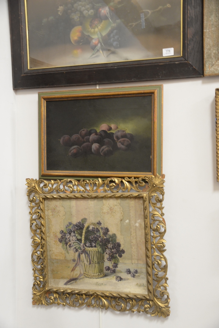 Lot 779: Group of Seven Framed Still Lifes, to include a basket with purple flowers, oil on canvas cherries, oil on canvas, unsigned spille…