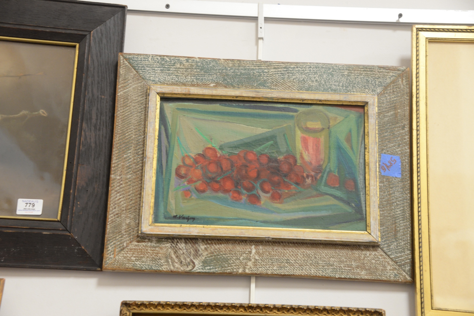 Group of Seven Framed Still Lifes, to include a basket with purple flowers, oil on canvas cherries, oil on canvas, unsigned spilled strawberries, oil on board, unsigned red cherries, oil on canvas, signed lower left mixed fruit pastel on paper, unsigned along with two Sebill still lifes with fruit, both signed lower right.