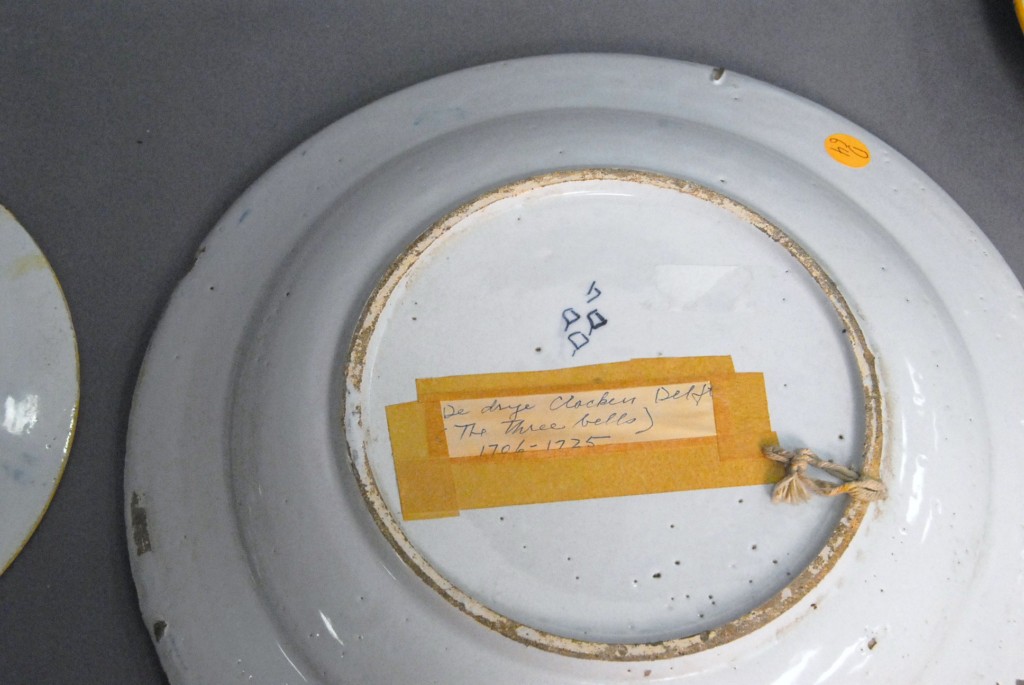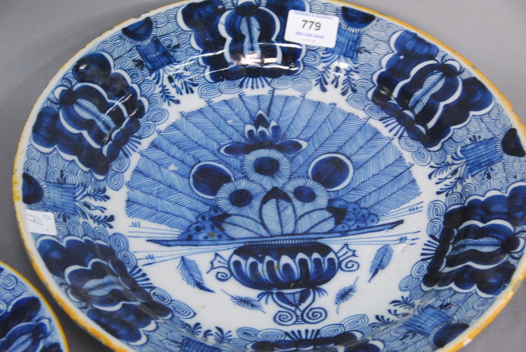 Three piece blue and white Delft lot two plates and one charger. – dia. 9in. & 14in.