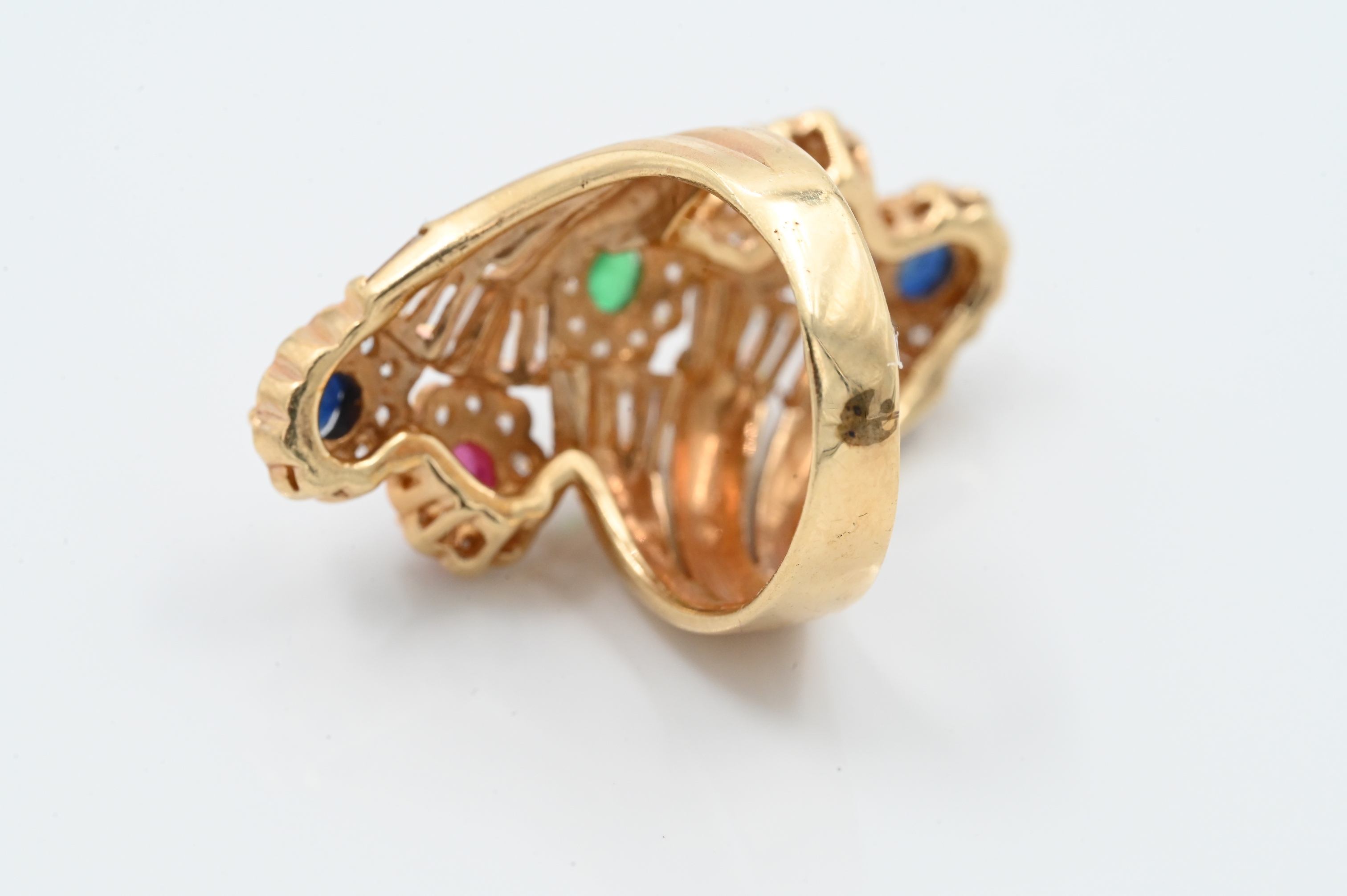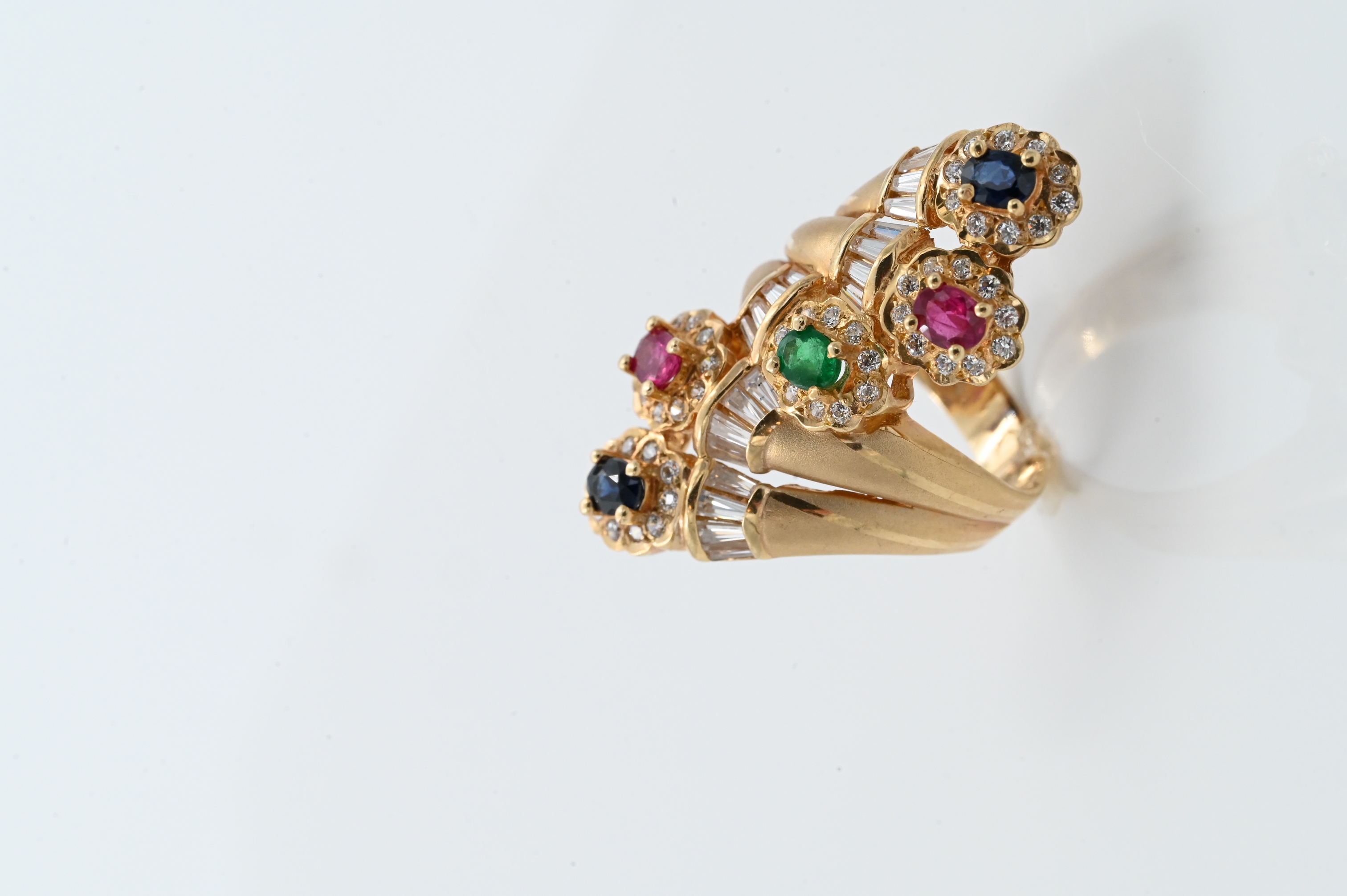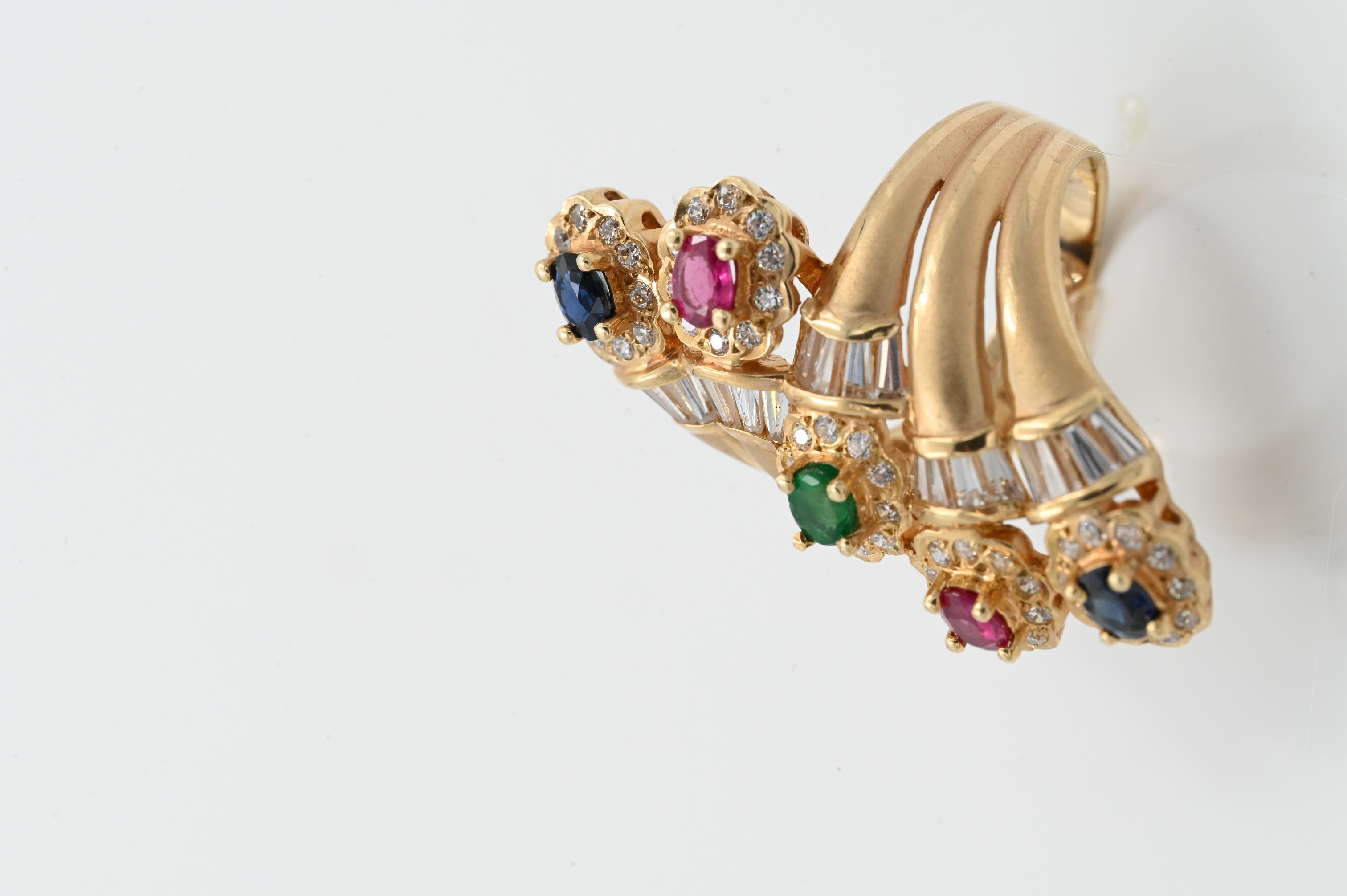 having five oval stones, two rubies, two sapphires, and one emerald, all 4 mm x 3 mm, 20 baguette diamonds and 56 round diamonds, approximately 2.6 carats