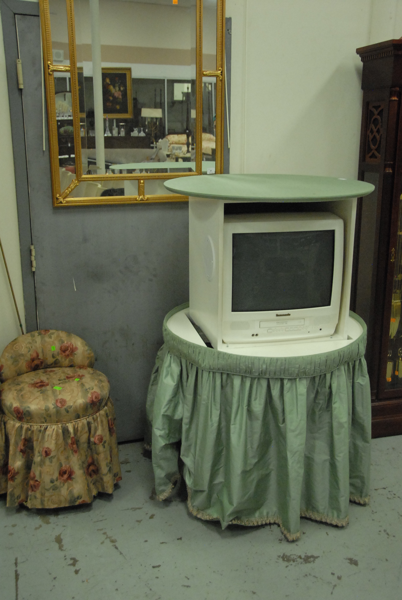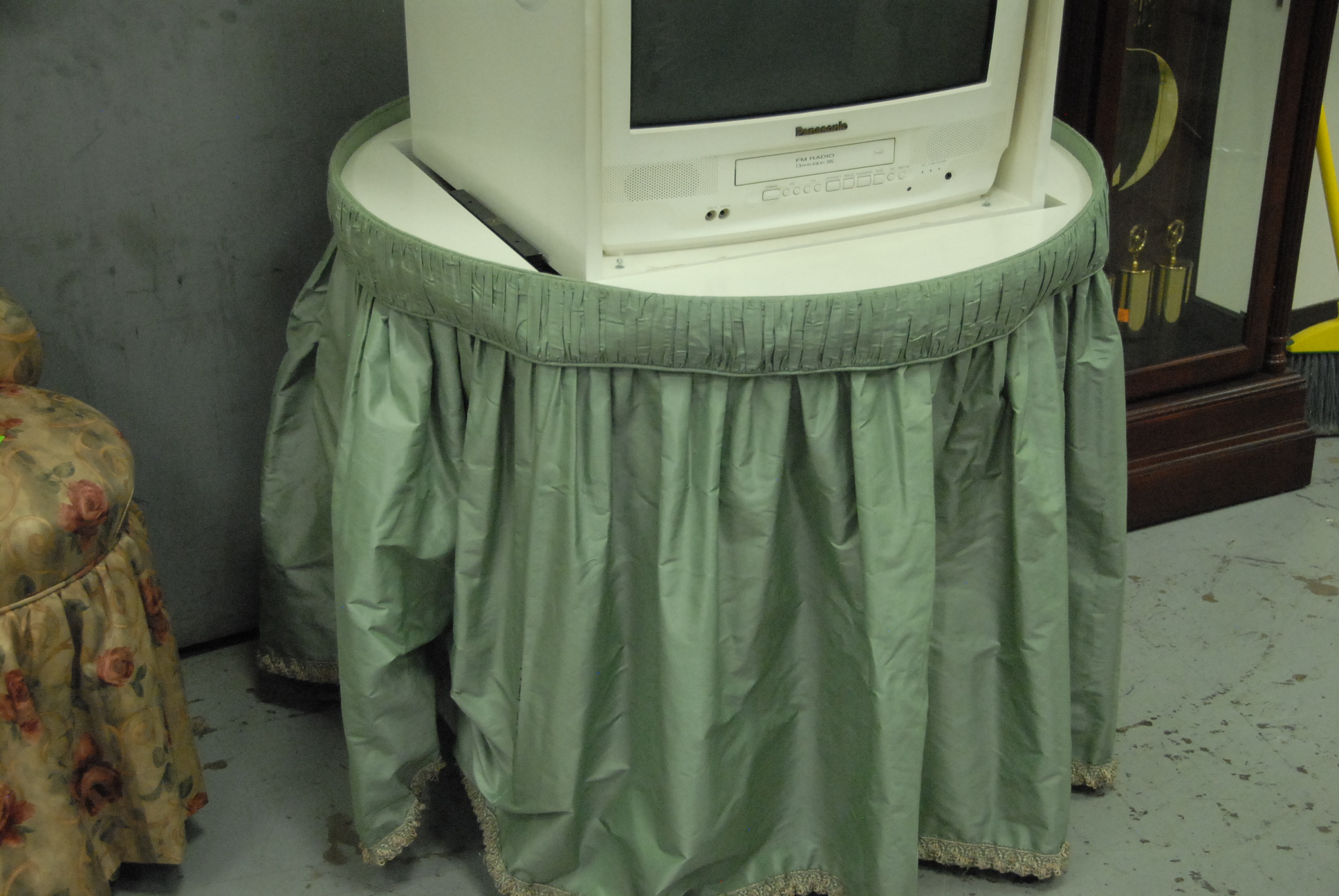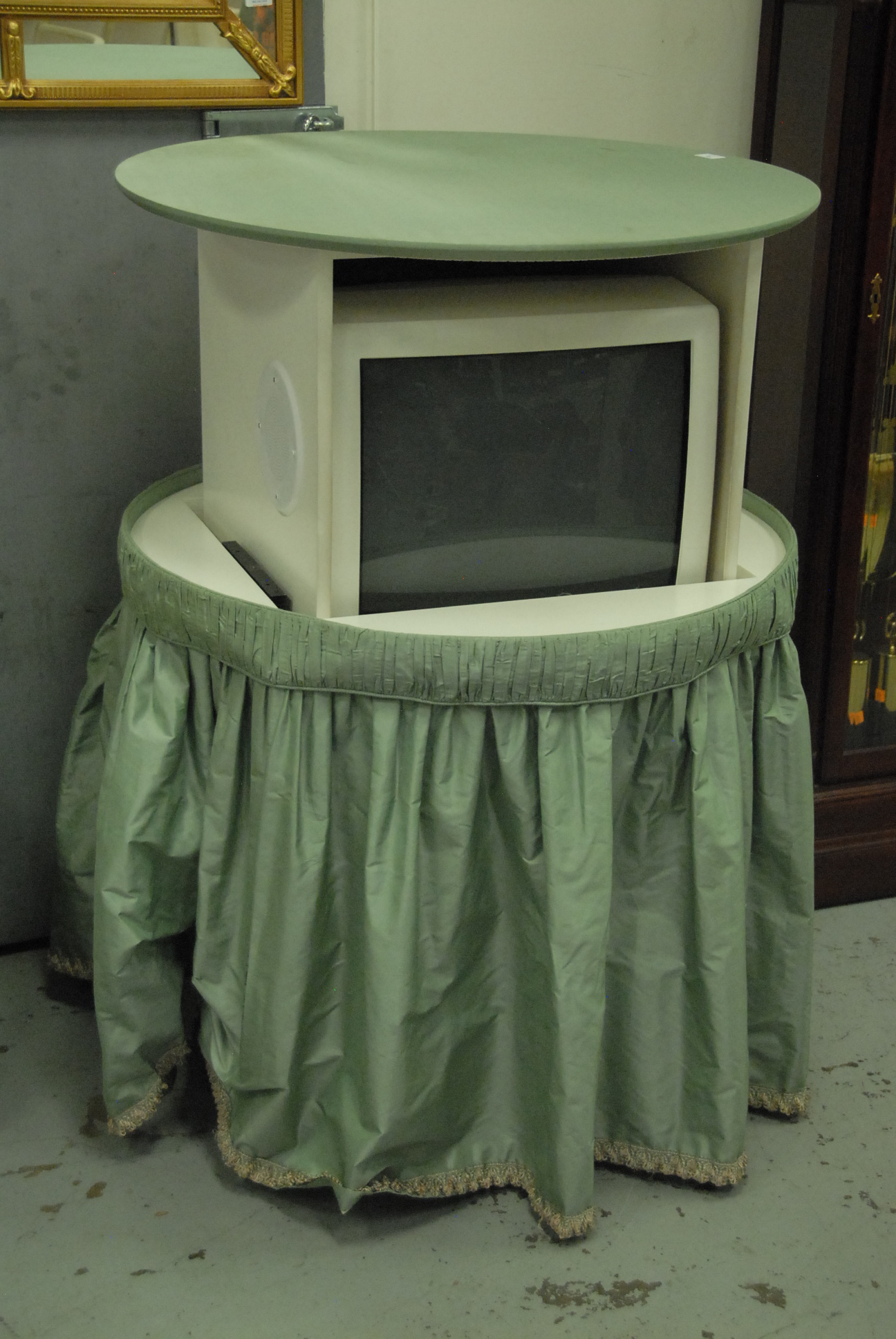 Auton Motorized System satin upholstered table with rising remote controlled television.