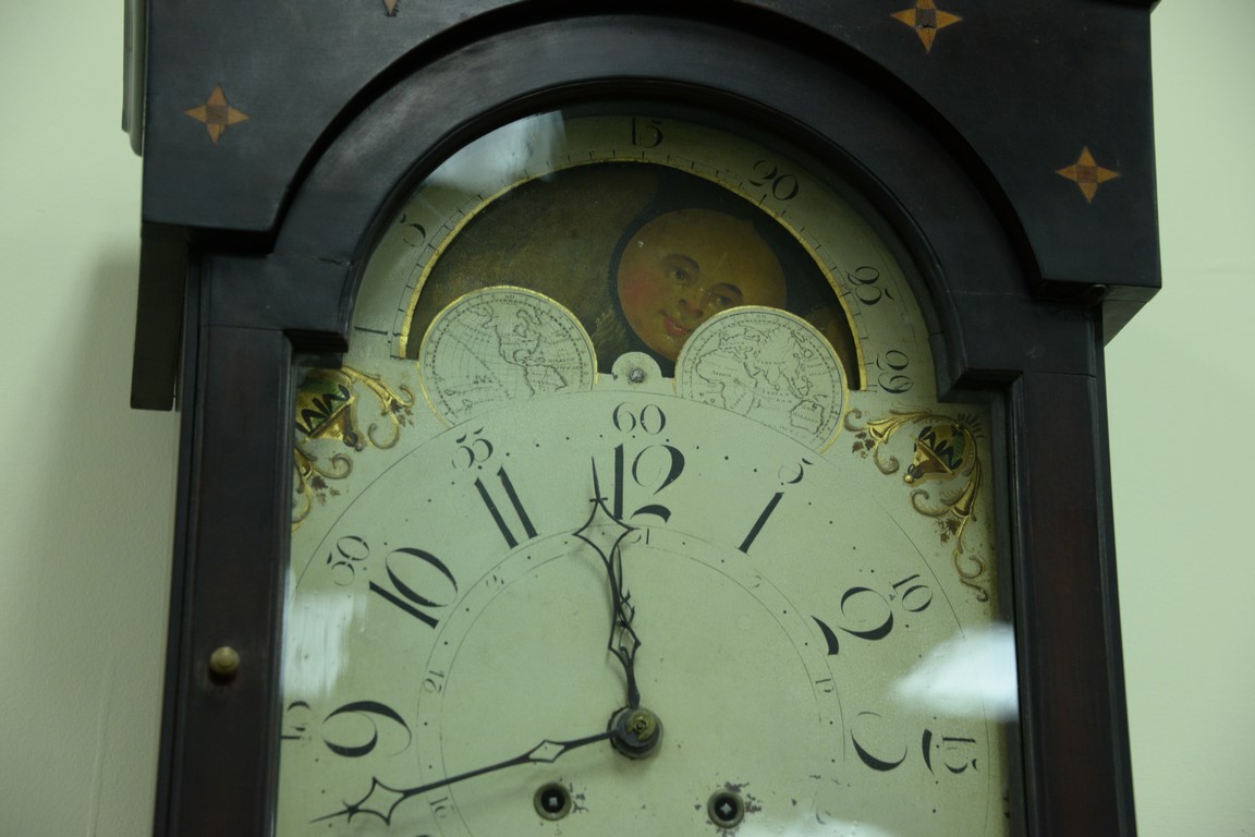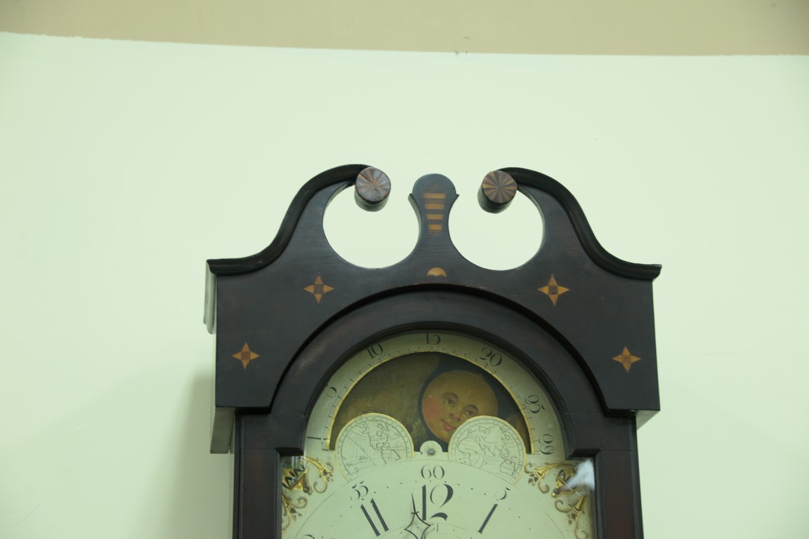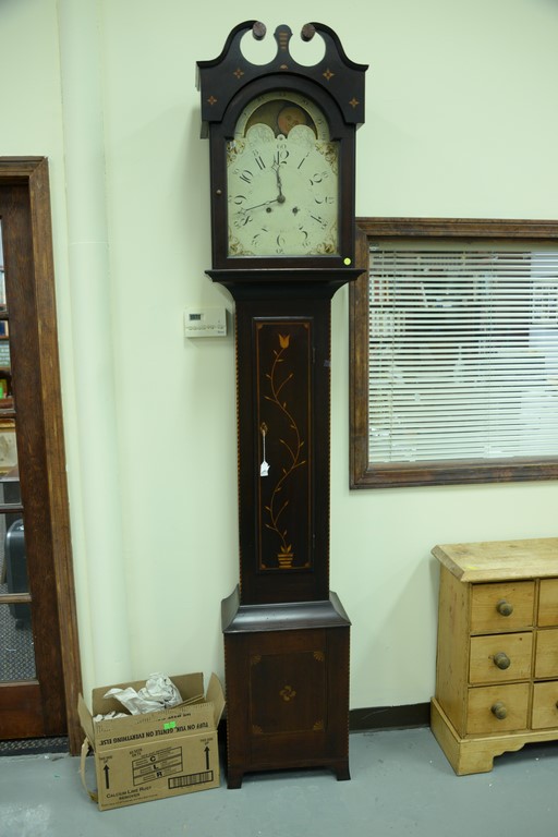 Cherry tall case clock having broken arch top over tombstone door over rectangular door with floral and vine inlay on base with pinwheel and fan inlays flanked by stripe inlay ending in bracket feet, top with pinwheel and star inlay, tombstone painted metal dial with moon phases and brass works, circa 1780.
