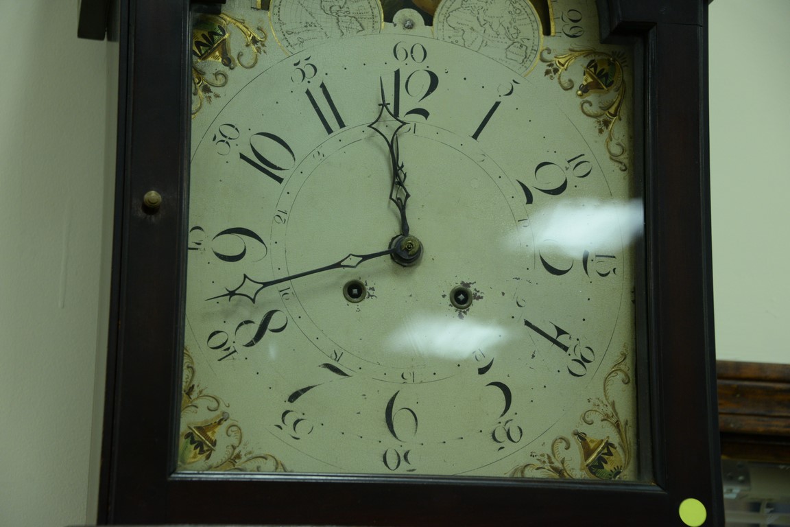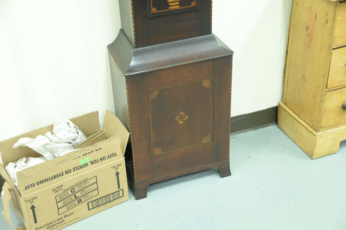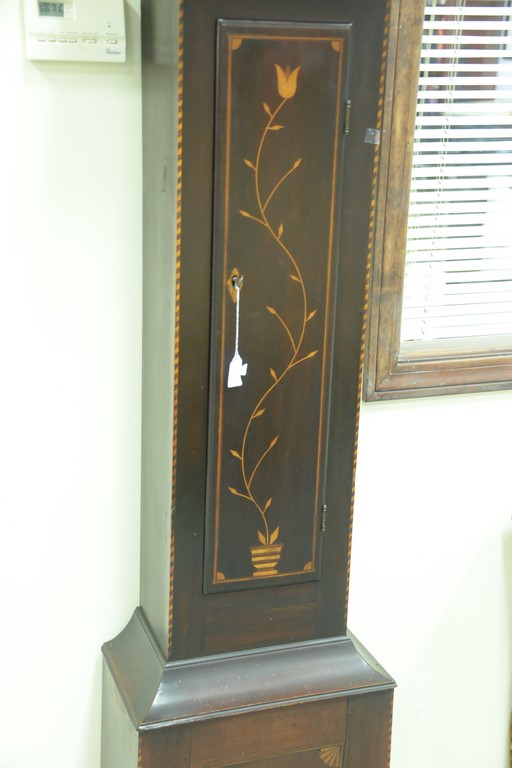 Lot 78: Cherry tall case clock having broken arch top over tombstone door over rectangular door with floral and vine inlay on base with pinw…
