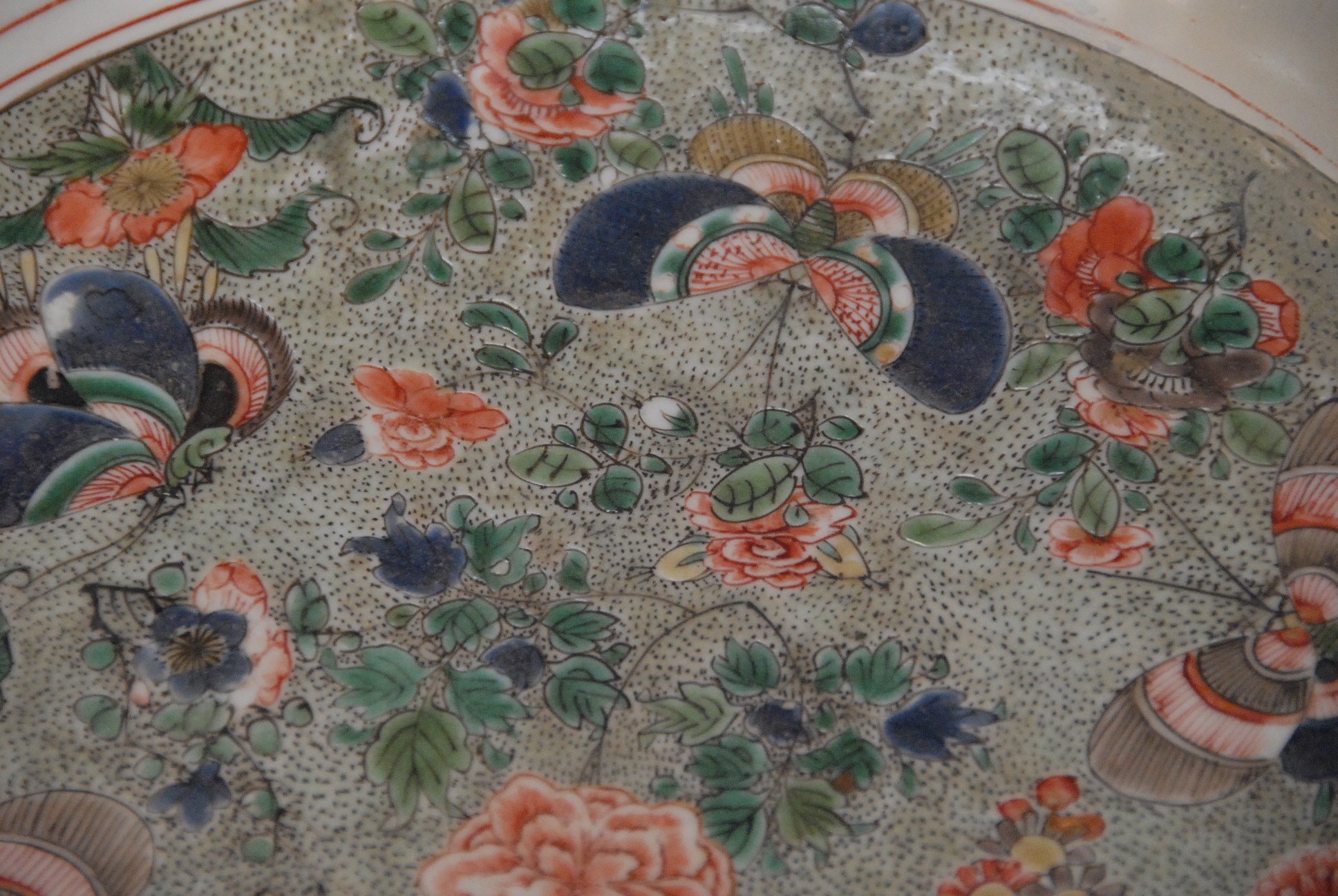 Lot 78: Chinese Export famille rose enameled porcelain charger decorated with butterflies, late 19th century restored. dia. 14 1/2in.