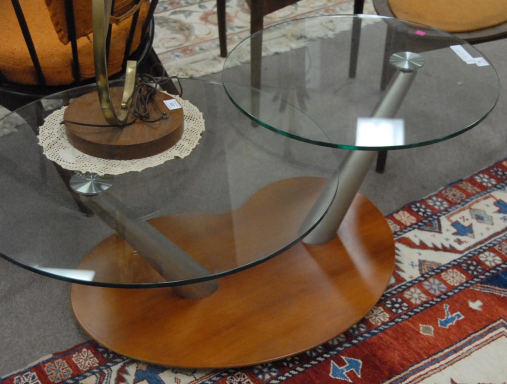 Contemporary double glass revolving coffee table, ht. 18in. lg. 46in.