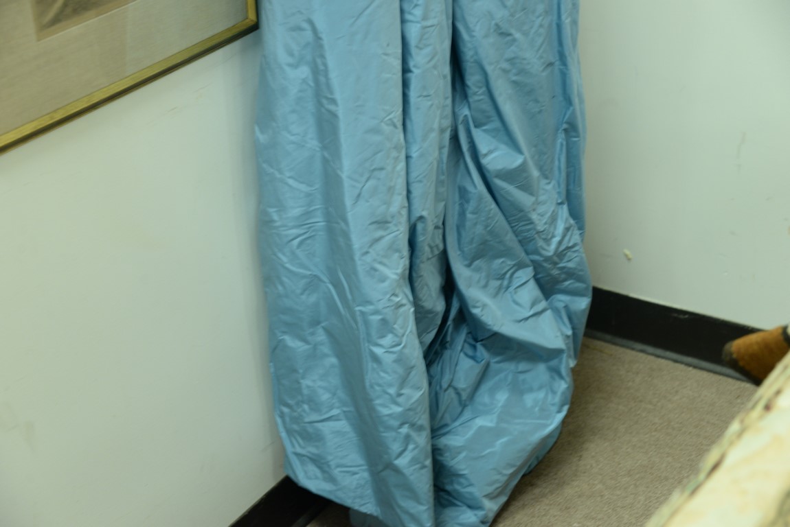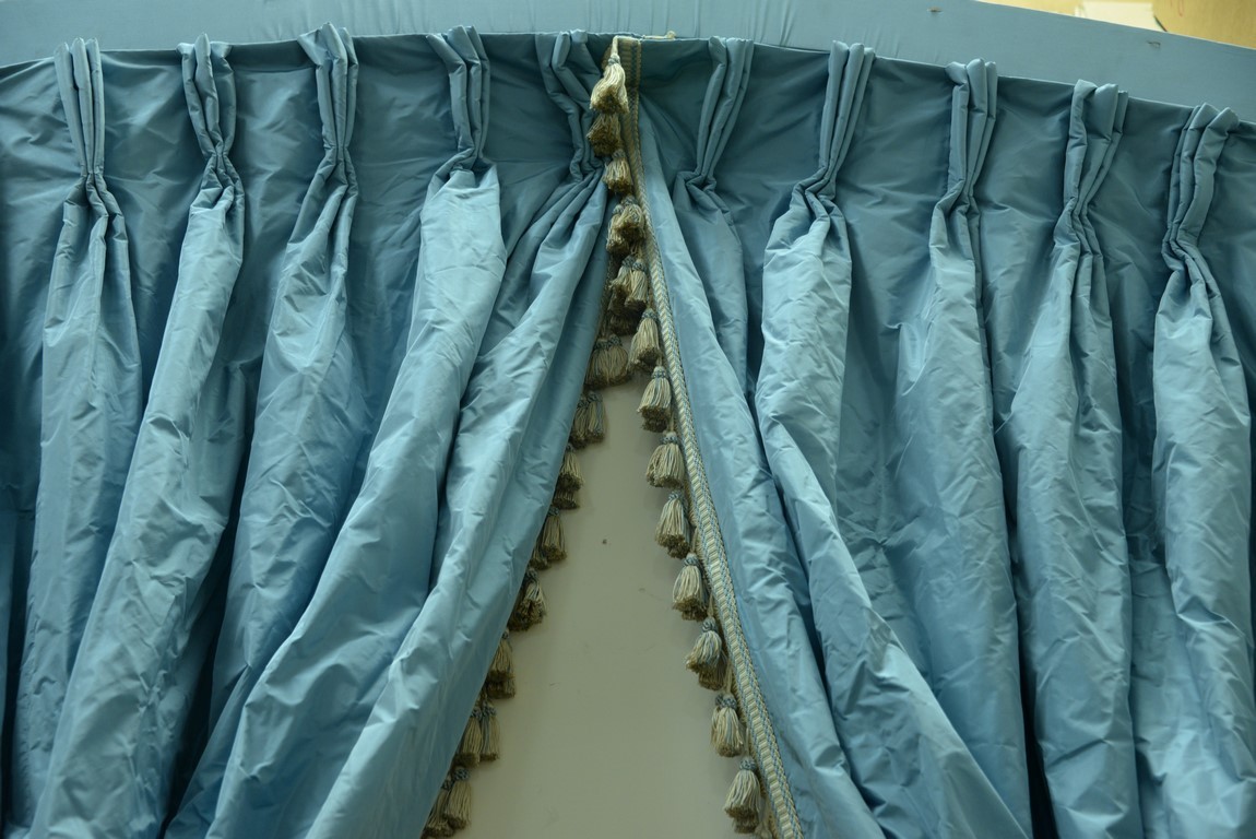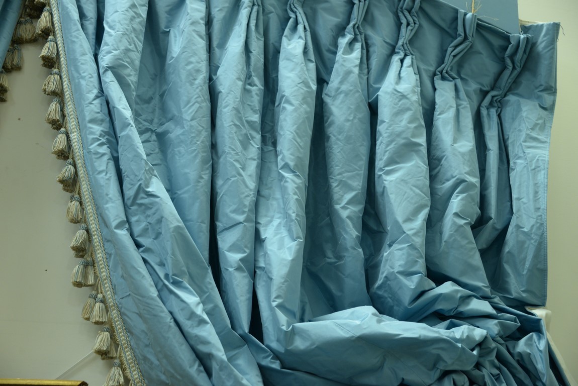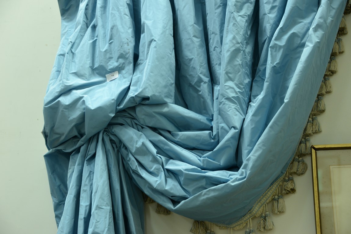 Lot 78: Custom blue silk drapes, lined curtains , window or door treatment. approximate measurements: lg. 98in., wd. 72in. Provenance: From…