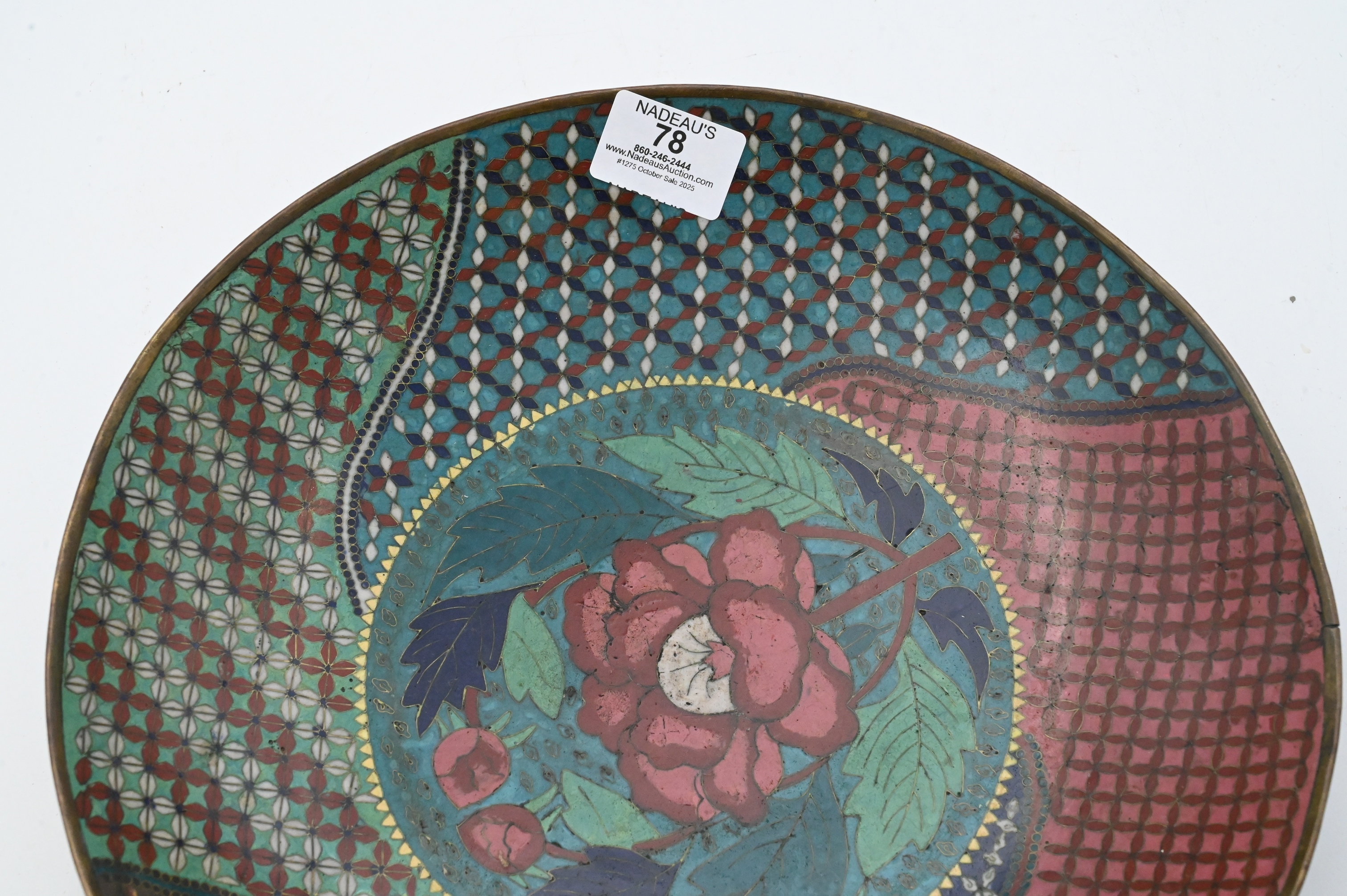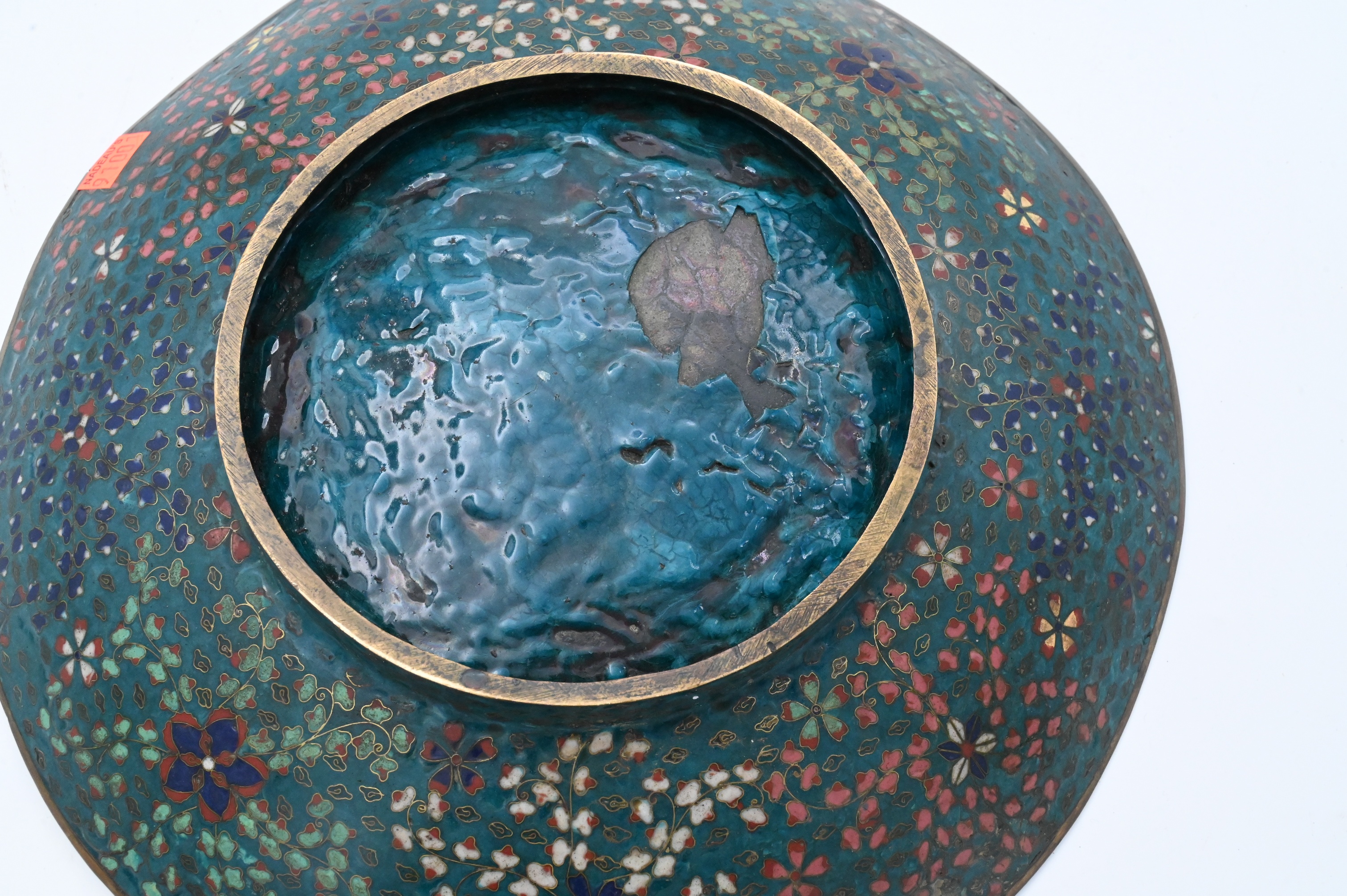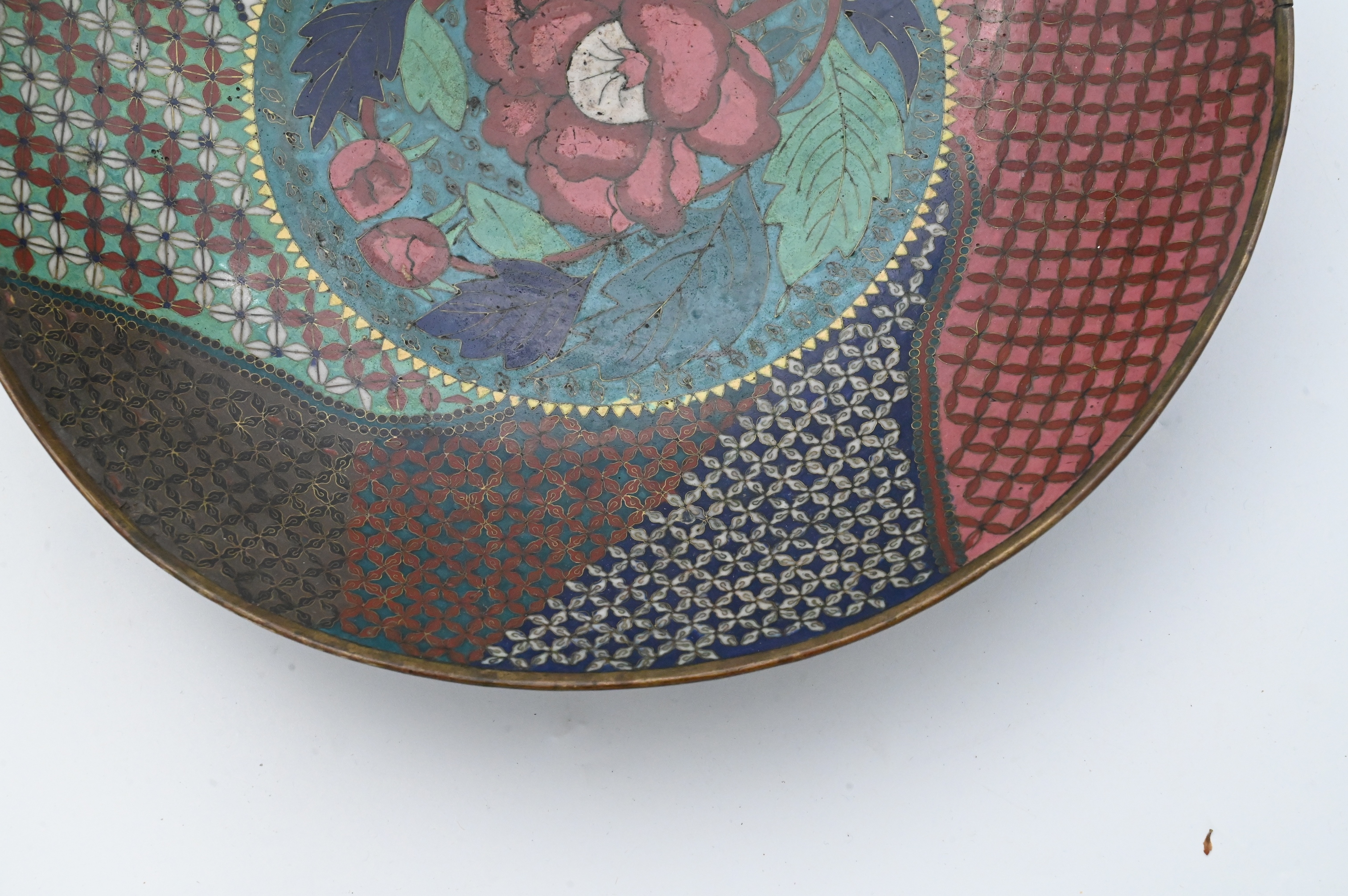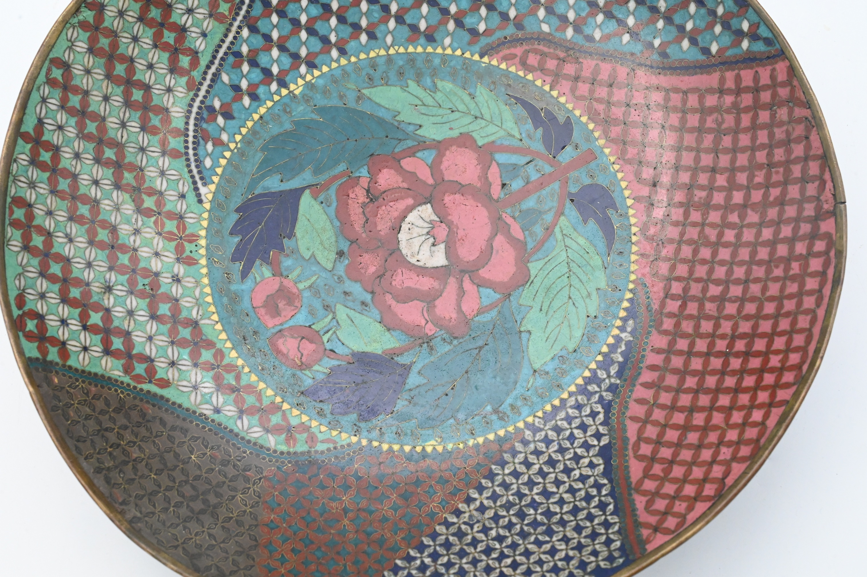 having central chrysanthemum floral design surrounded by polychrome enamel swirl motif