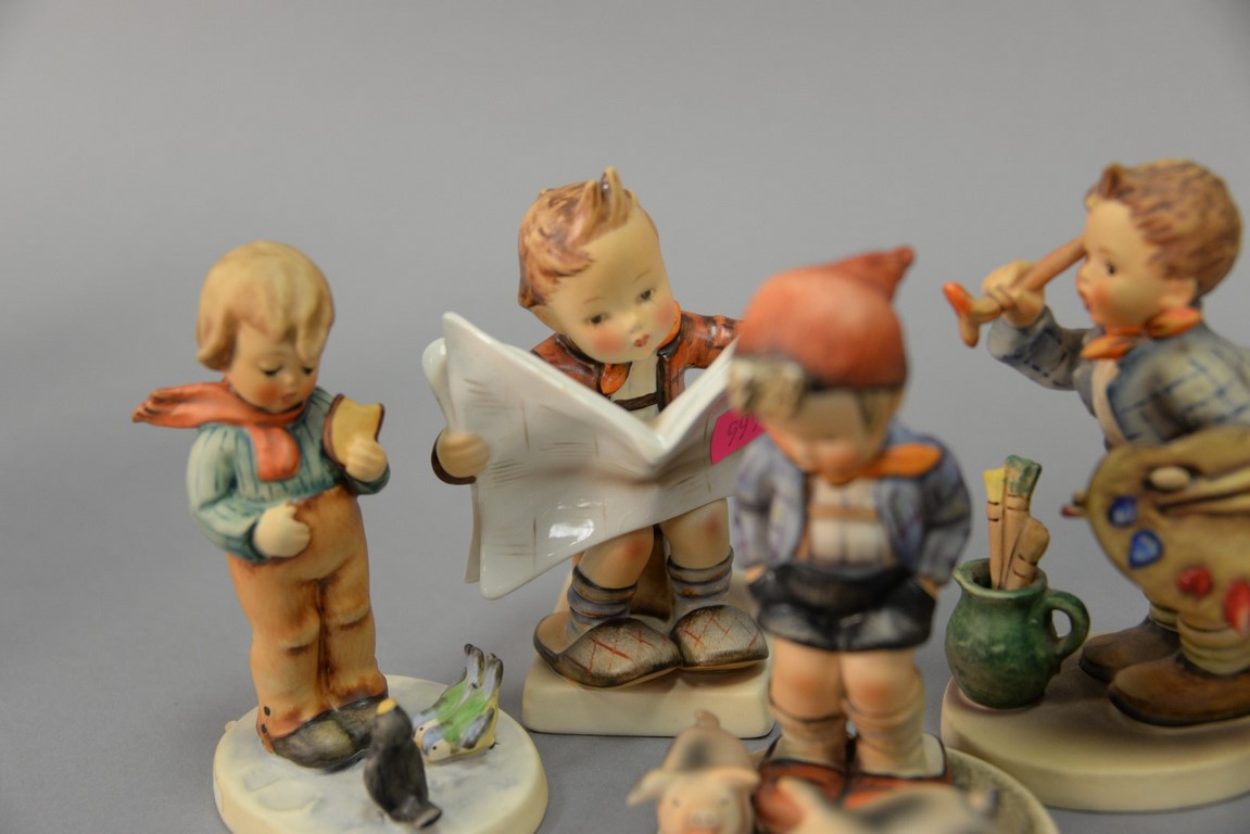 Lot 78: Five boy Hummel figurines including Farm Boy #66, Little Bookkeeper #306, Bird Watcher #300, #134, and #304. ht. 4 1/2 in. to …