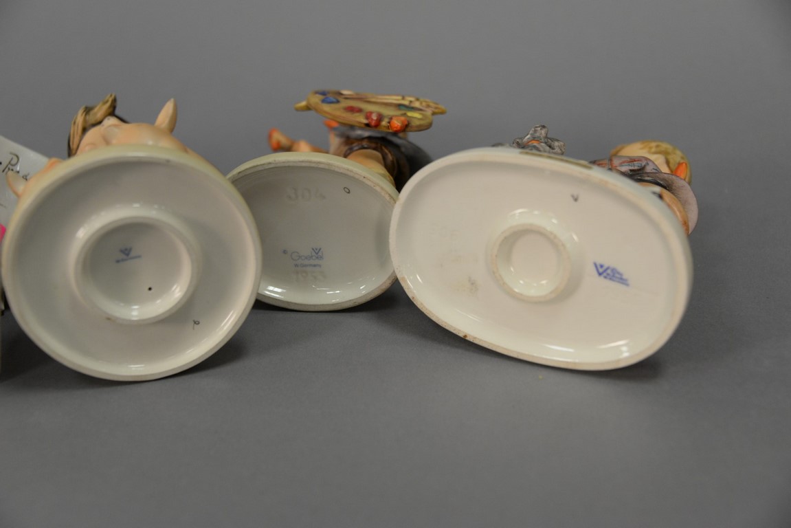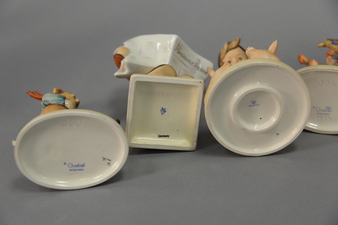 Five boy Hummel figurines including Farm Boy #66, Little Bookkeeper #306, Bird Watcher #300, #134, and #304. ht. 4 1/2 in. to ht. 5 1/2 in.