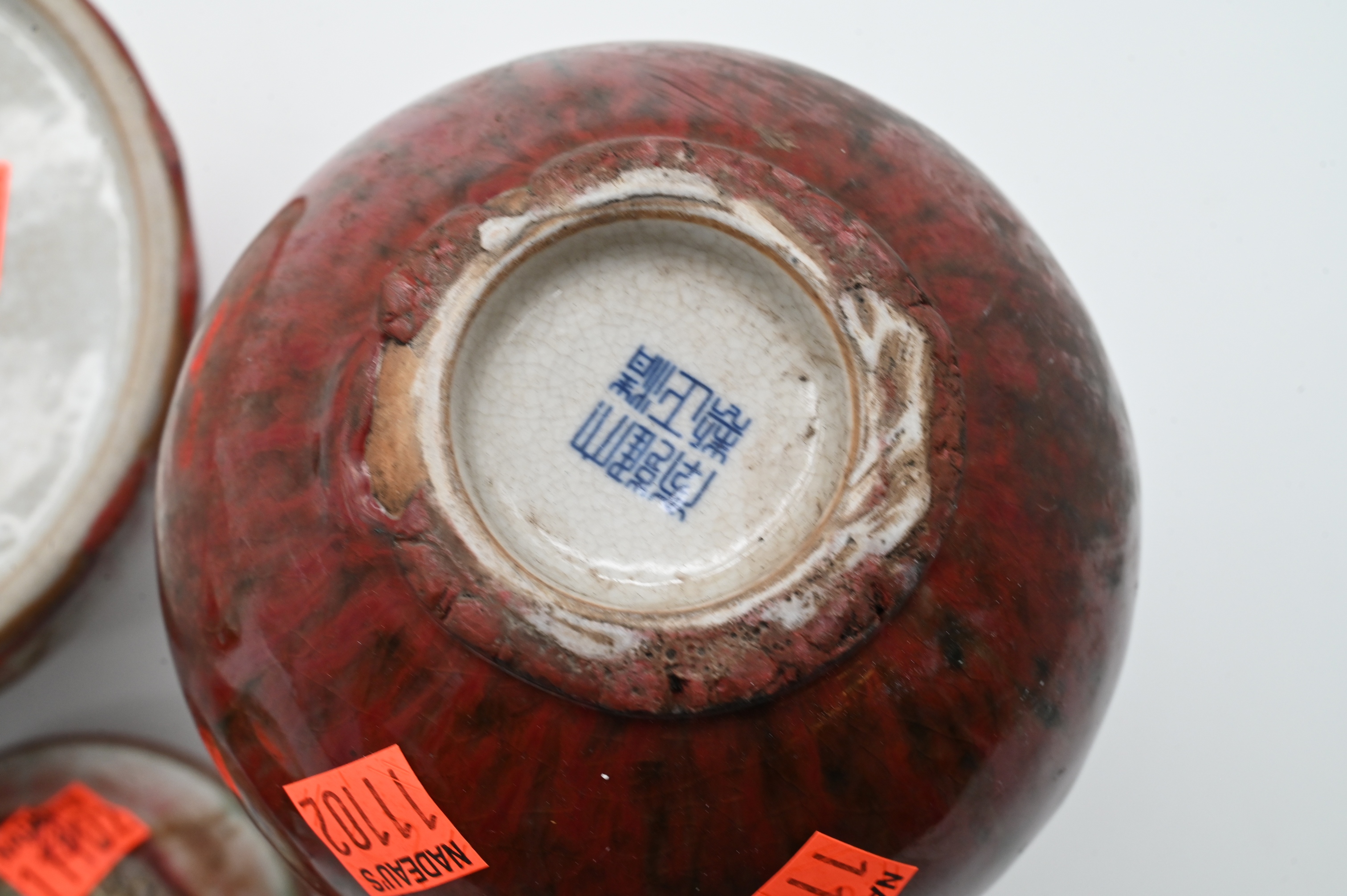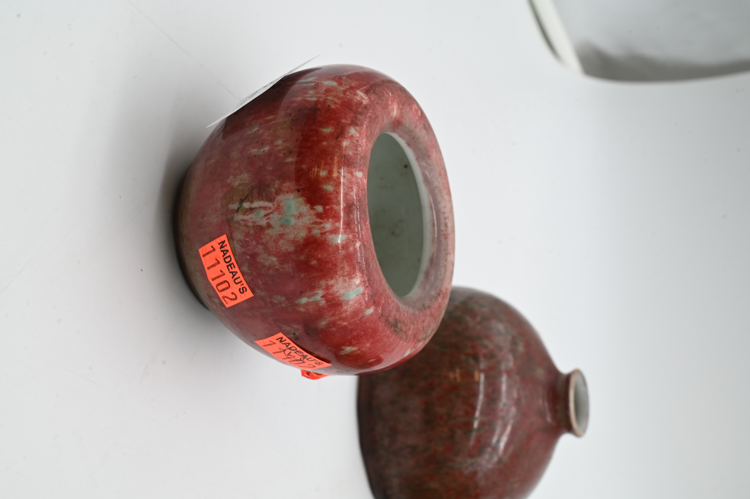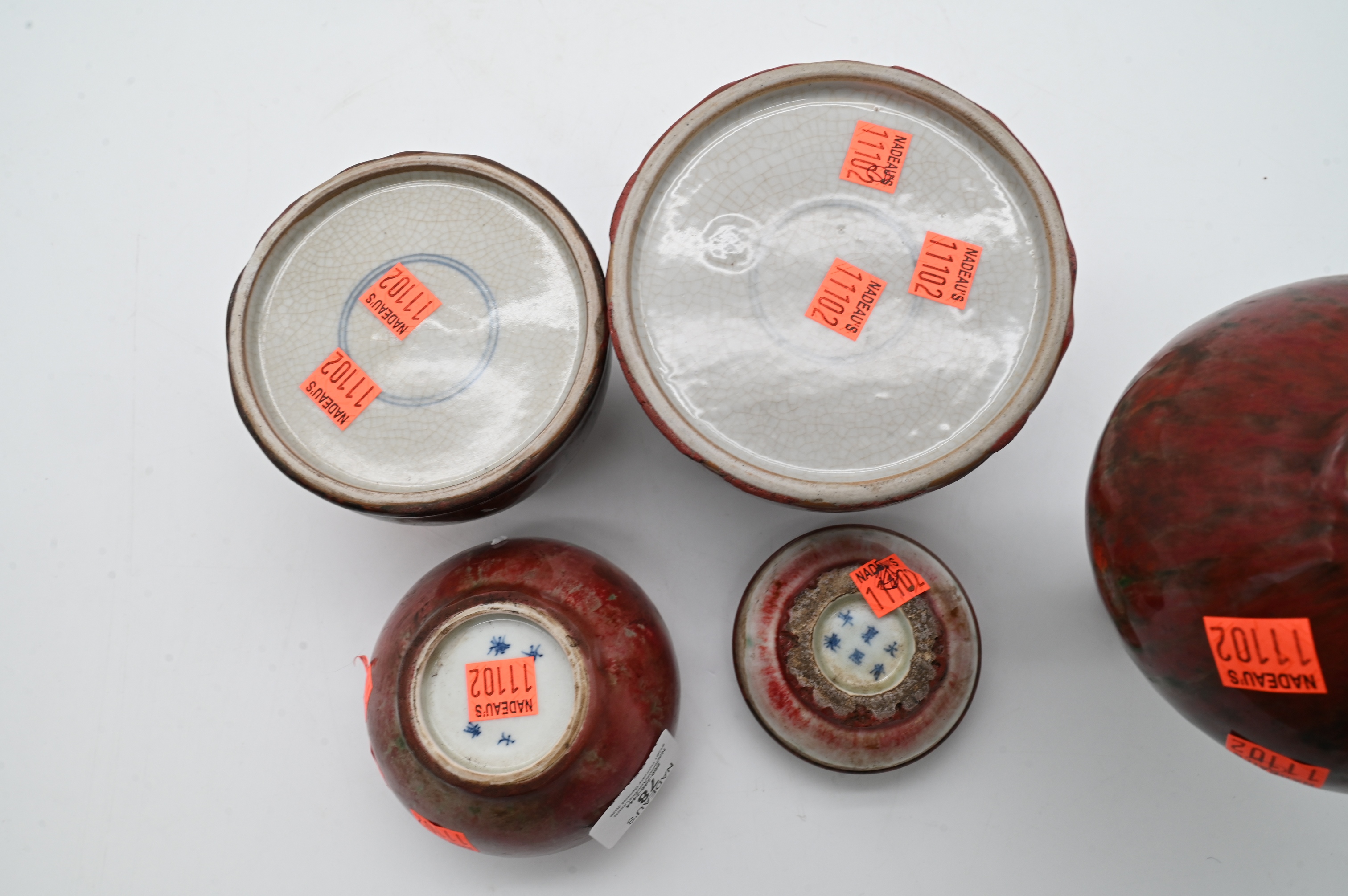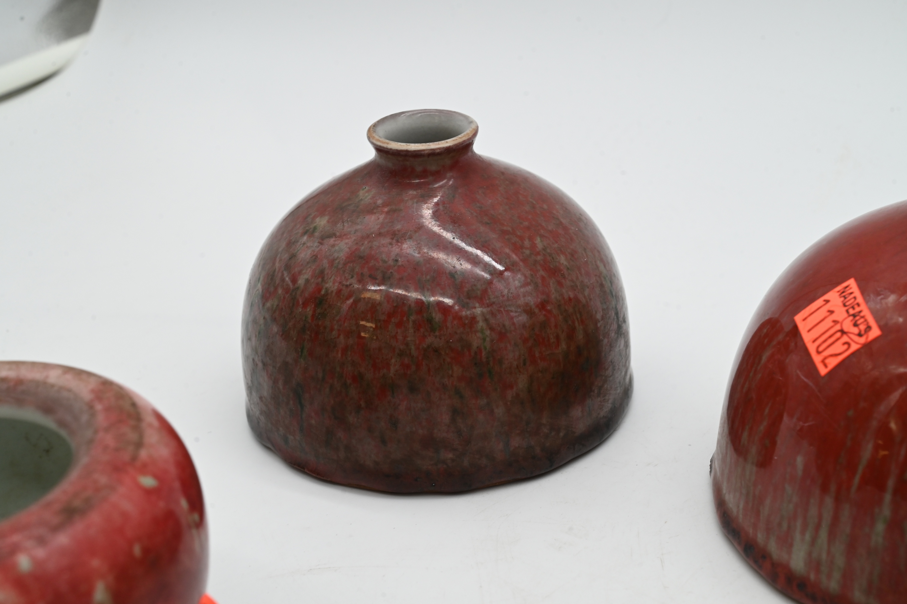 bottle neck vase having green flambe glaze accents, small lidded ink paste jar, two squat beehive water pots, along with brush washer, marked on underside