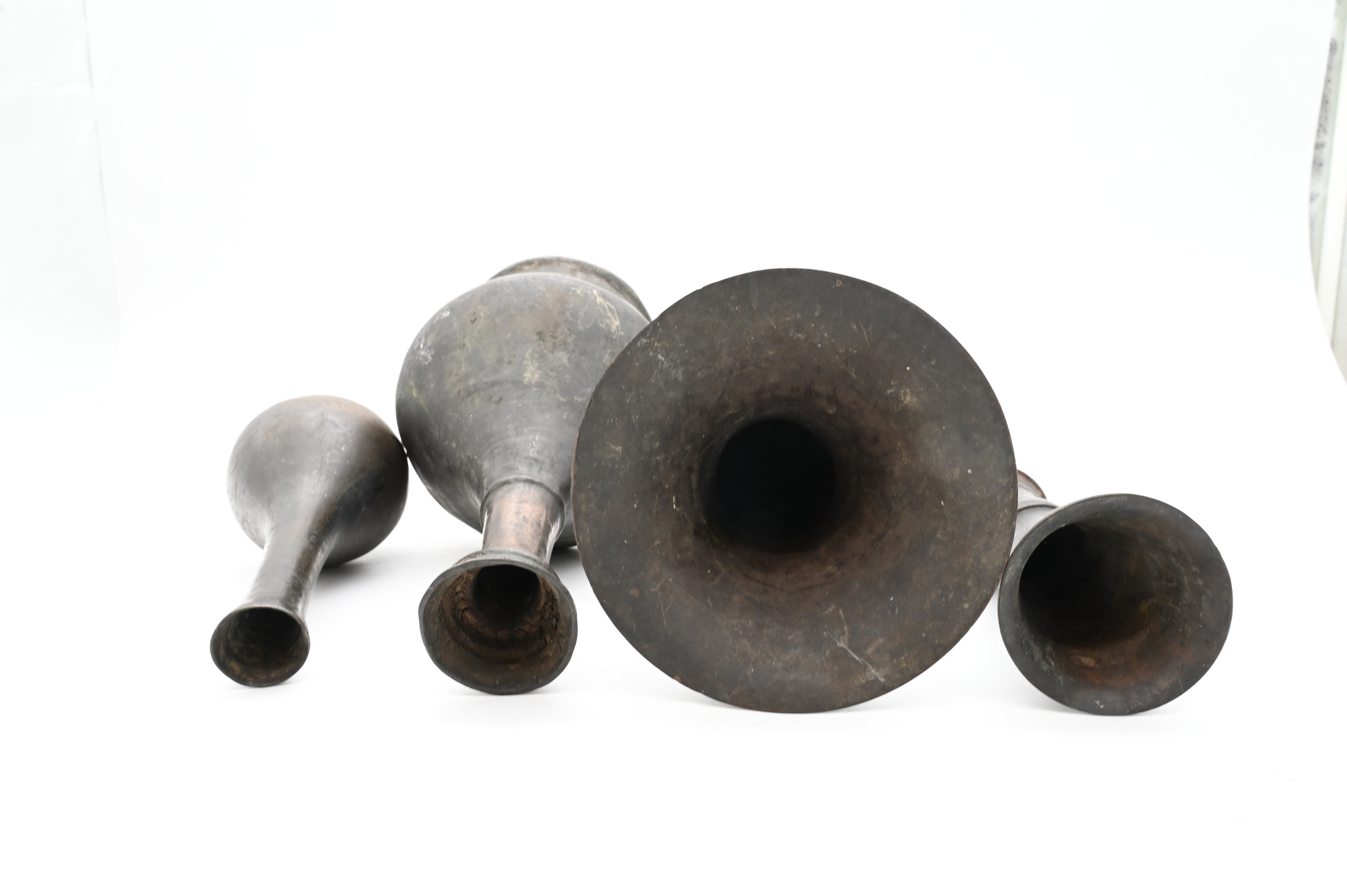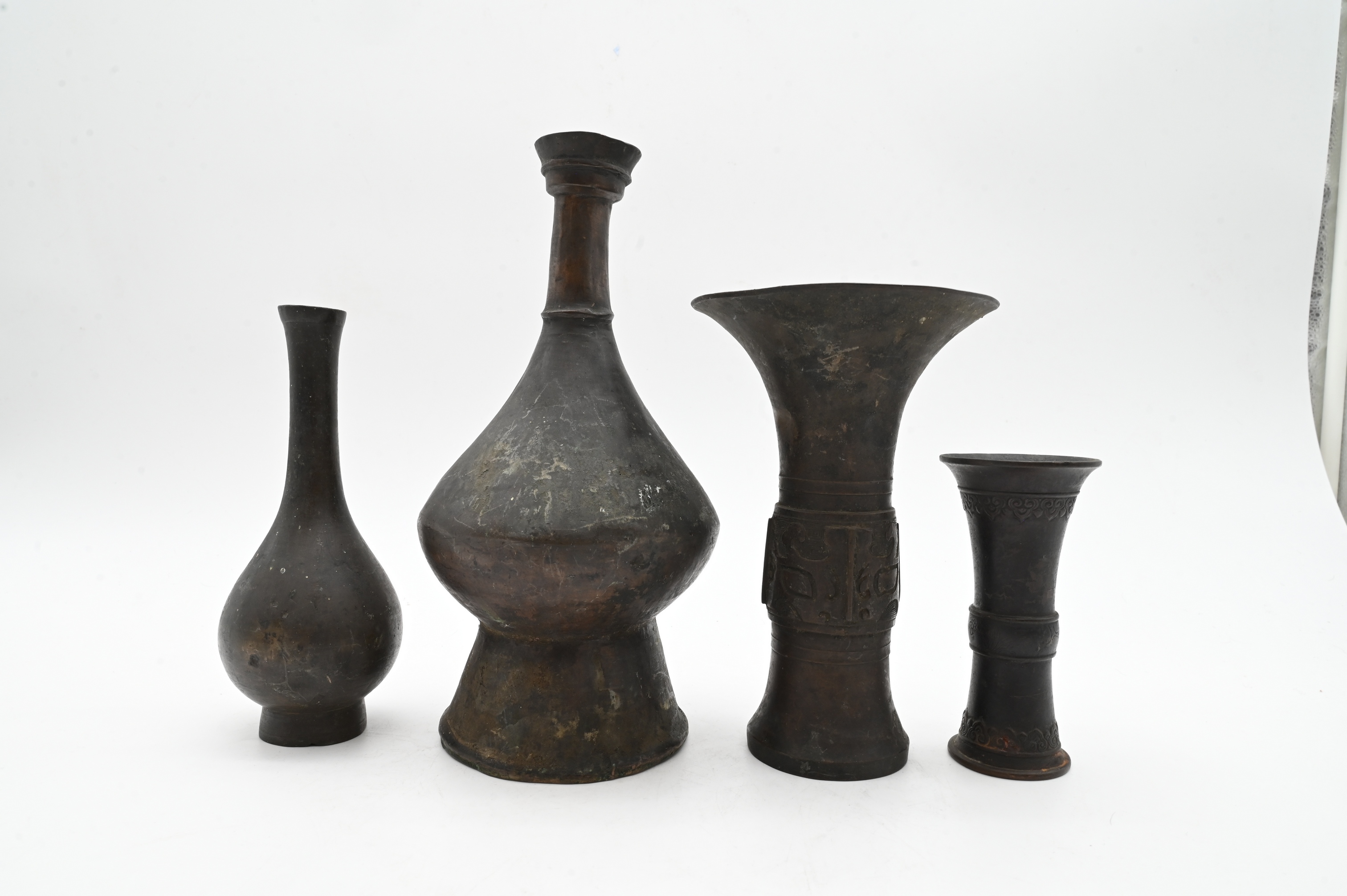 group of four bronze vases of varying bottle and trumpet forms, showing surface wear and patina consistent with age.