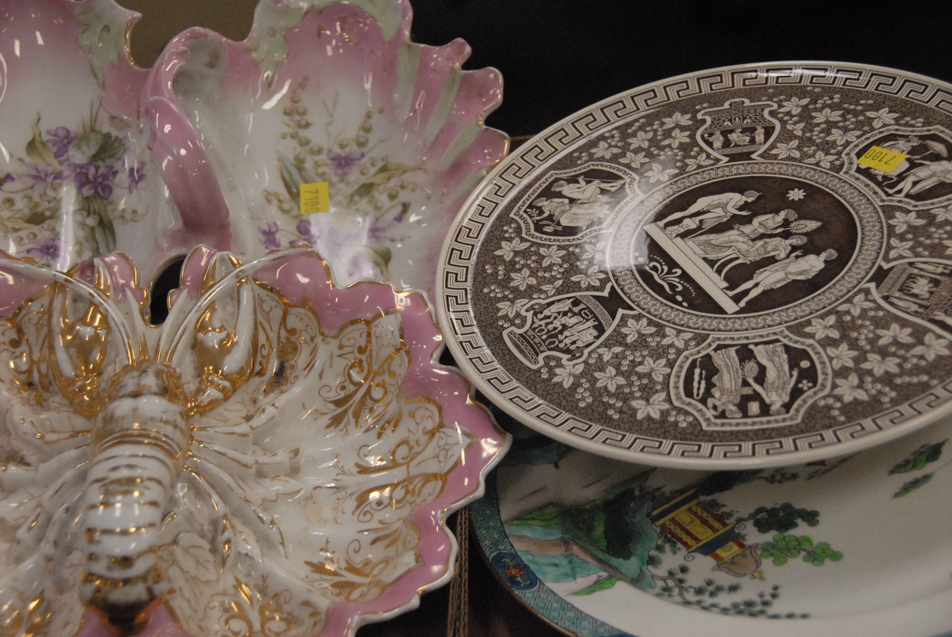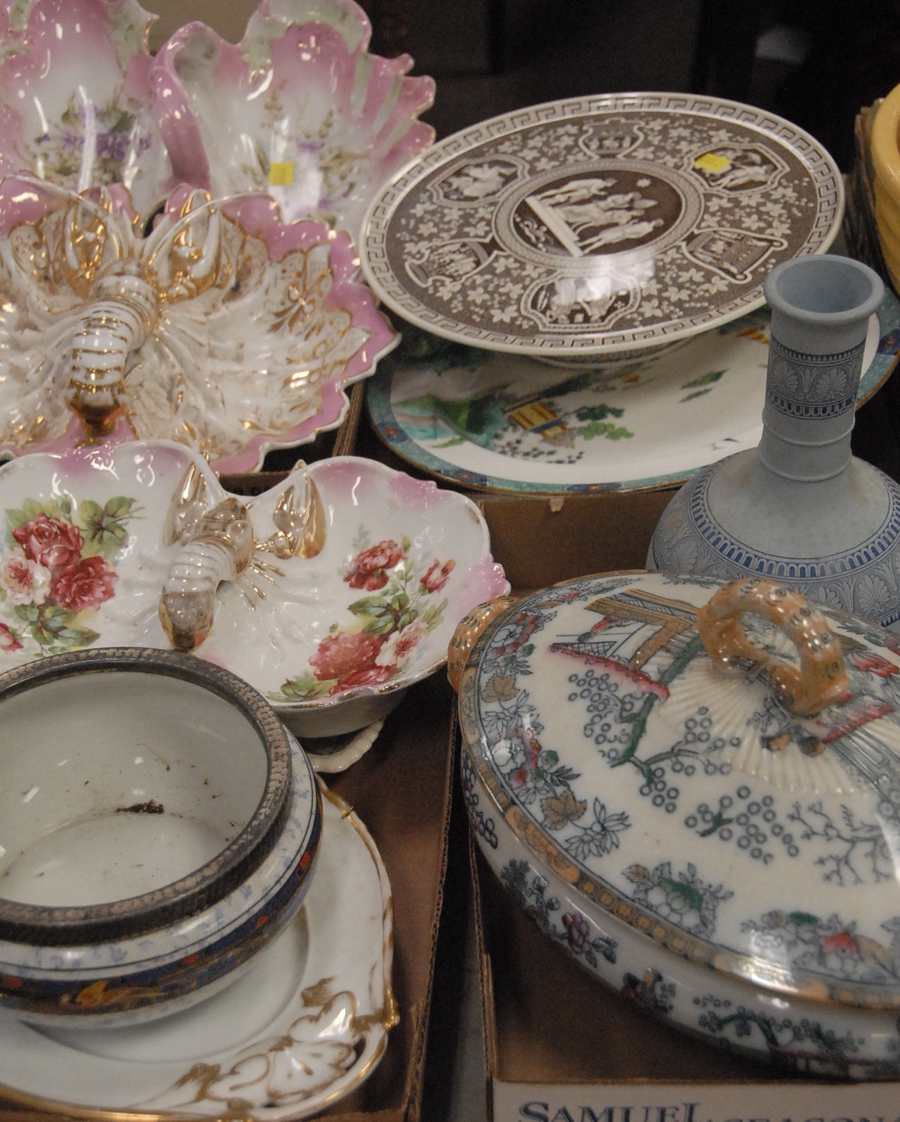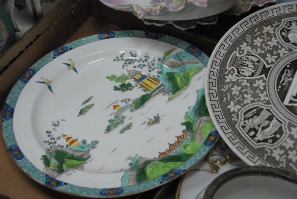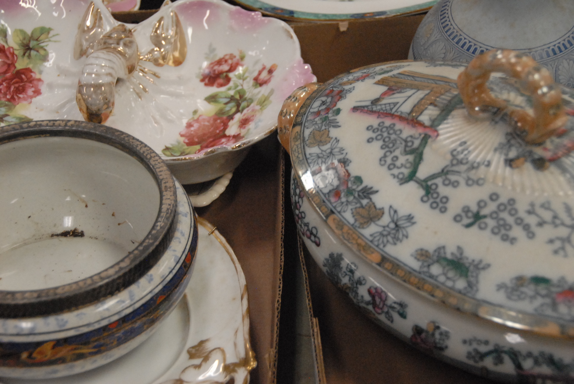 Lot 78: Four boxes of porcelain to include two lobster serving double dishes, large tureen, and cake plate.