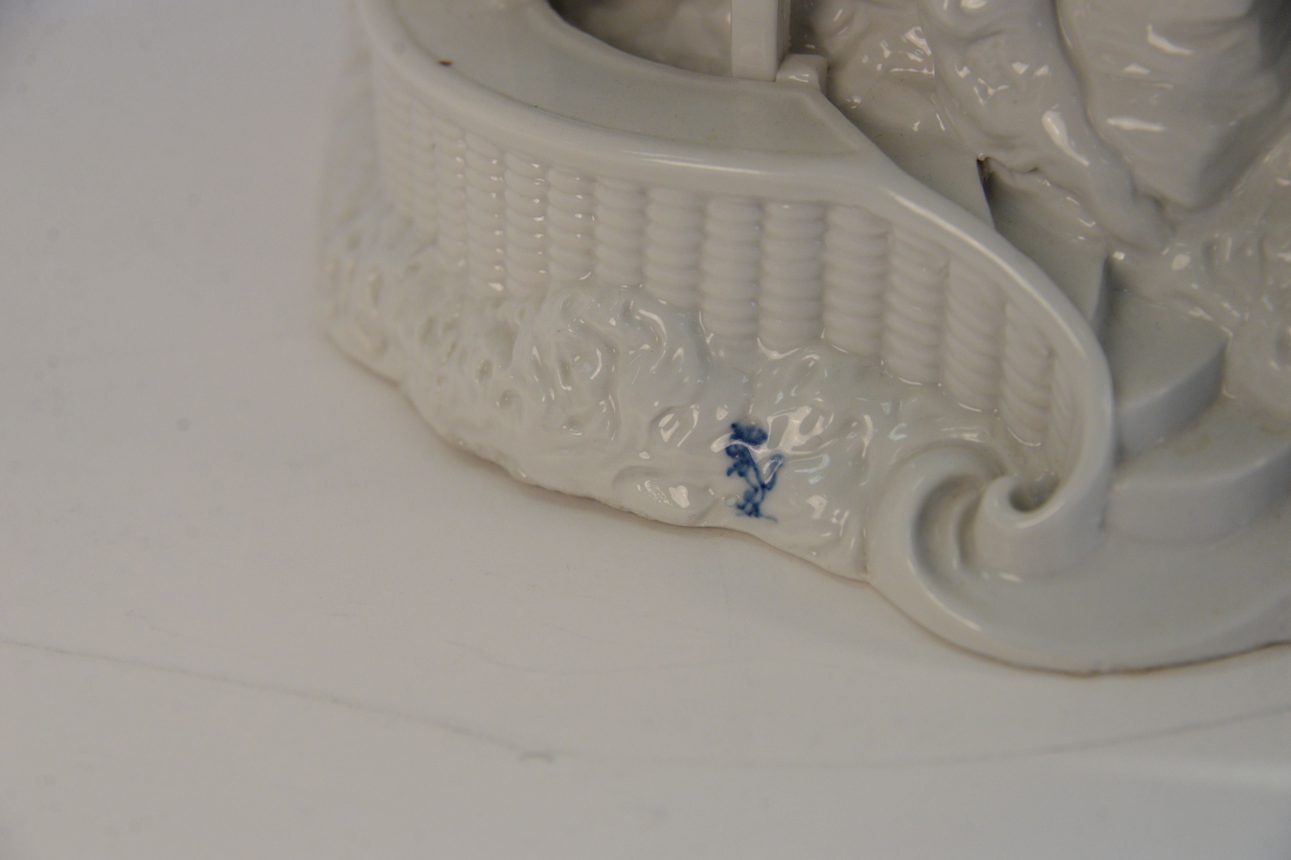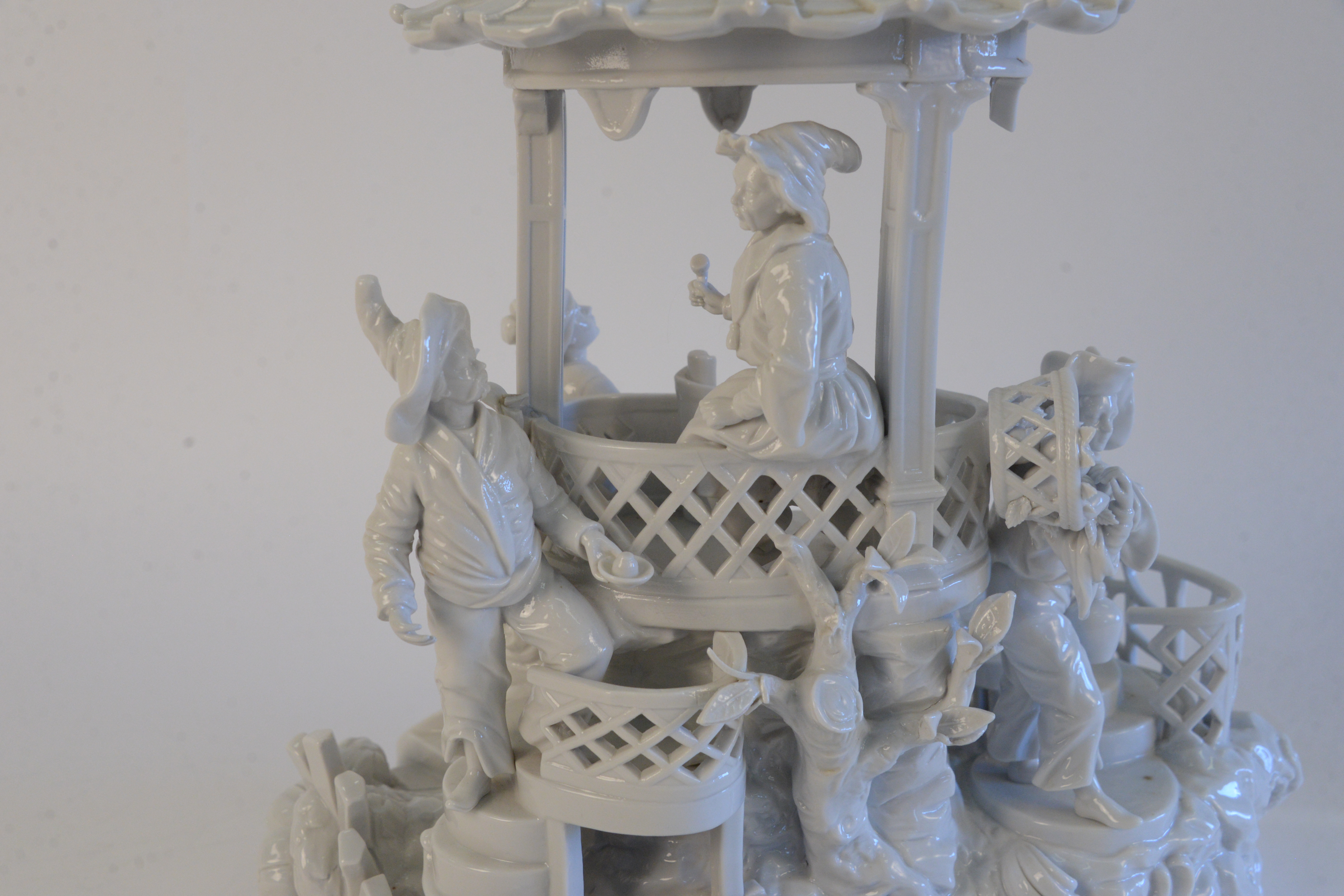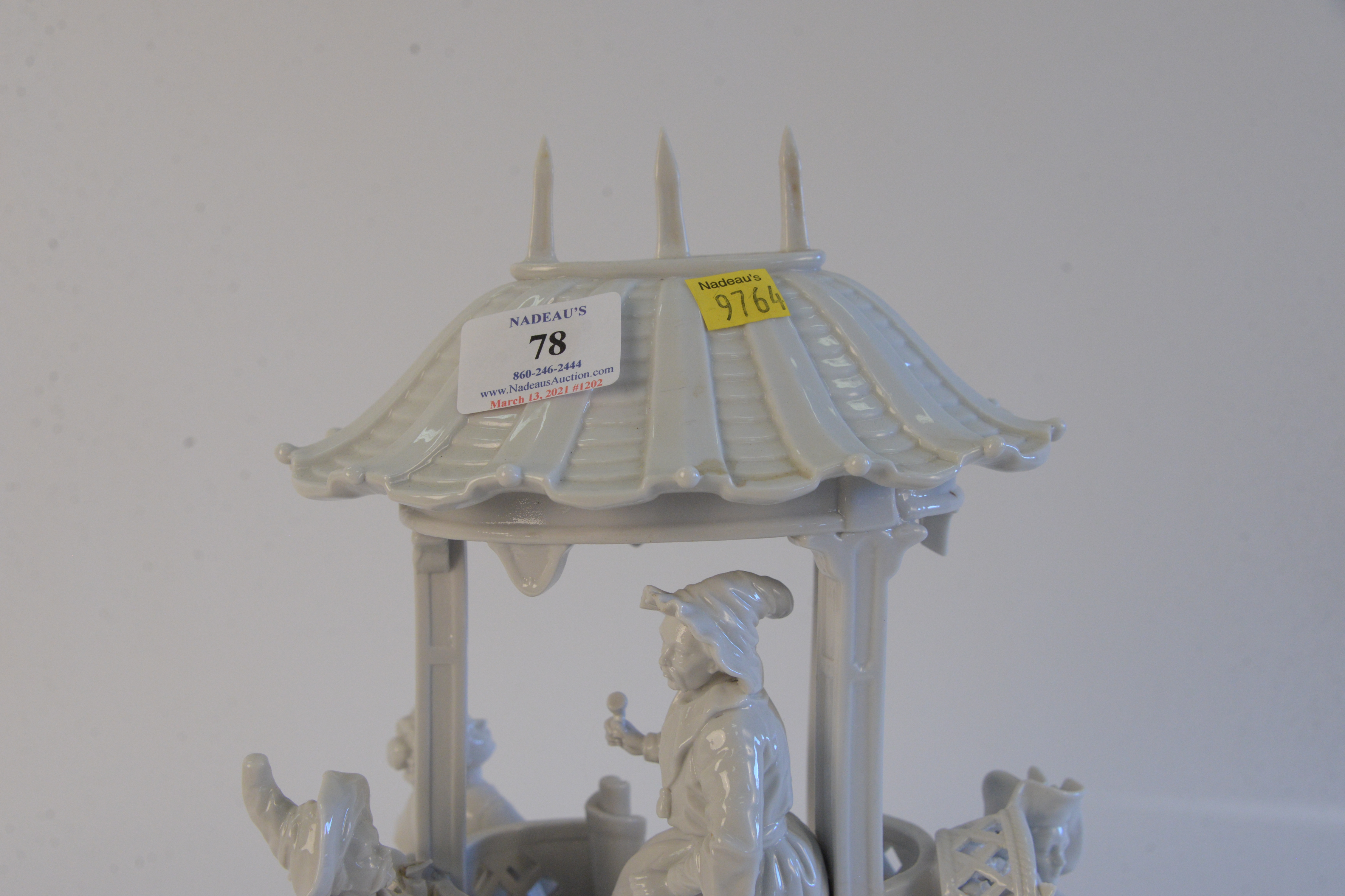 German Porcelain Group, people in gazebo, blue mark on back, height 13 1/2 inches.