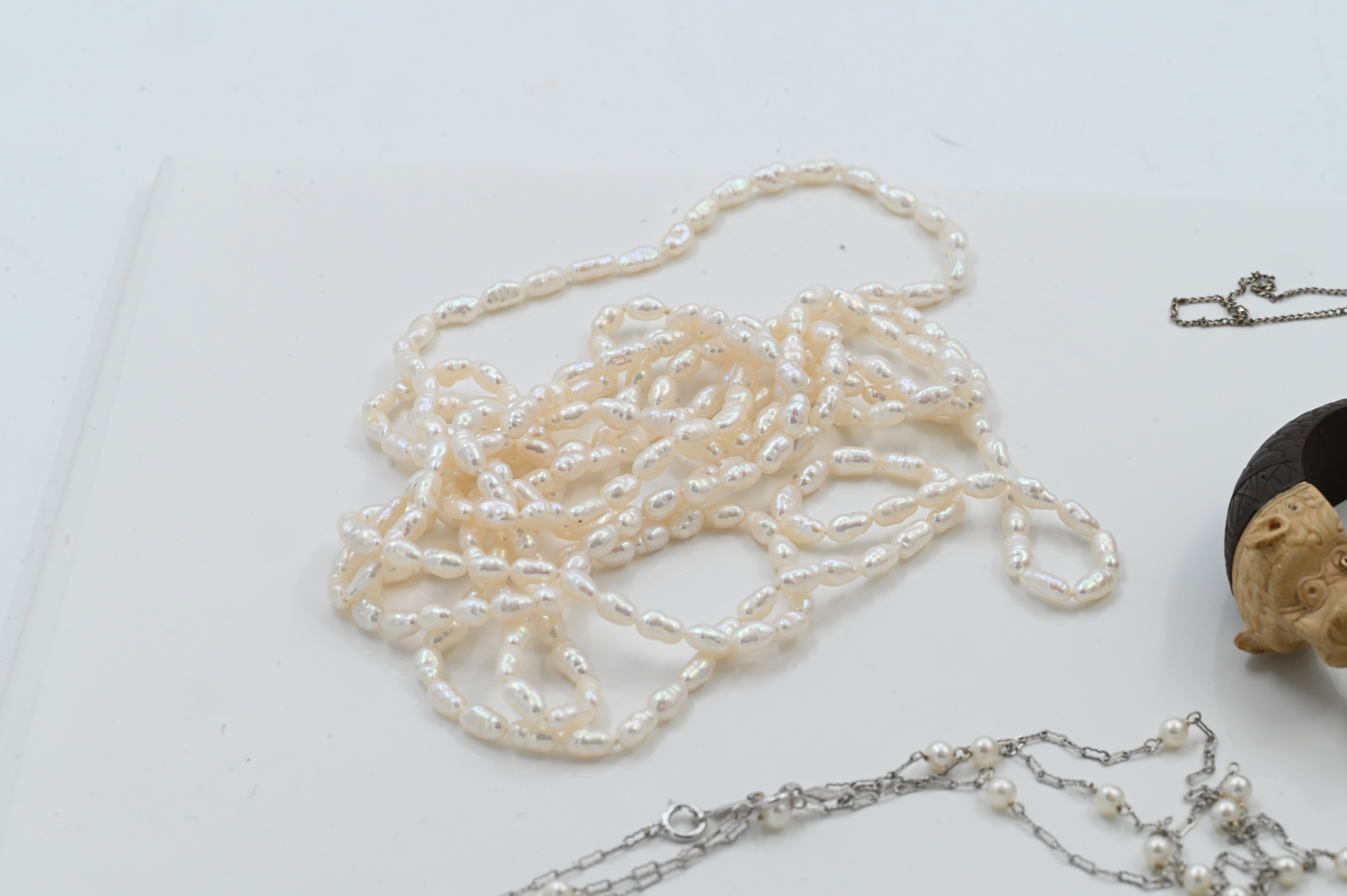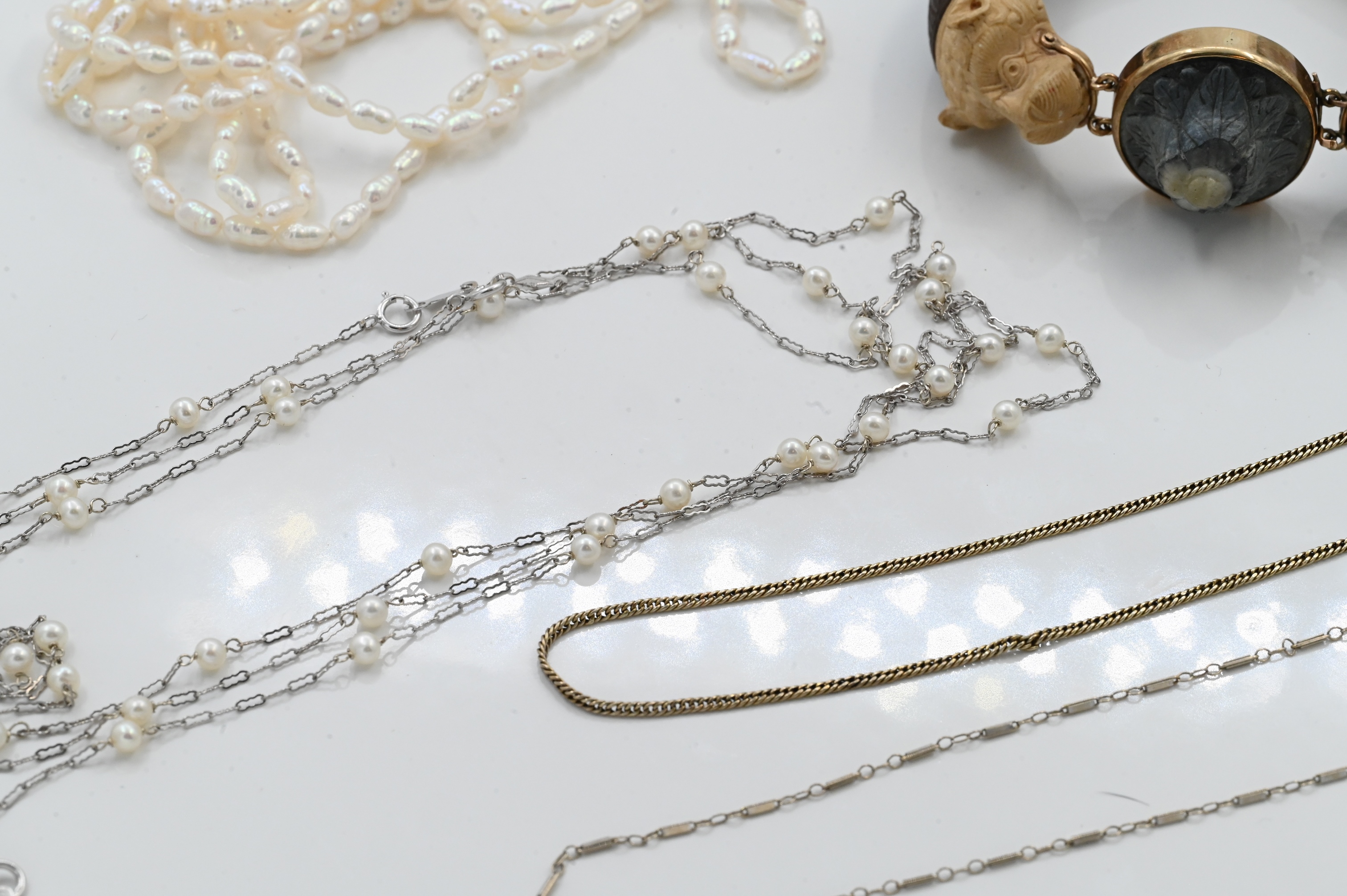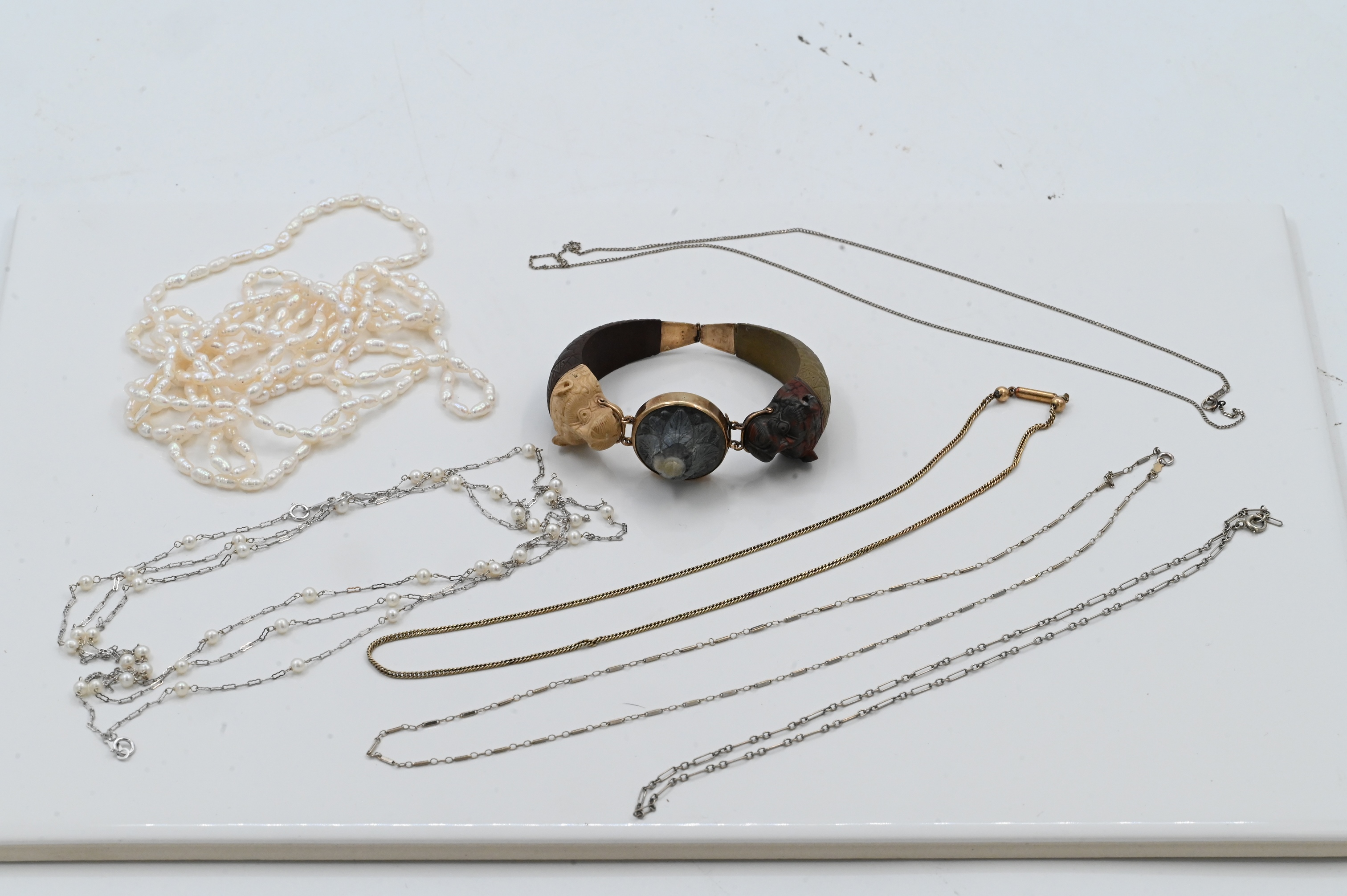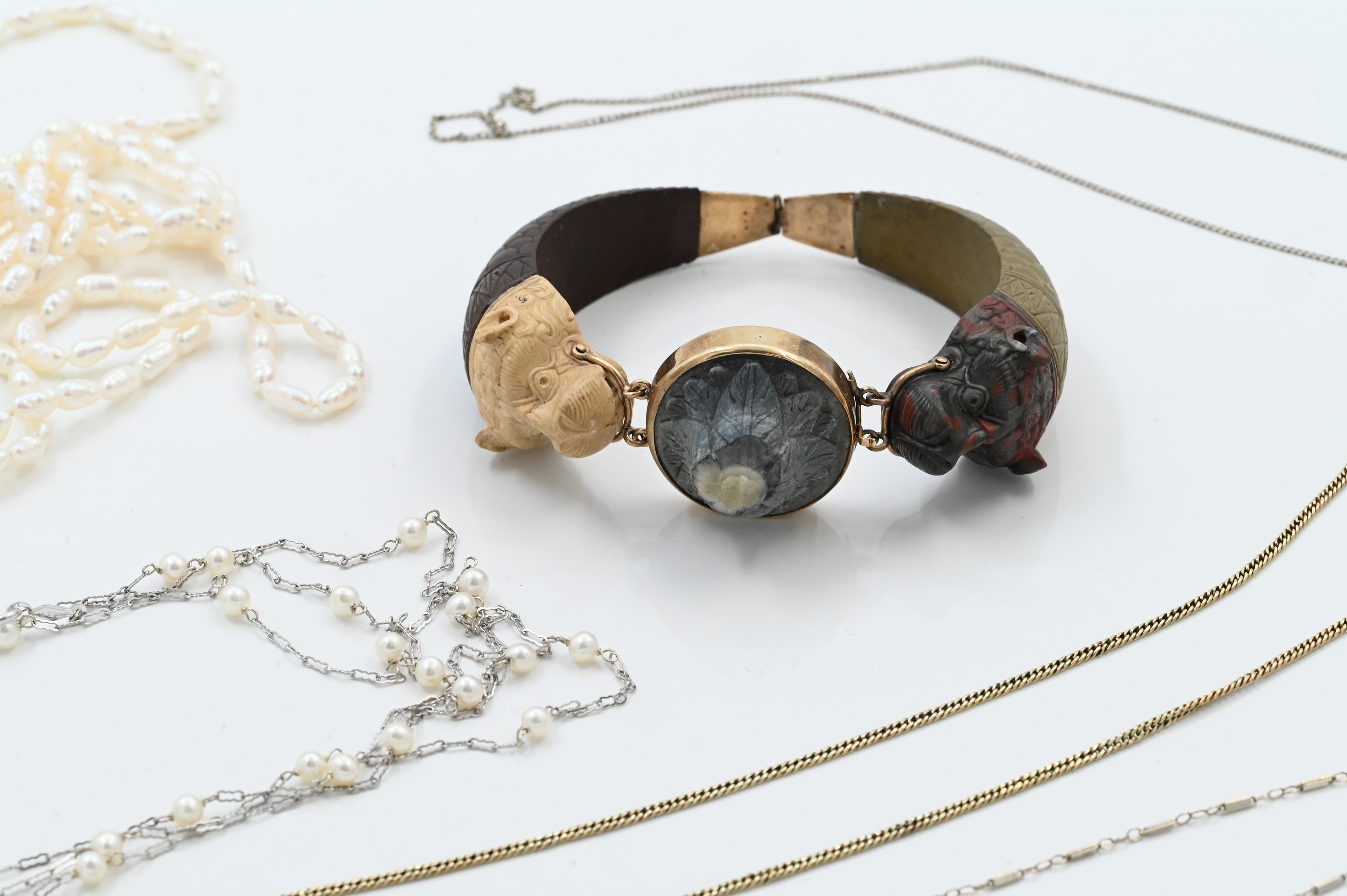 to include lava bracelet in animal form set in 9 karat yellow gold, freshwater pearl bracelet, 10 karat yellow gold necklace, three 14 karat white gold and pearl necklaces, three 14 karat white gold necklaces, 13.2 grams total weight at 14 karat, and 4.8 grams at 10 karat.