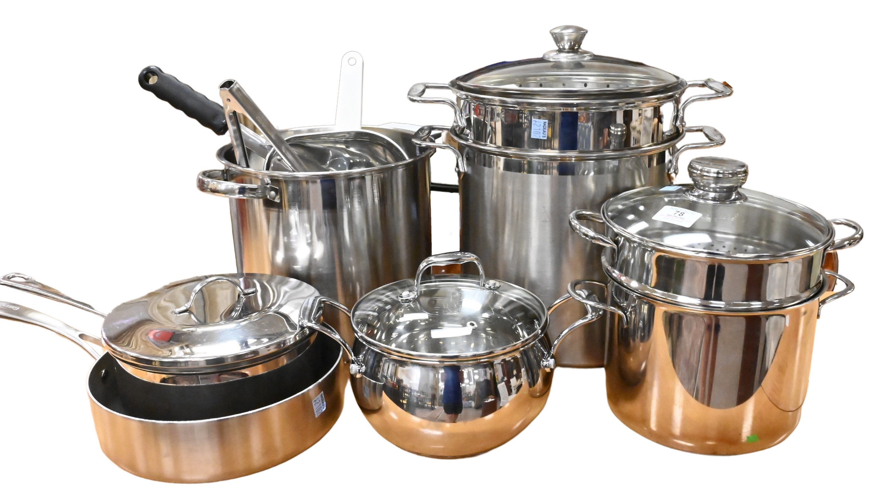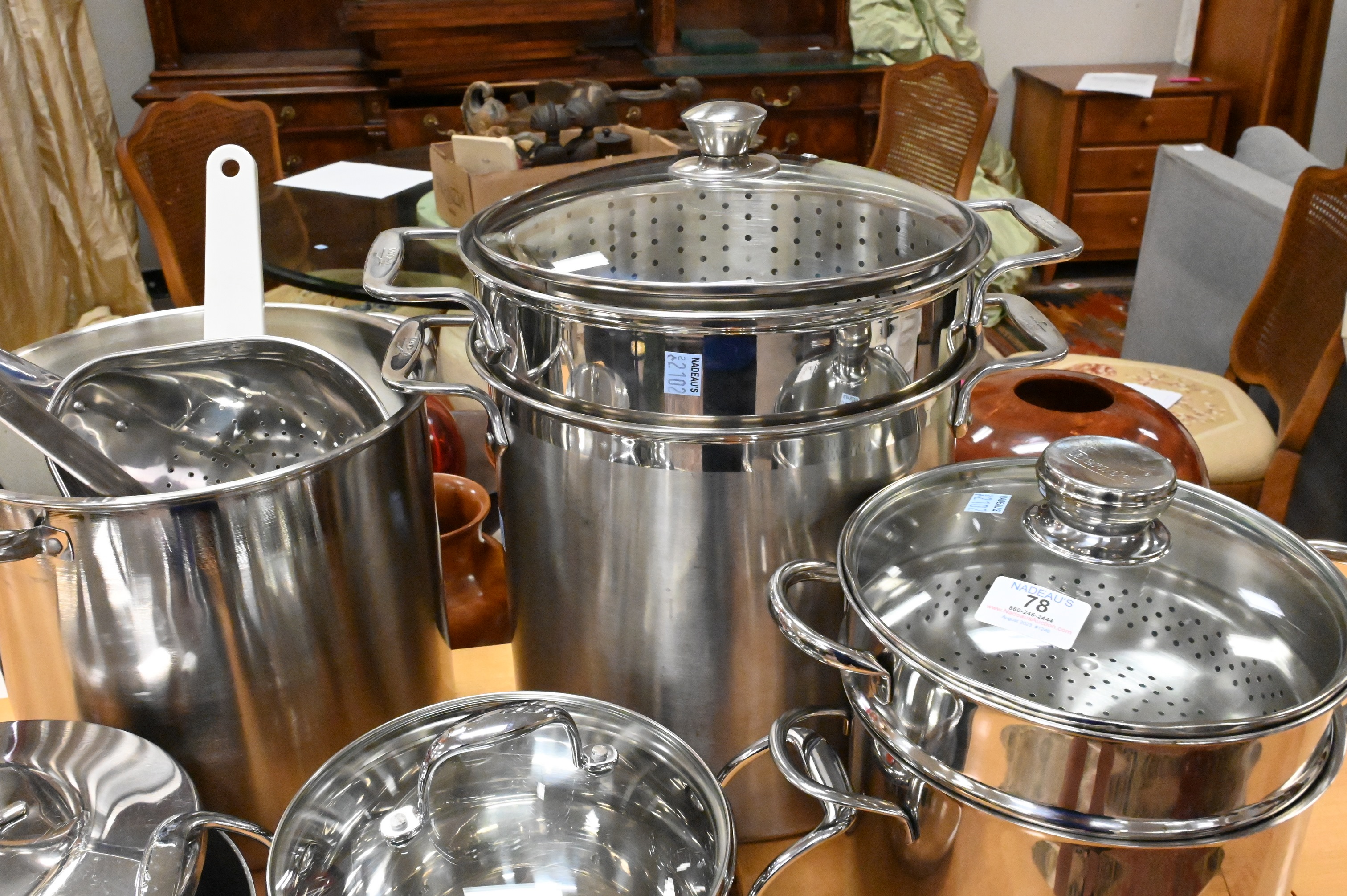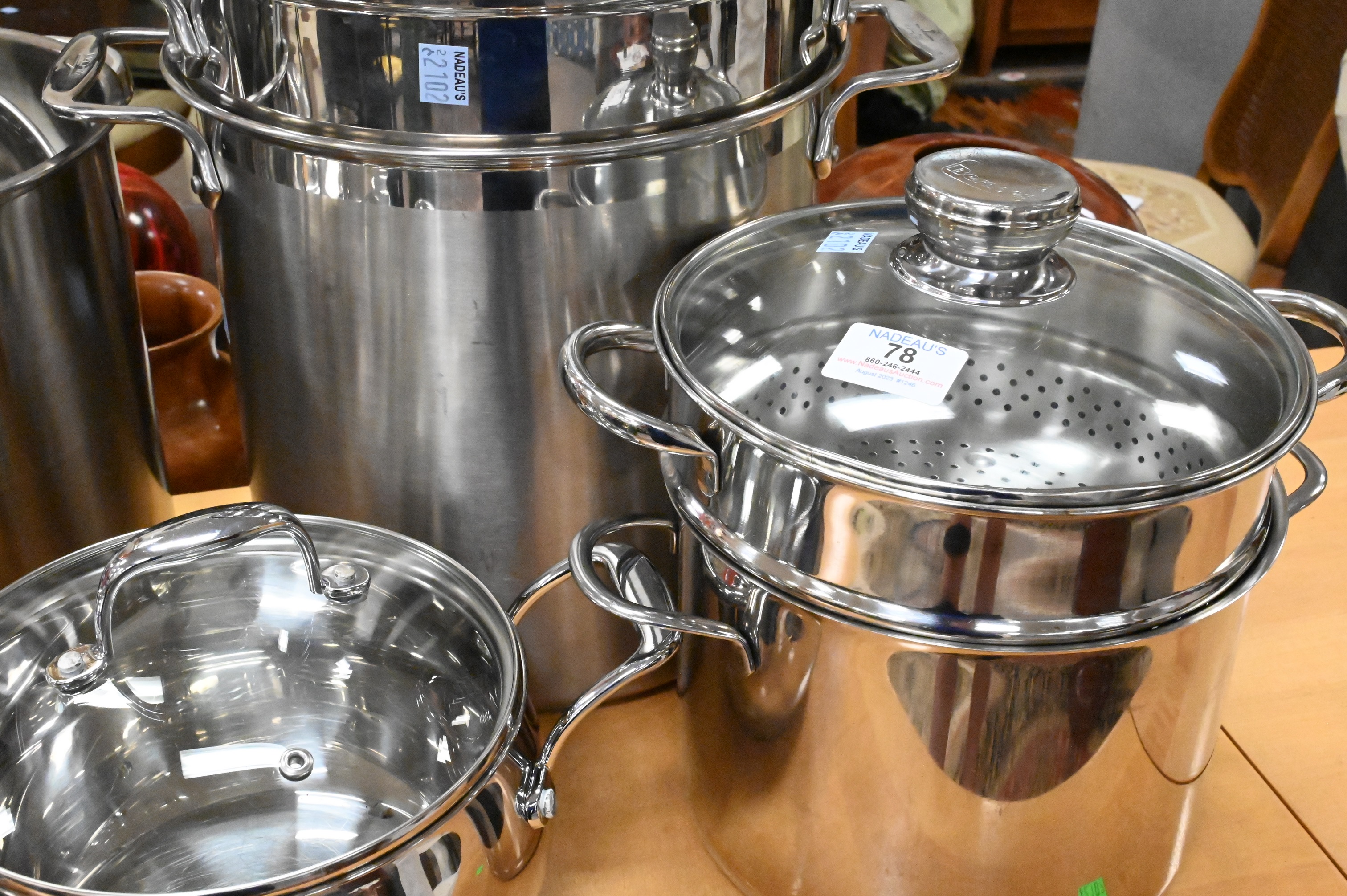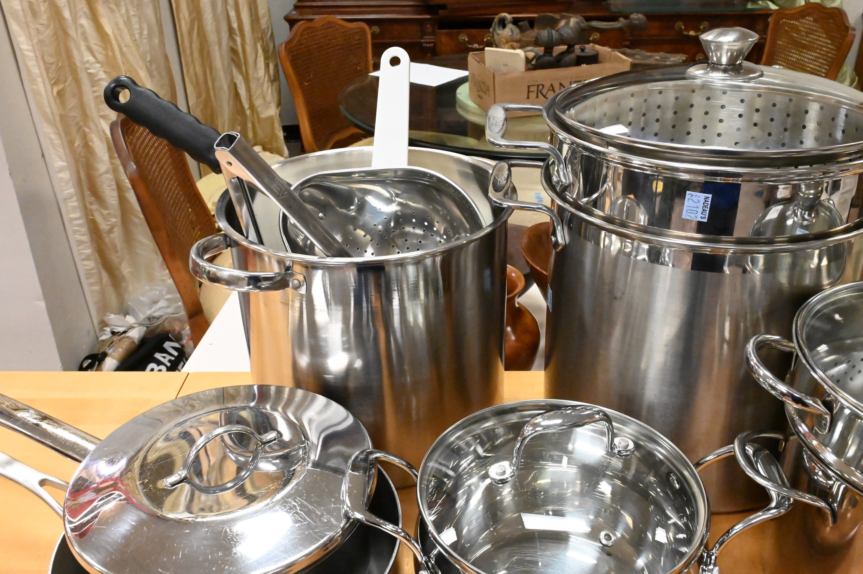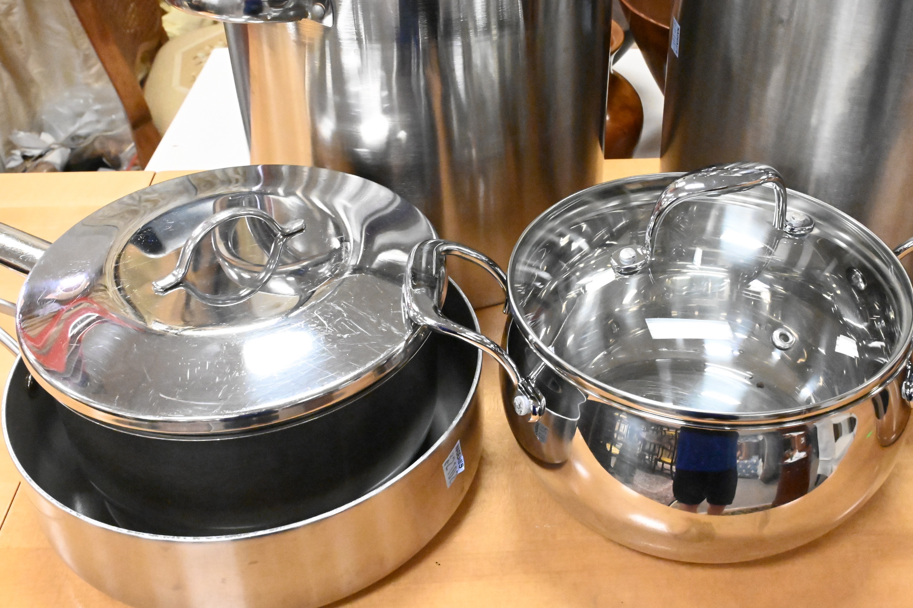 Group of Stainless Steel Pots, Pans Etc.., to include Berndes, All Clad, largest height 10 inches, diameter 11 inches.