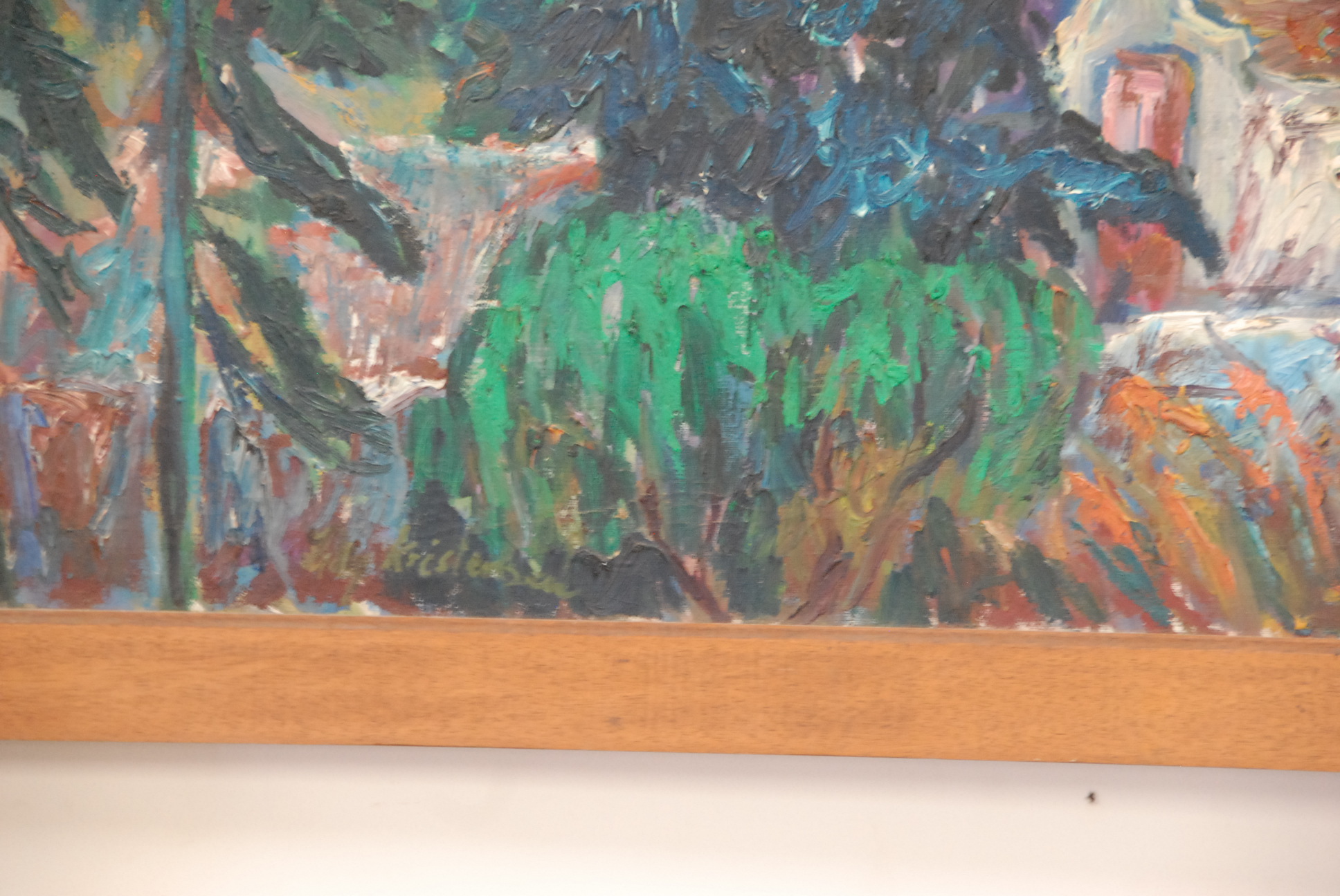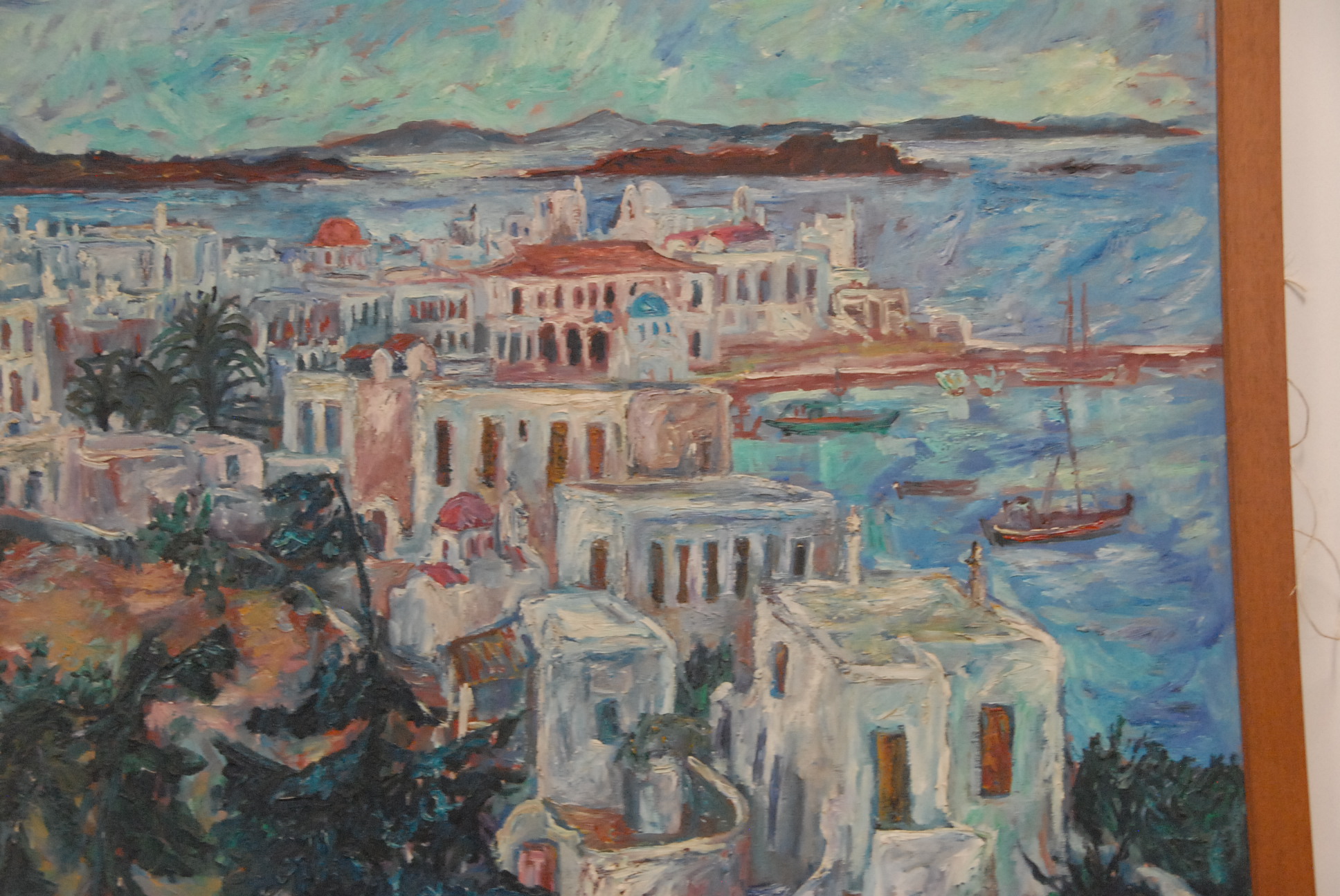 Large oil on canvas of Mediterranean buildings on the shore, signed indistinctly lower left.