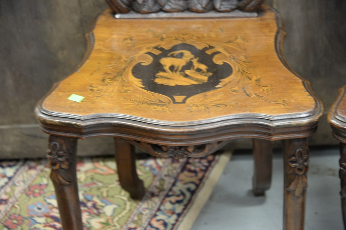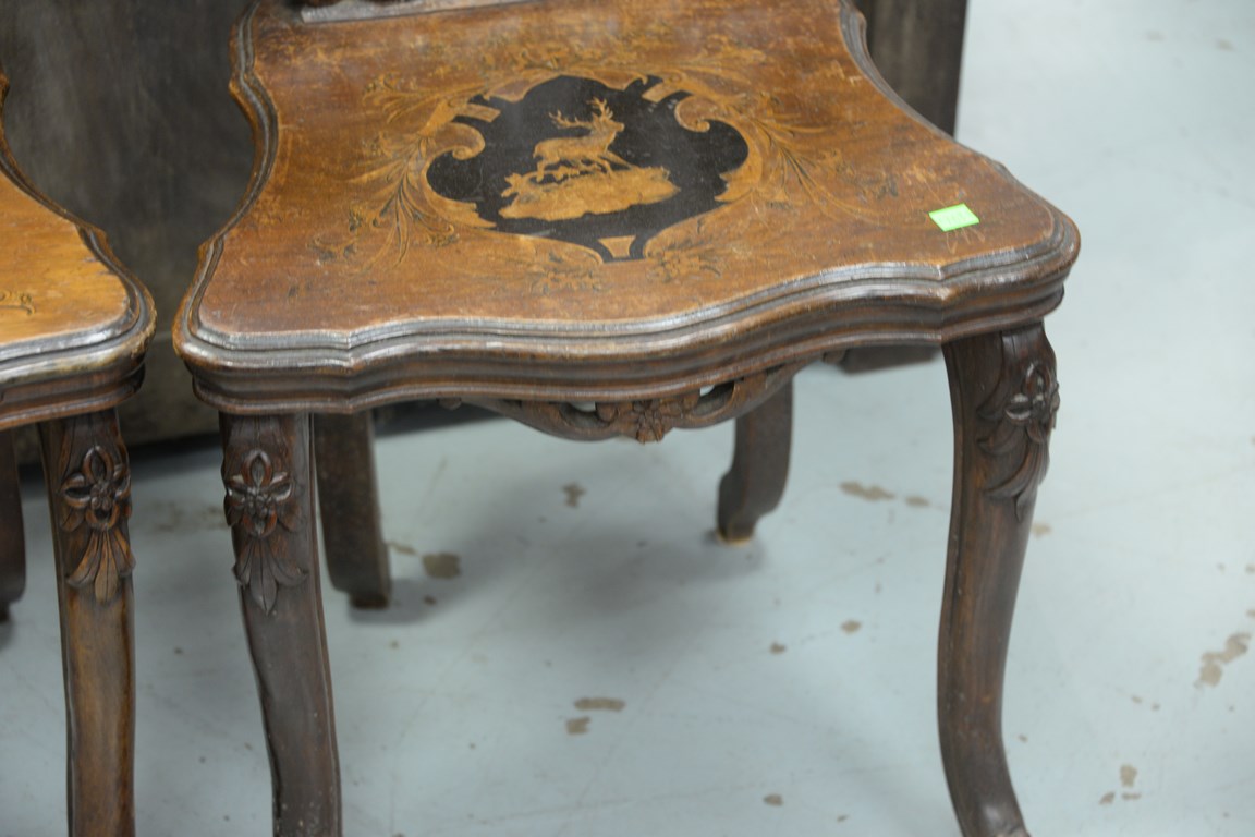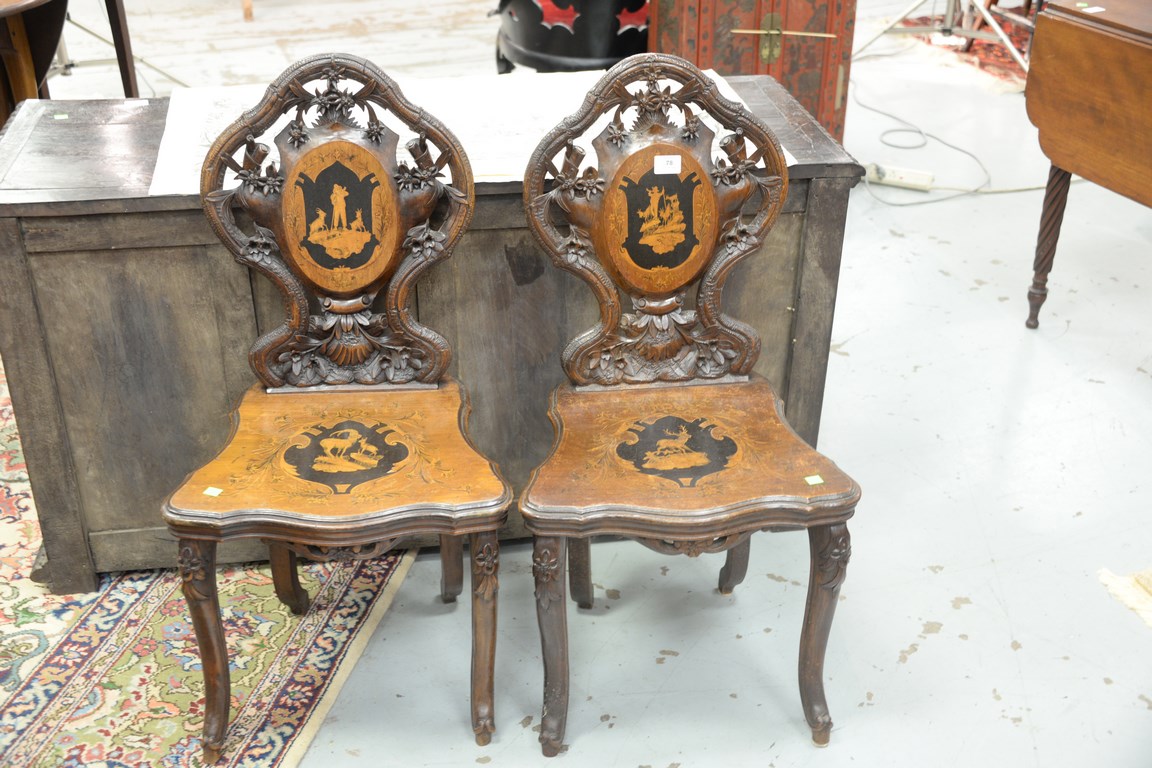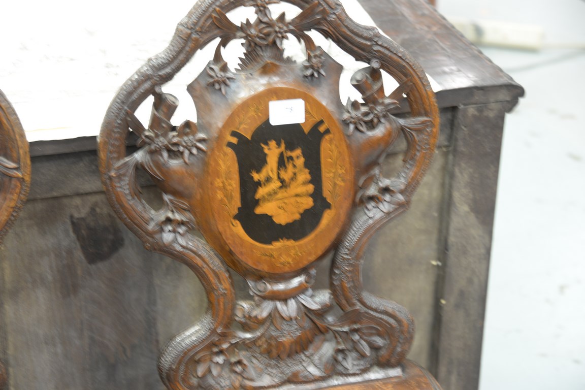Pair of black forest inlaid side chairs, probably late 19th to early 20th century.
