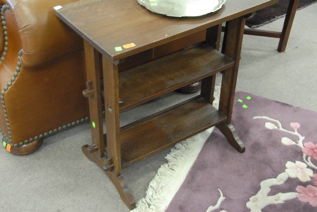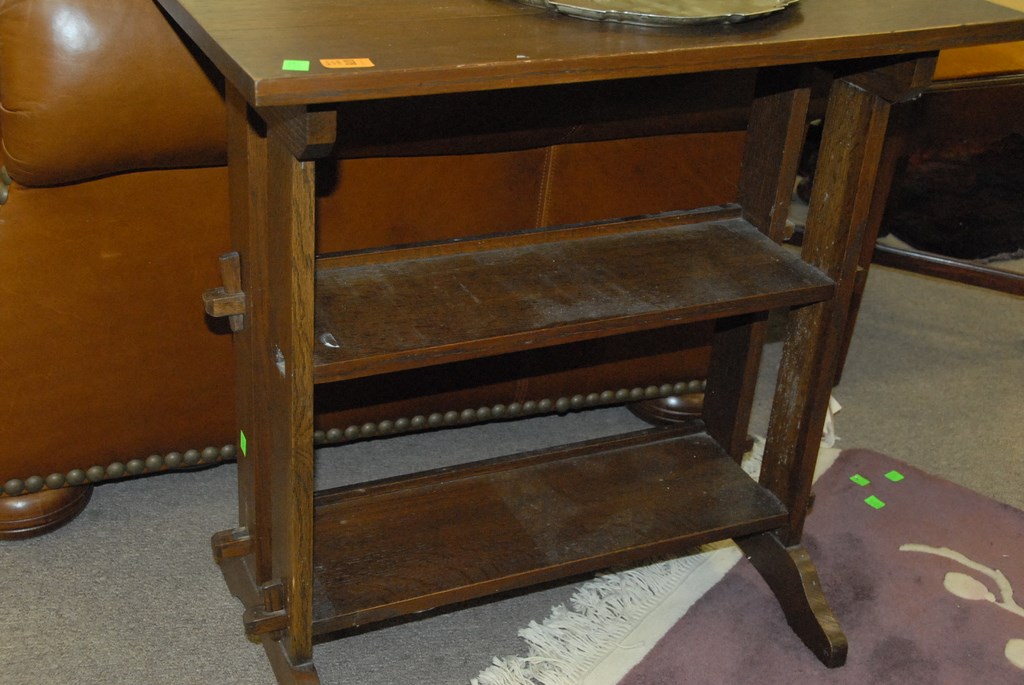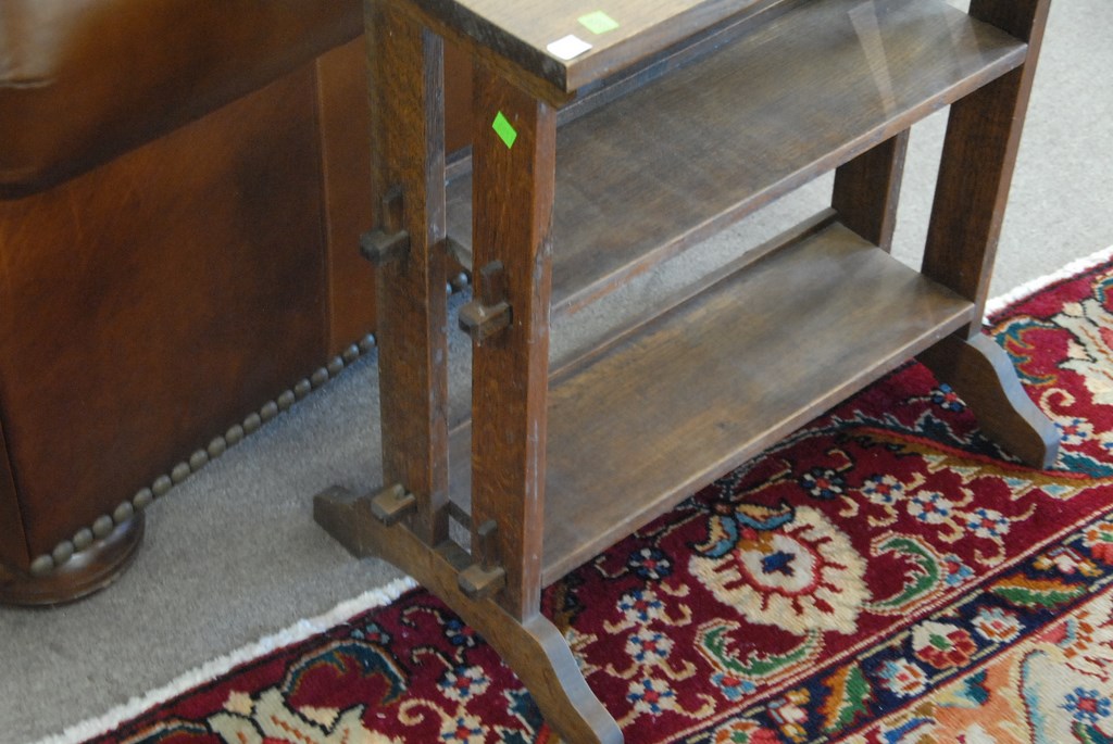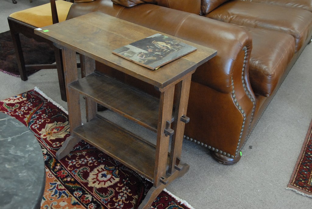 Lot 78: Pair of Roycroft oak book tables with thru tendons, marked with oval brass plaque The Roycrofters East Aurora, N.Y. six pins miss…