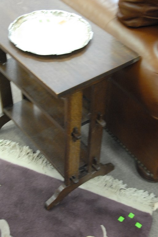 Pair of Roycroft oak book tables with thru tendons, marked with oval brass plaque The Roycrofters East Aurora, N.Y. six pins missing.