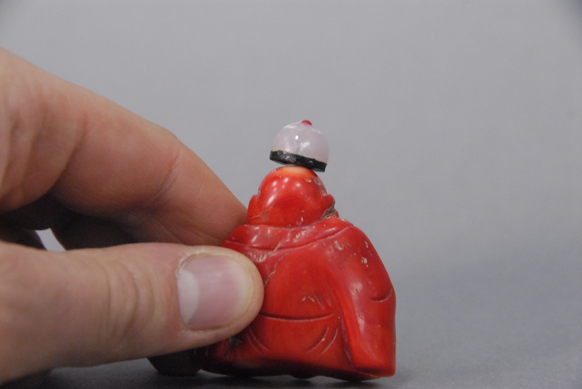 Red coral Buddha snuff bottle replaced top, ht. 2.