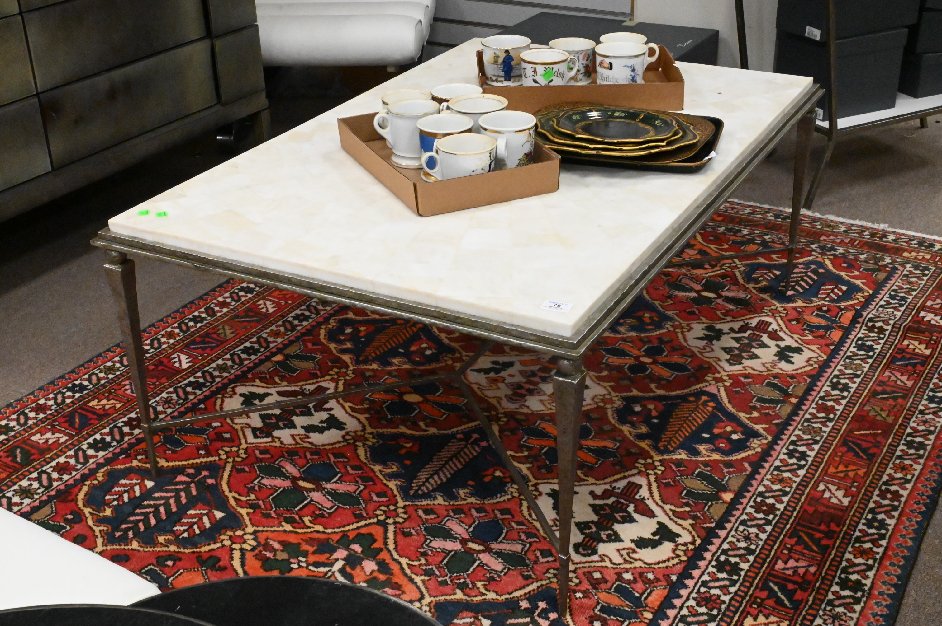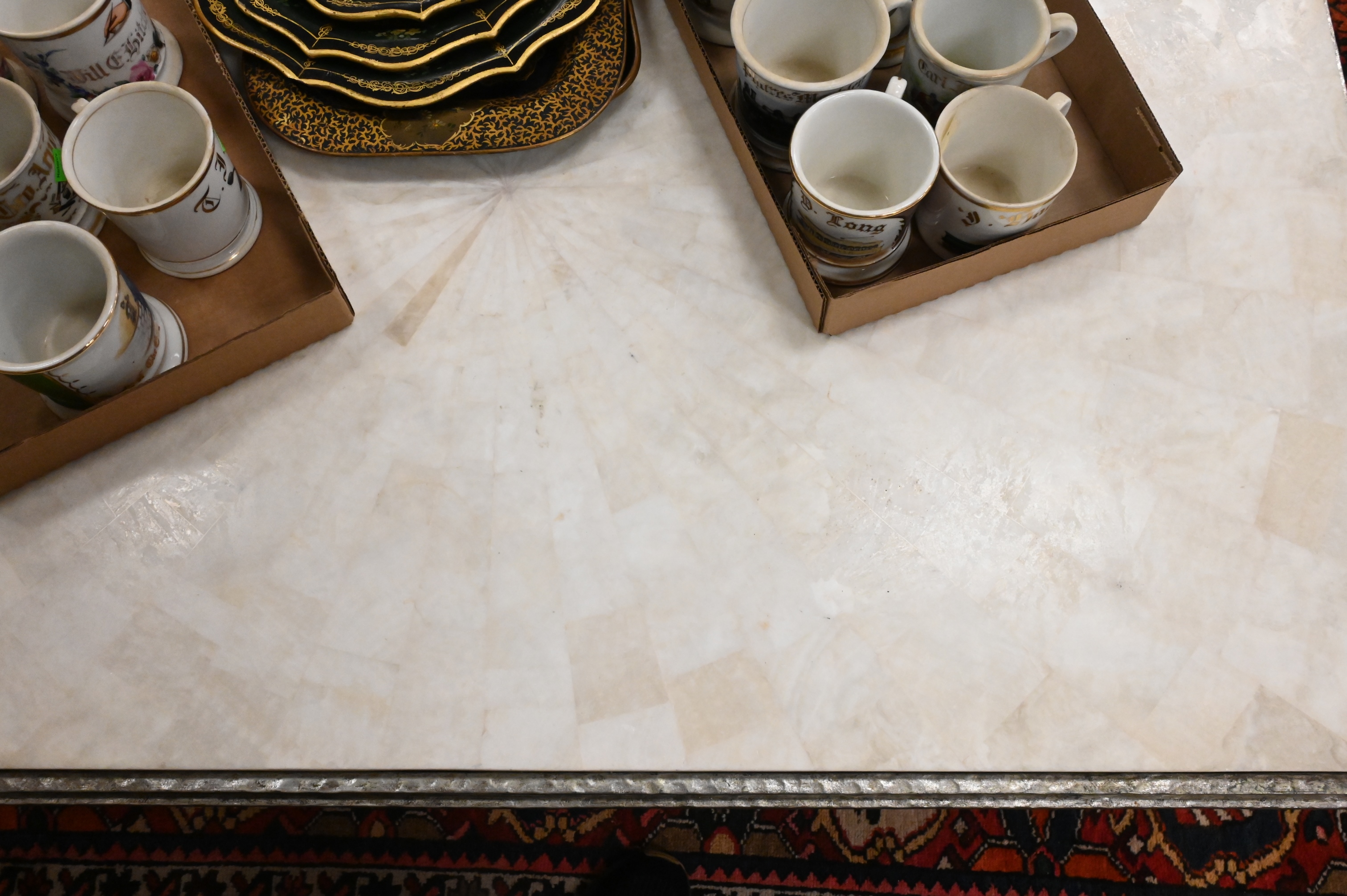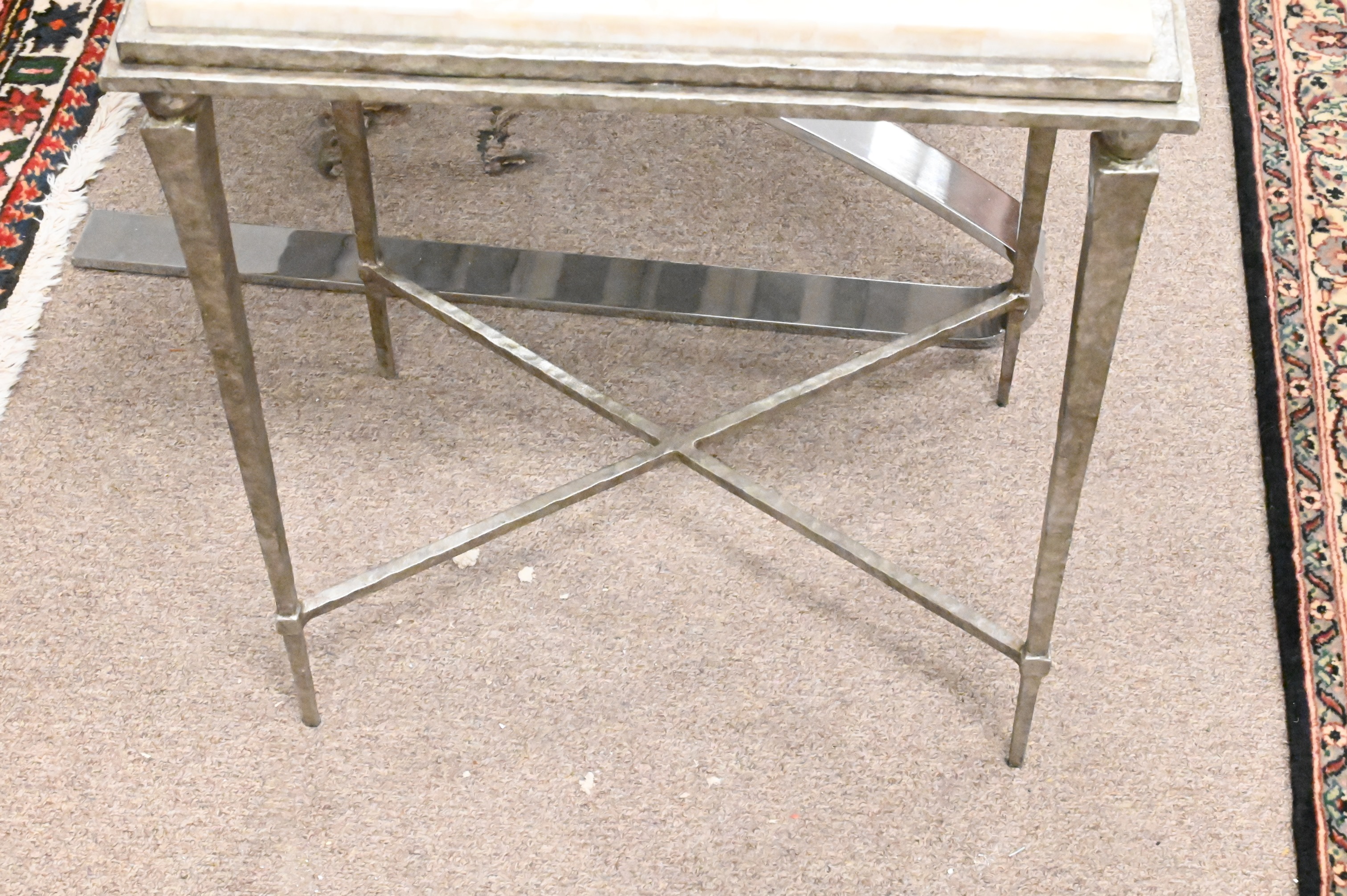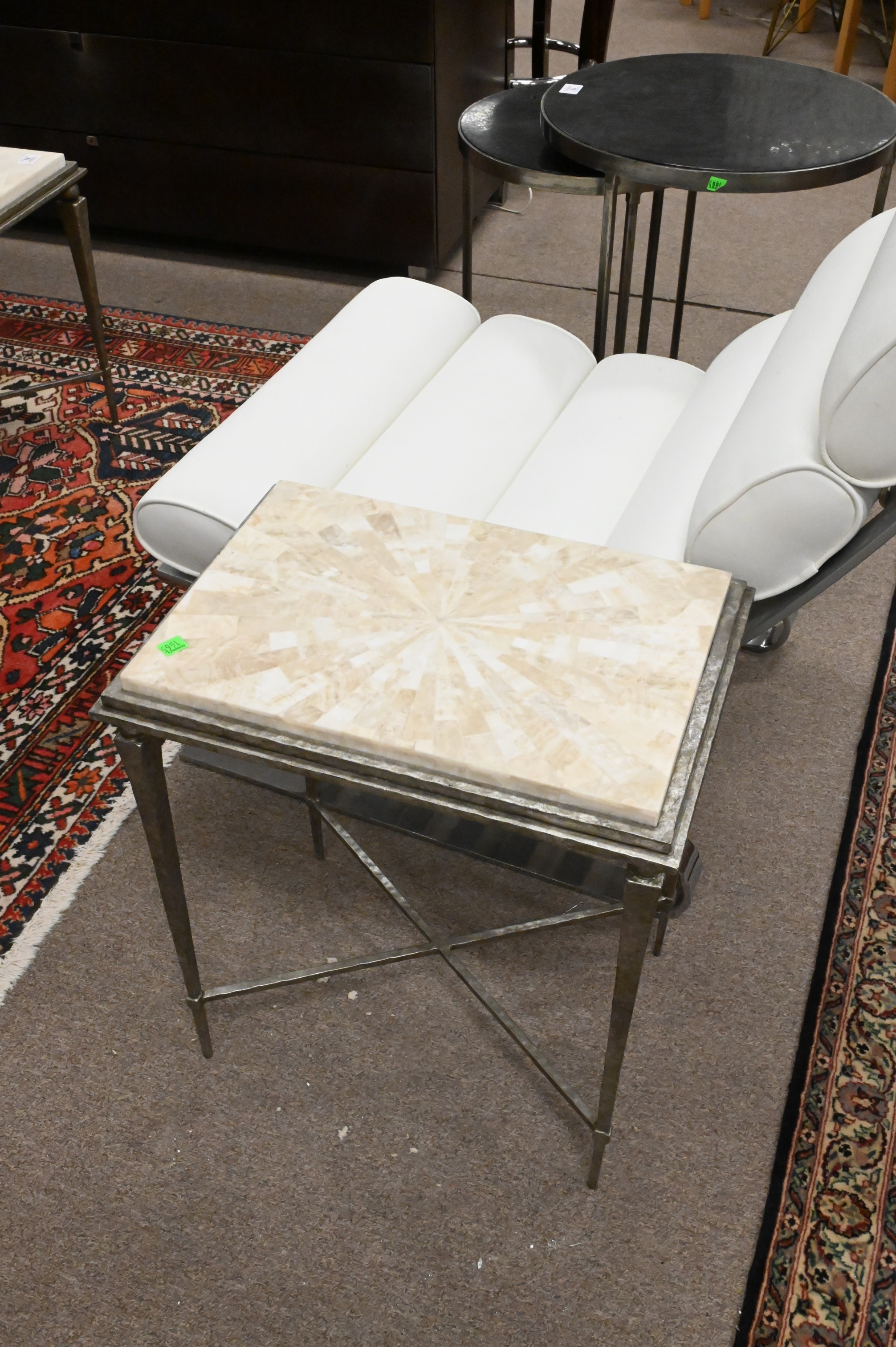 Two Piece Oly Studio Furniture Lot, to include onyx mosaic veneered coffee table, set on “x” stretcher base, along with matching side table, side table height 21 inches, top 11 1/2″ x 16 1/2″ coffee table height 19 inches, top 46 1/2″ x 30 1/2″ Provenance: A Private Collection from Greenwich Connecticut.