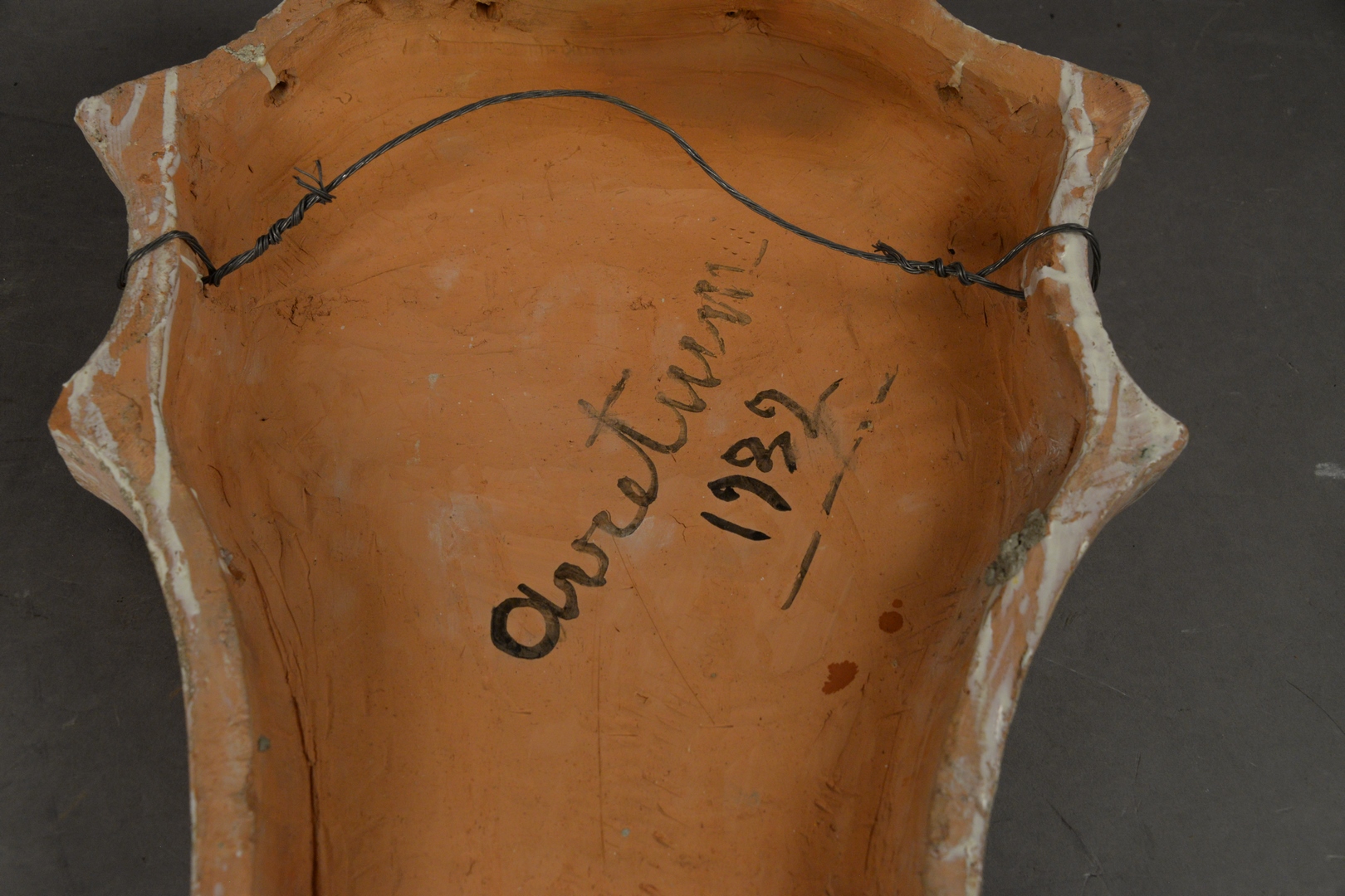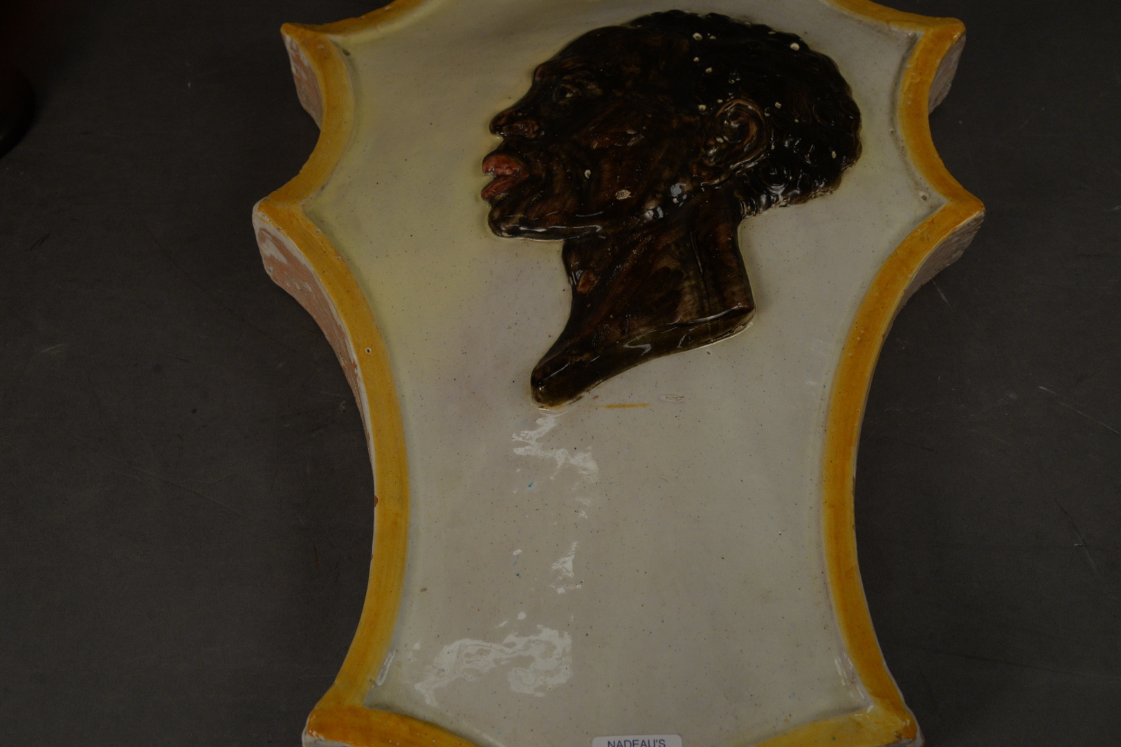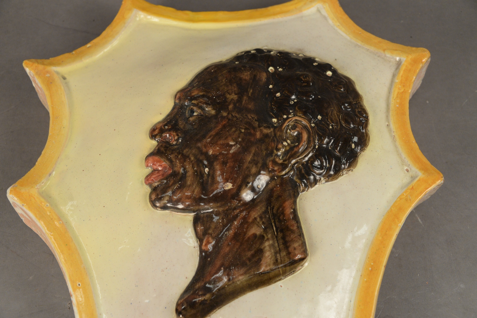 French Majolica Shield, having embossed black man, signed Avret 1932 24 x 17 1/2.