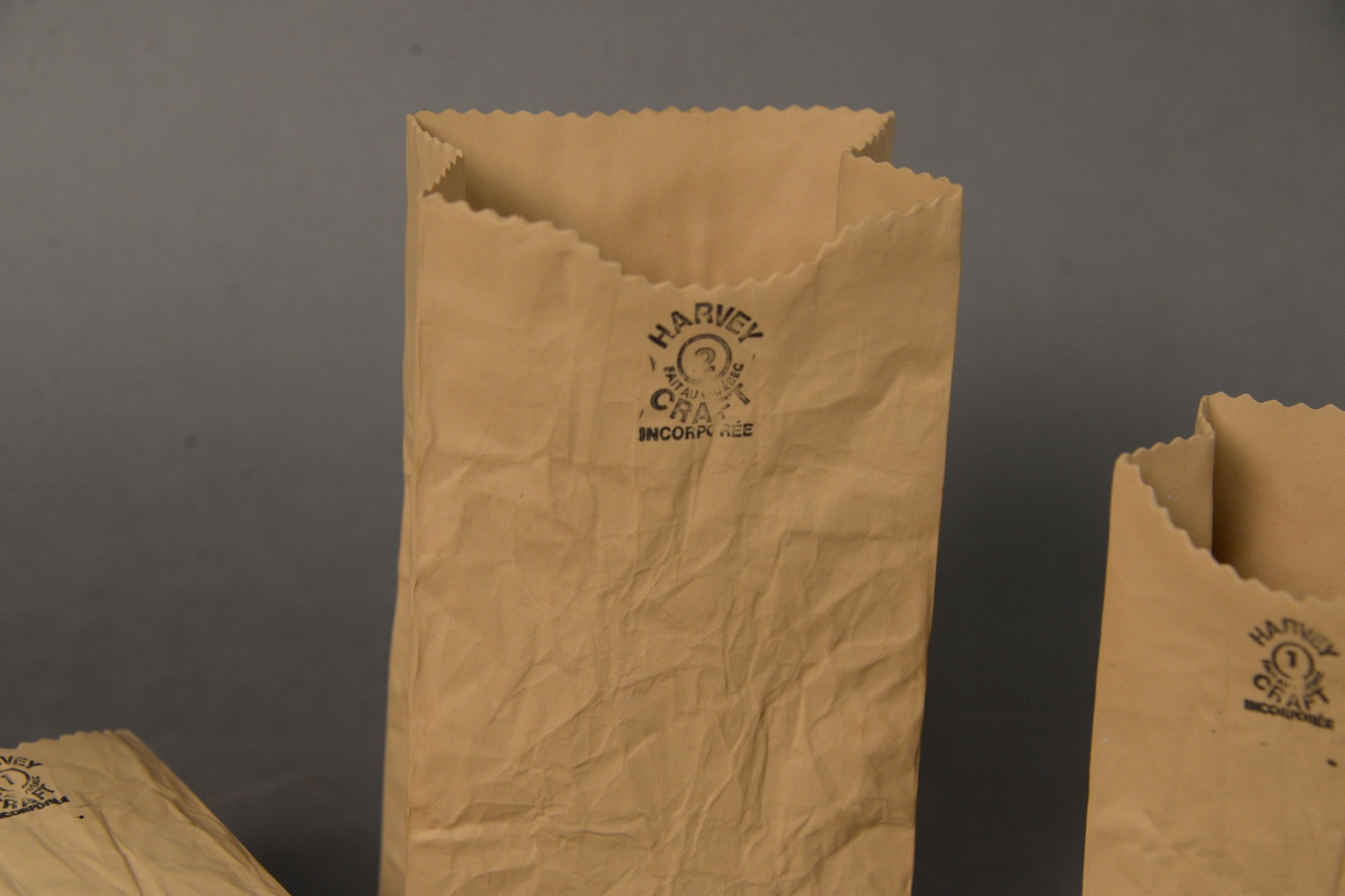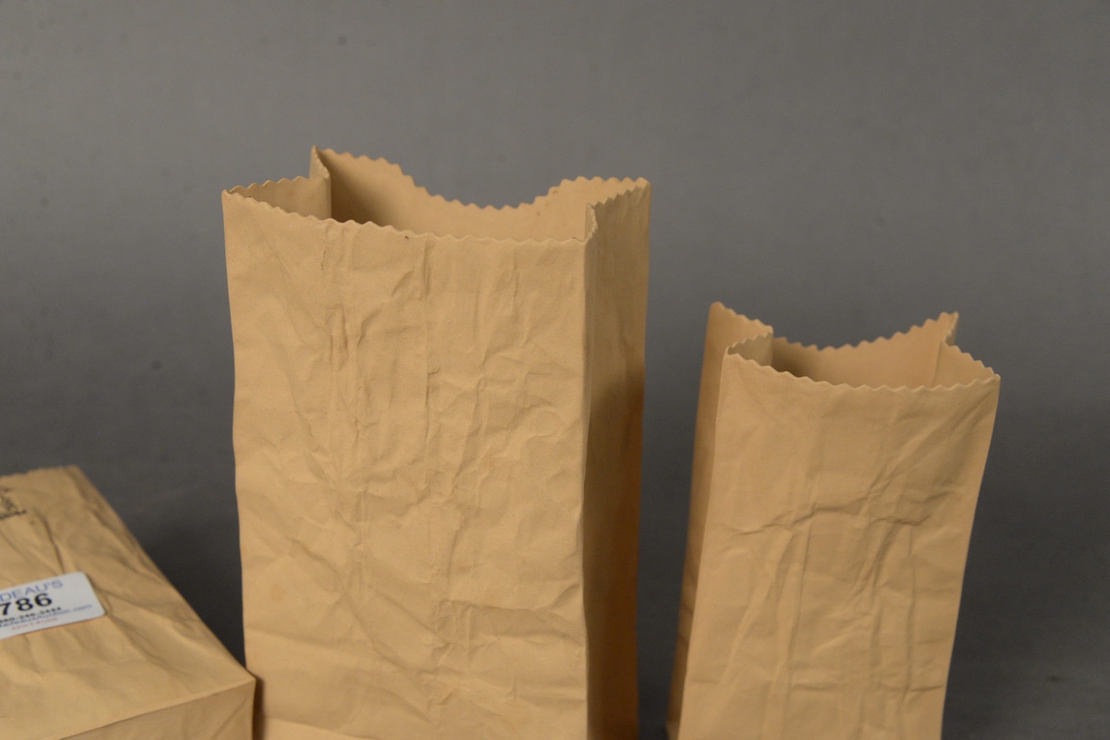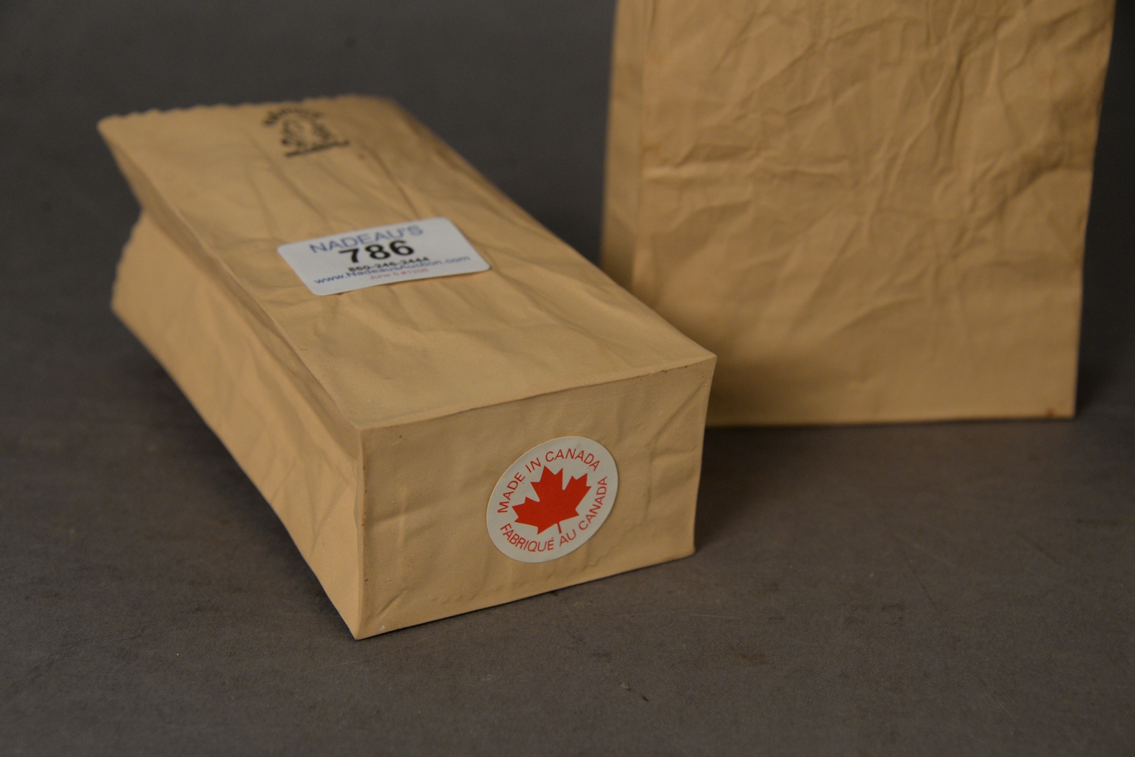 Lot 786: Set of Three Michael Harvey Ceramic Paper Bag Vases, each stamped to the upper rim, height 7 1/2 inches, width 4 inches, depth 2 1/4…