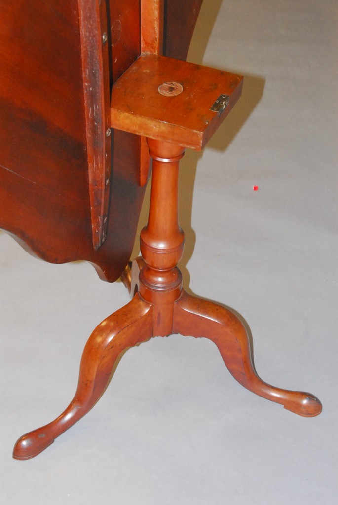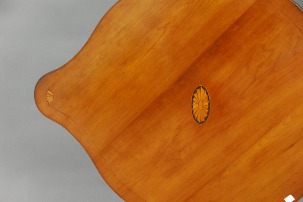 Lot 789: Cherry tip table with shaped top and fan and panel inlays on urn carved shaft on tripod base, 18th century