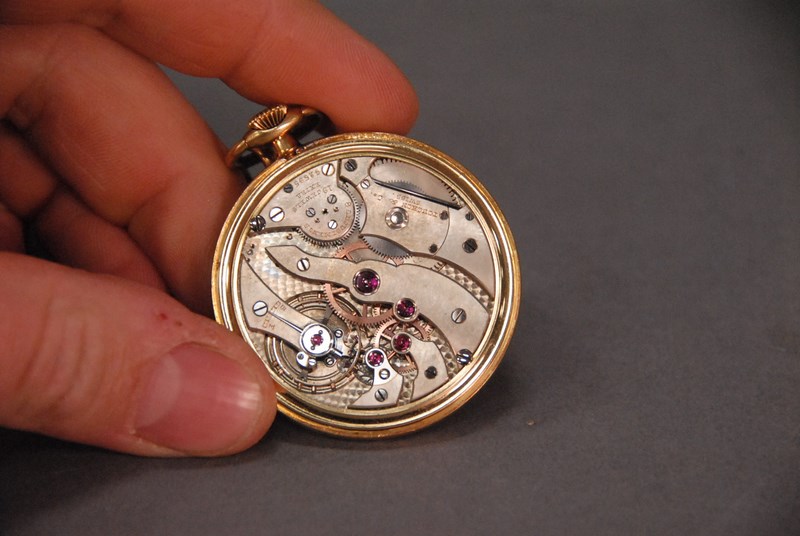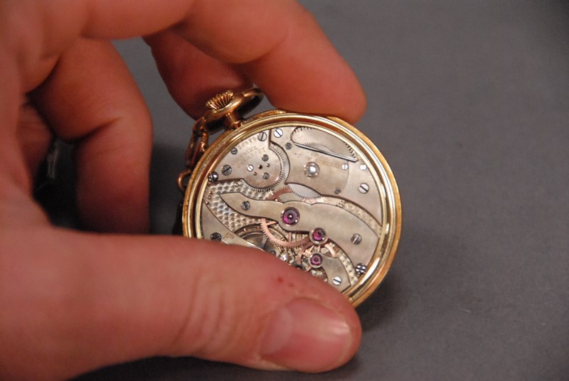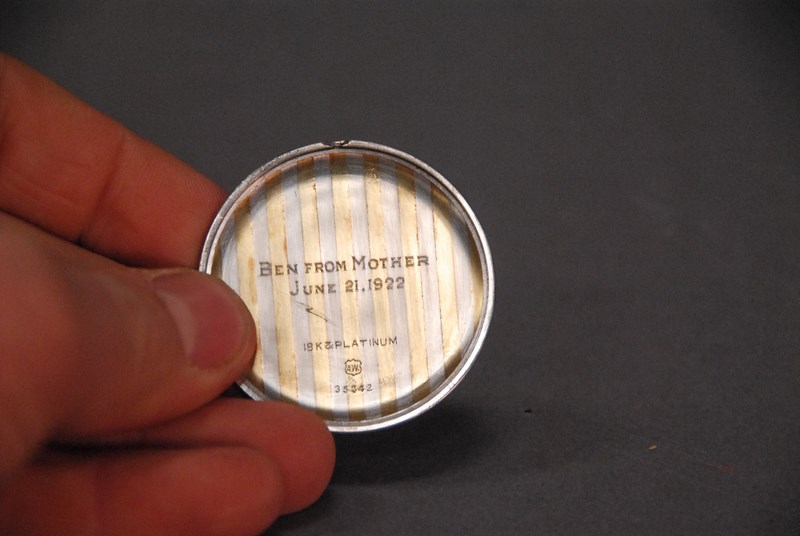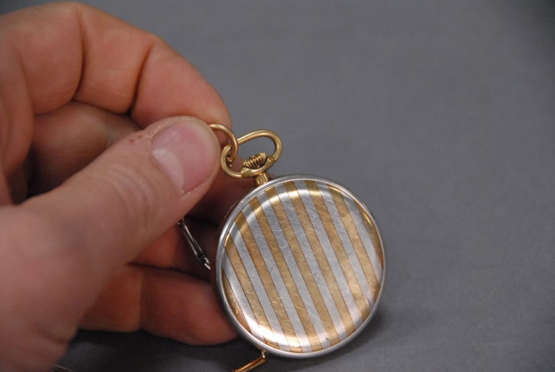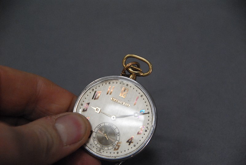 Lot 78A: Platinum and 18K gold Touchon & Co. Swiss pocket watch with open face and two color platinum and 14K gold chain, watch face marked Tiffany & Co. in Tiffany box. back of watch weight: 16.6 grams chain weight: 16 grams total watch weight: 54.4 grams