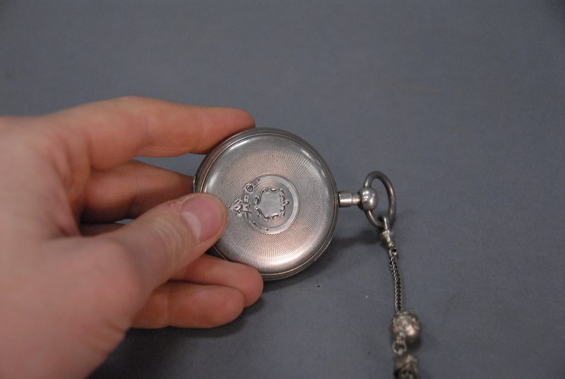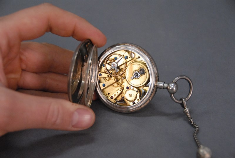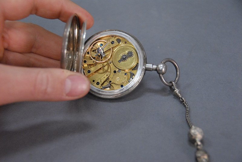 Lot 78D: Silver repeater pocket watch, key wind with chain, marked JW.