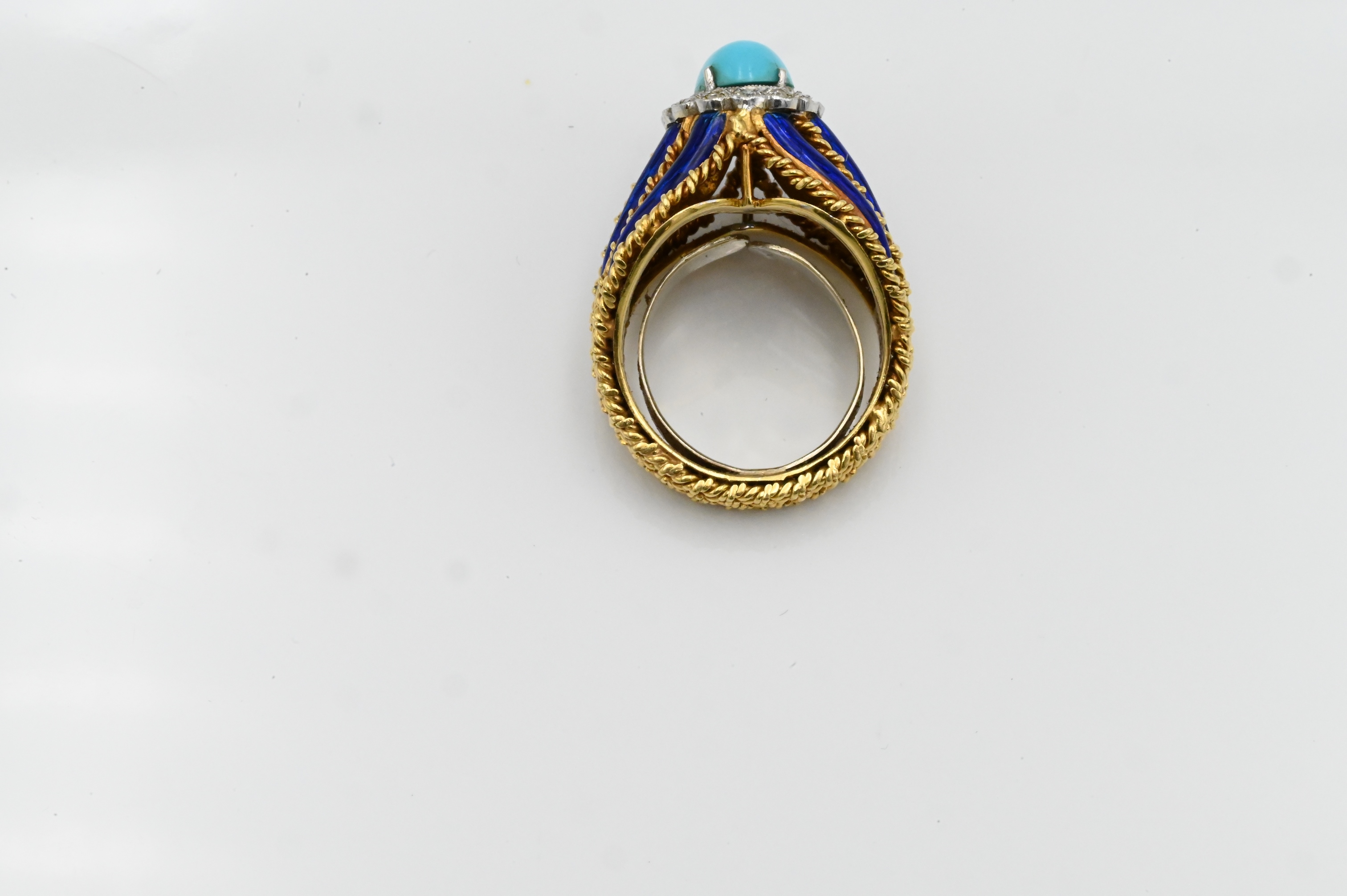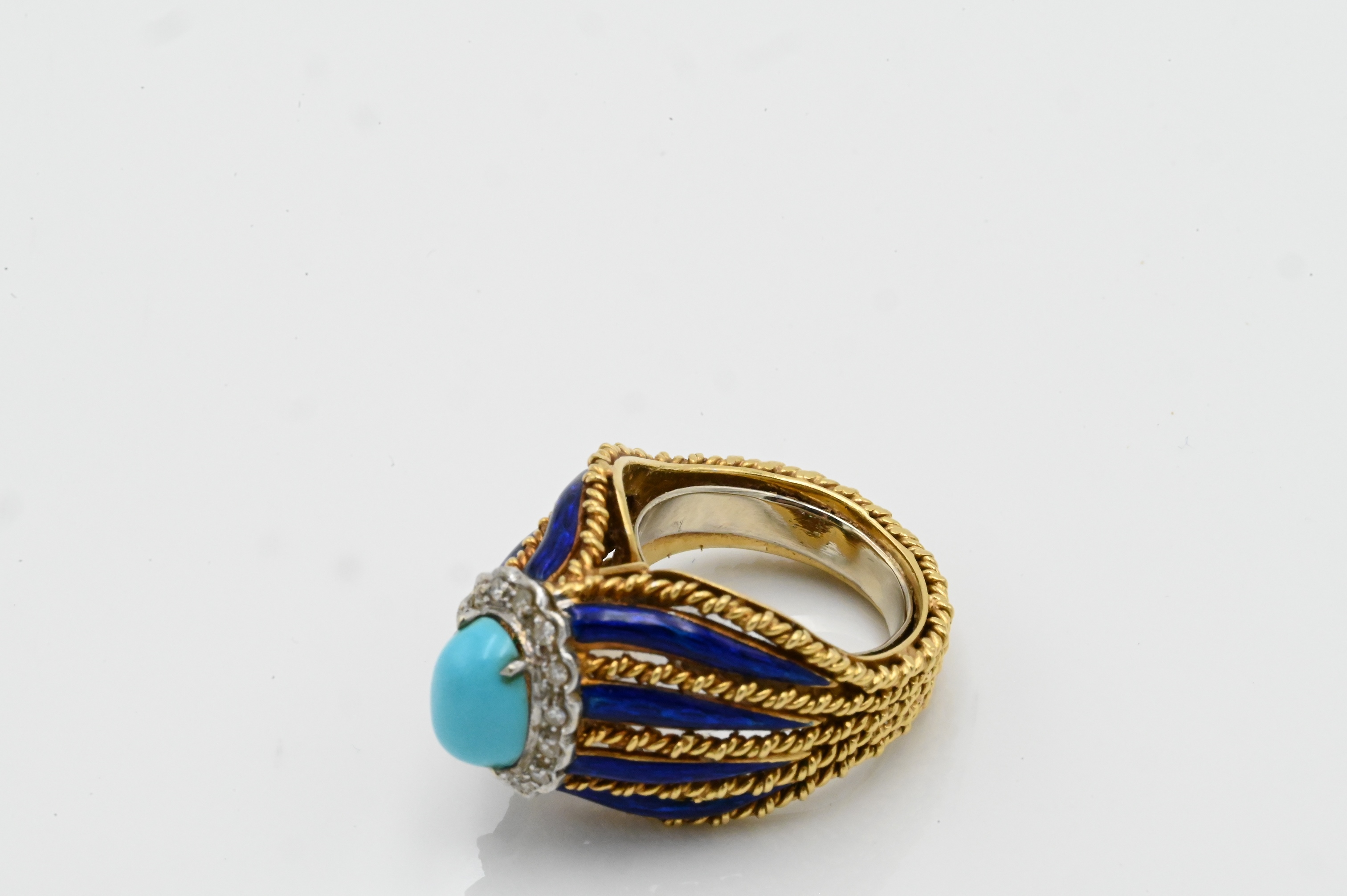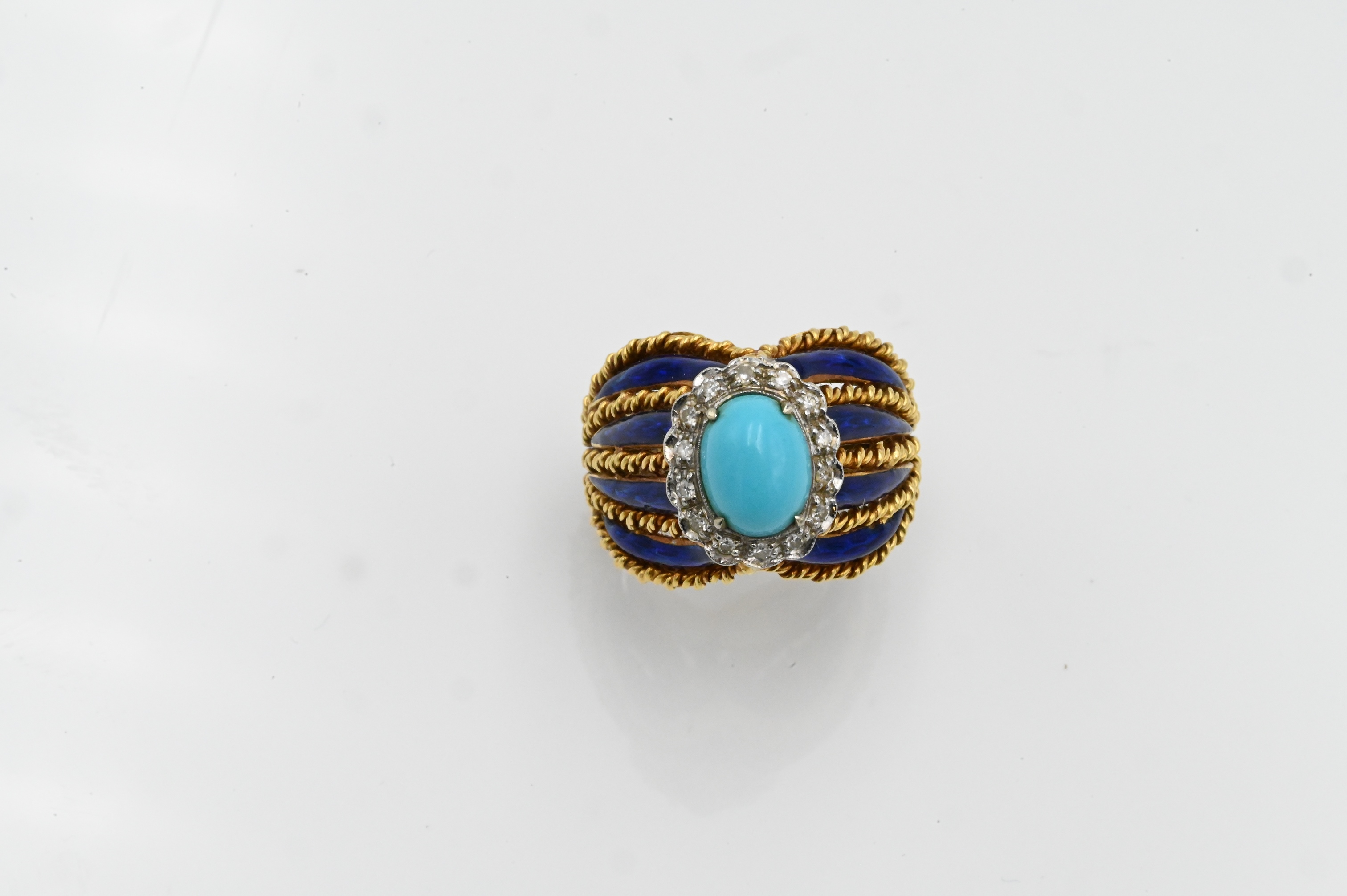 set with center oval turquoise, surrounded by diamonds mounted with blue enameling in spiral panel borders