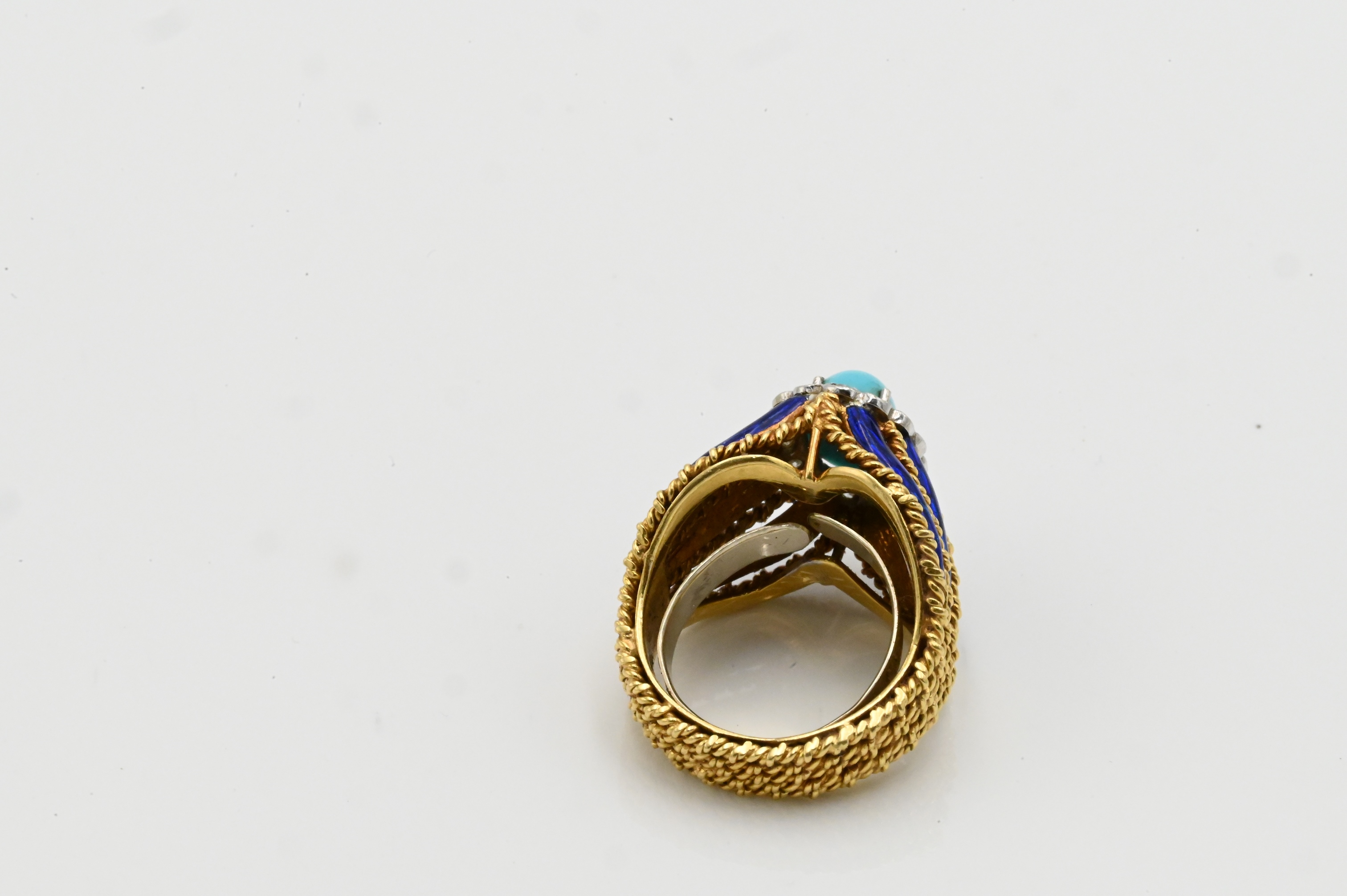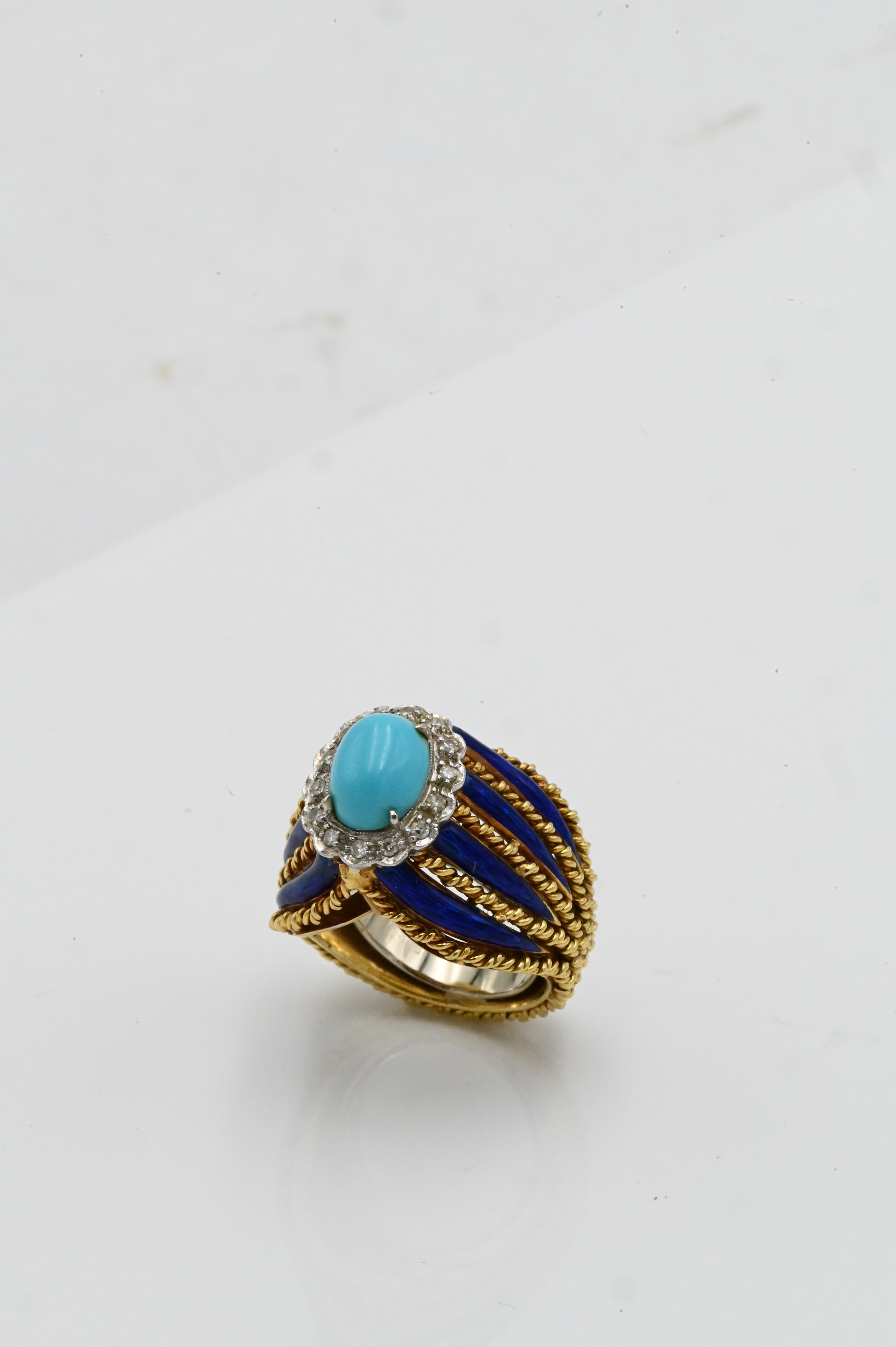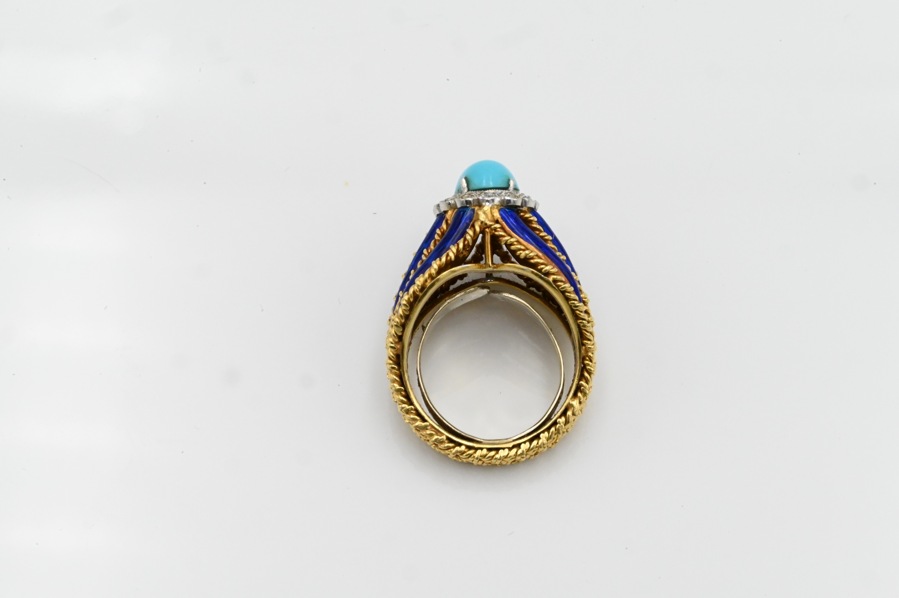 set with center oval turquoise, surrounded by diamonds mounted with blue enameling in spiral panel borders