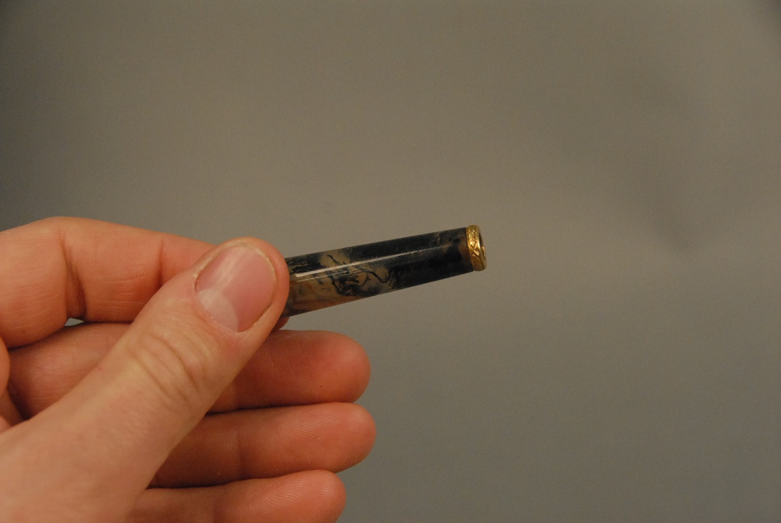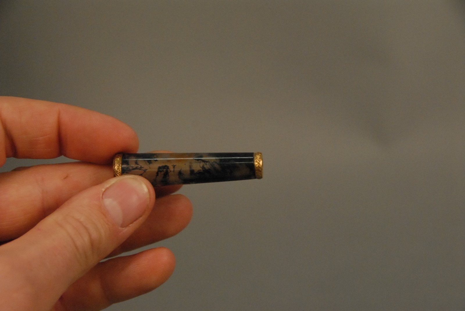 Lot 79: Agate cigarette holder with gold ends in fitted leather felt lined case. Case marked Tusten 5th Ave., N.Y.